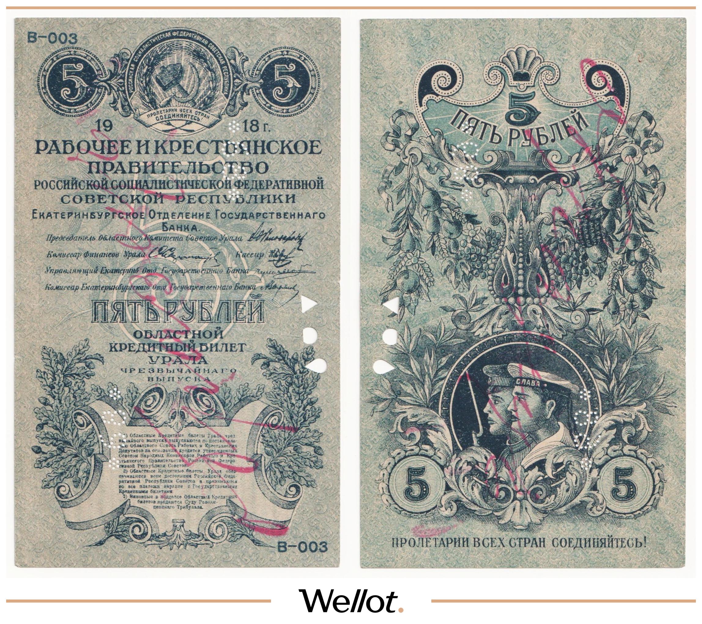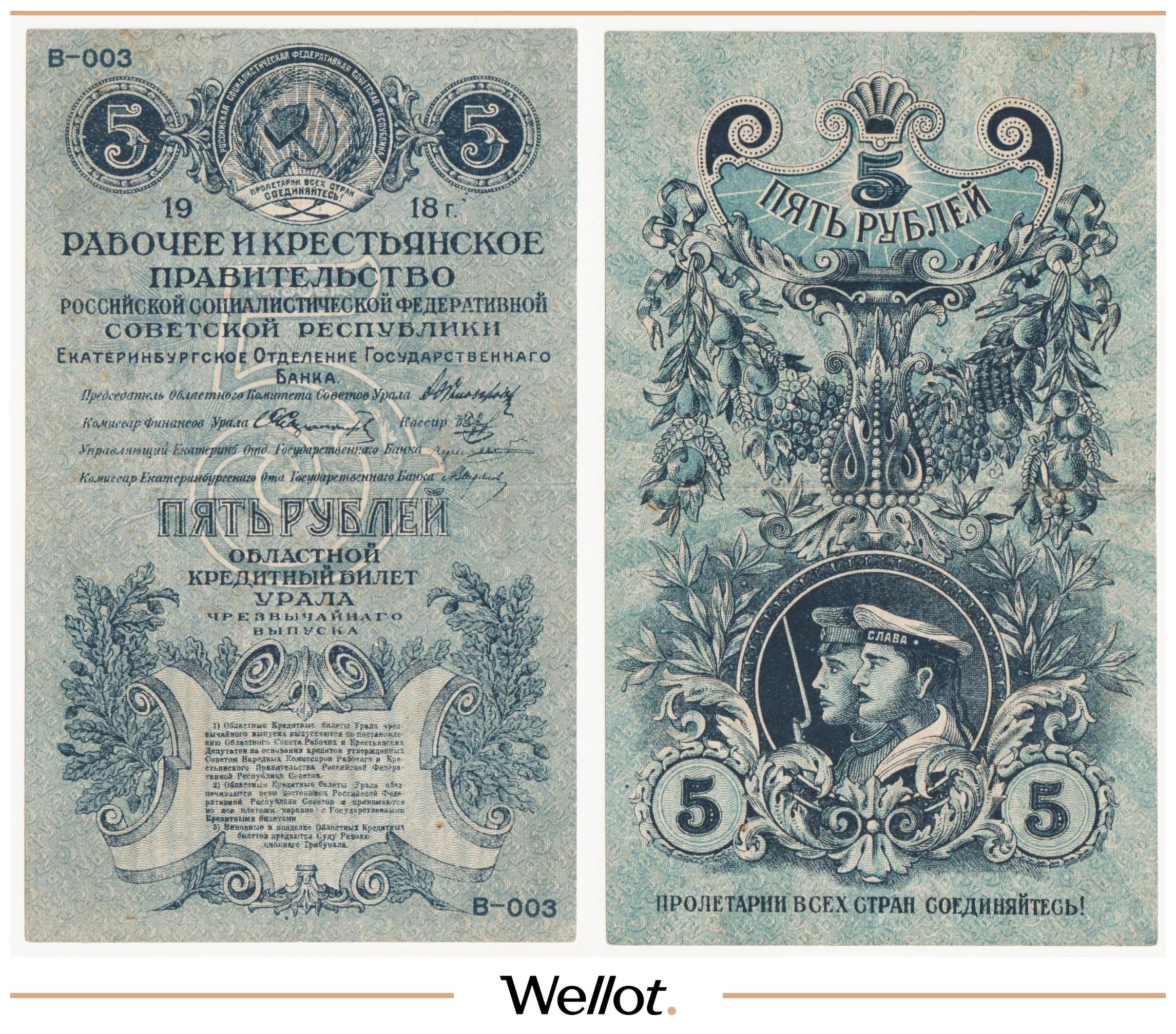 Банкнота ярко отражает стиль и дух начала XX века. На её оборотной стороне изображены два ключевых участника революции — матрос и солдат. Орнаменты и цветовая гамма характерны для революционного периода, отличаясь простыми, но выразительными художественными решениями. Особое значение имеют элементы в виде серпа и молота, символизирующие единство рабочего класса и крестьянства. Банкнота служила не только средством обращения, но и инструментом идеологической пропаганды, доносящим революционные идеи до широких масс. Превосходная сохранность.