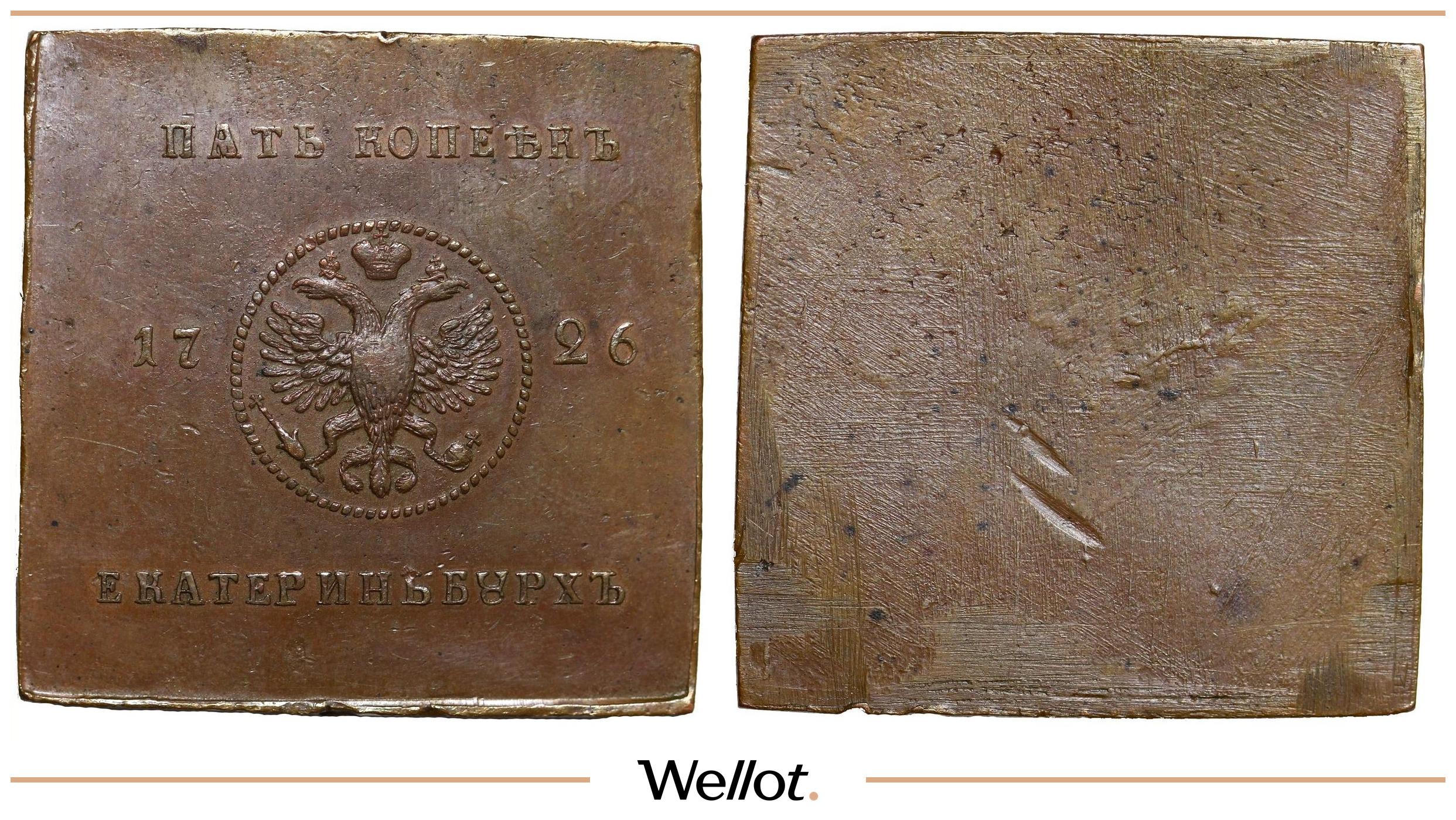 Биткин# 352 (R2, R3). 80,60 г. Кабинетная патина. Очень редкие. После смерти Петра I в феврале 1725 года в государстве осталось много нерешённых вопросов, включая финансовые проблемы, так как казна испытывала значительный дефицит. В то же время на Урале ежегодно увеличивалась добыча красной меди, и её количество даже превышало потребности. Финансовые советники Екатерины I предложили полностью заменить серебряные монеты медными, опираясь на опыт Швеции. Это позволило бы снизить расходы казны на покупку драгоценных металлов, тем более что уральская медь была значительно дешевле, чем закупаемая из Венгрии и Швеции. В 1726 году начали изготовление медных плат. Сегодня эти денежные знаки кажутся весьма необычными и представляют большой интерес для коллекционеров.
