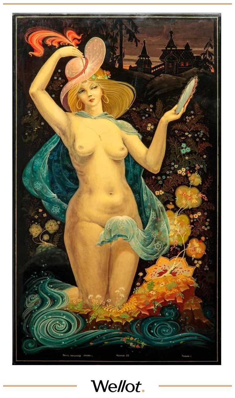 Большое лаковое панно, 45*26 см. Автор — художник холуйских мастерских В. Зимин. Лак. Папье маше, сусальное золото.