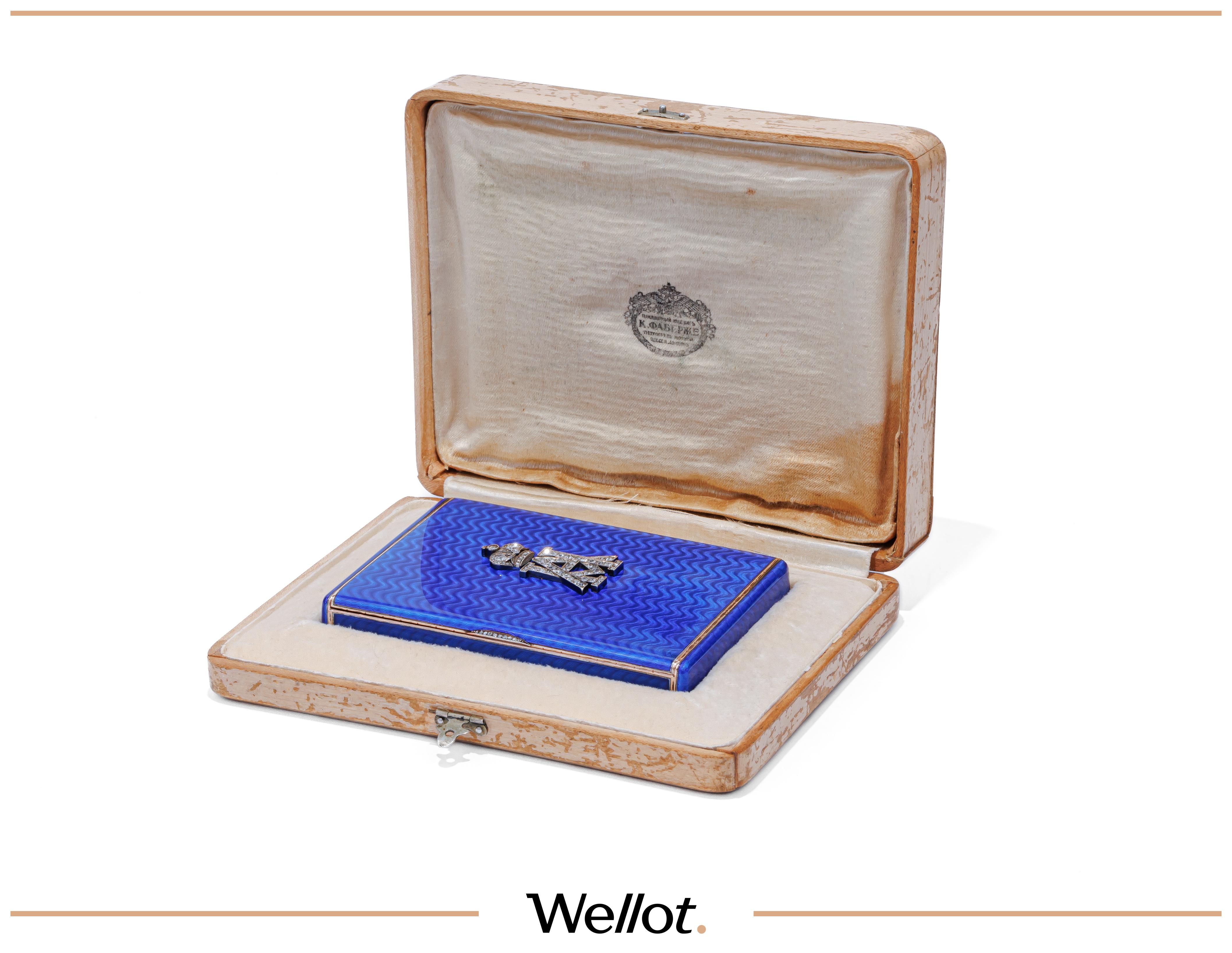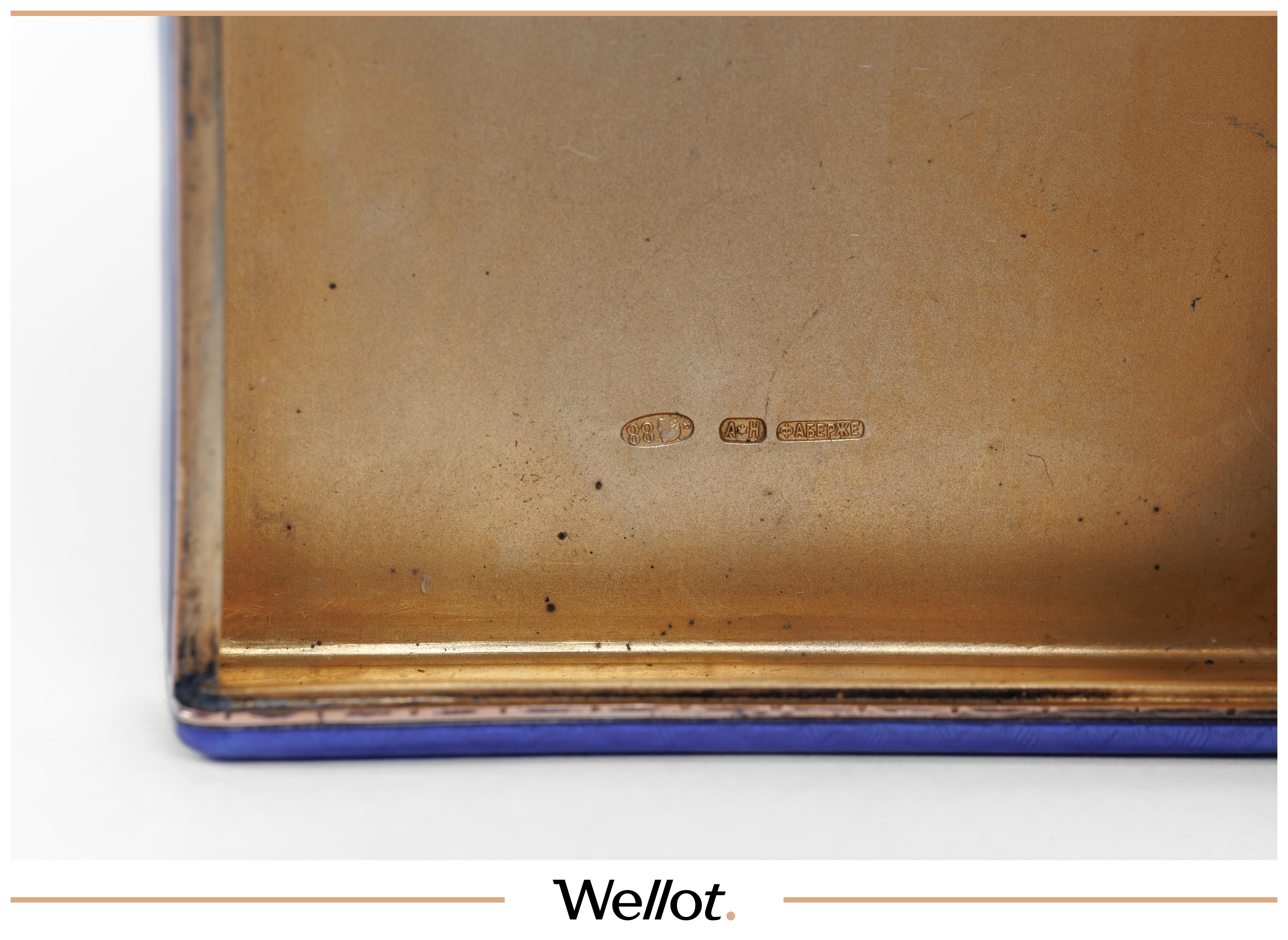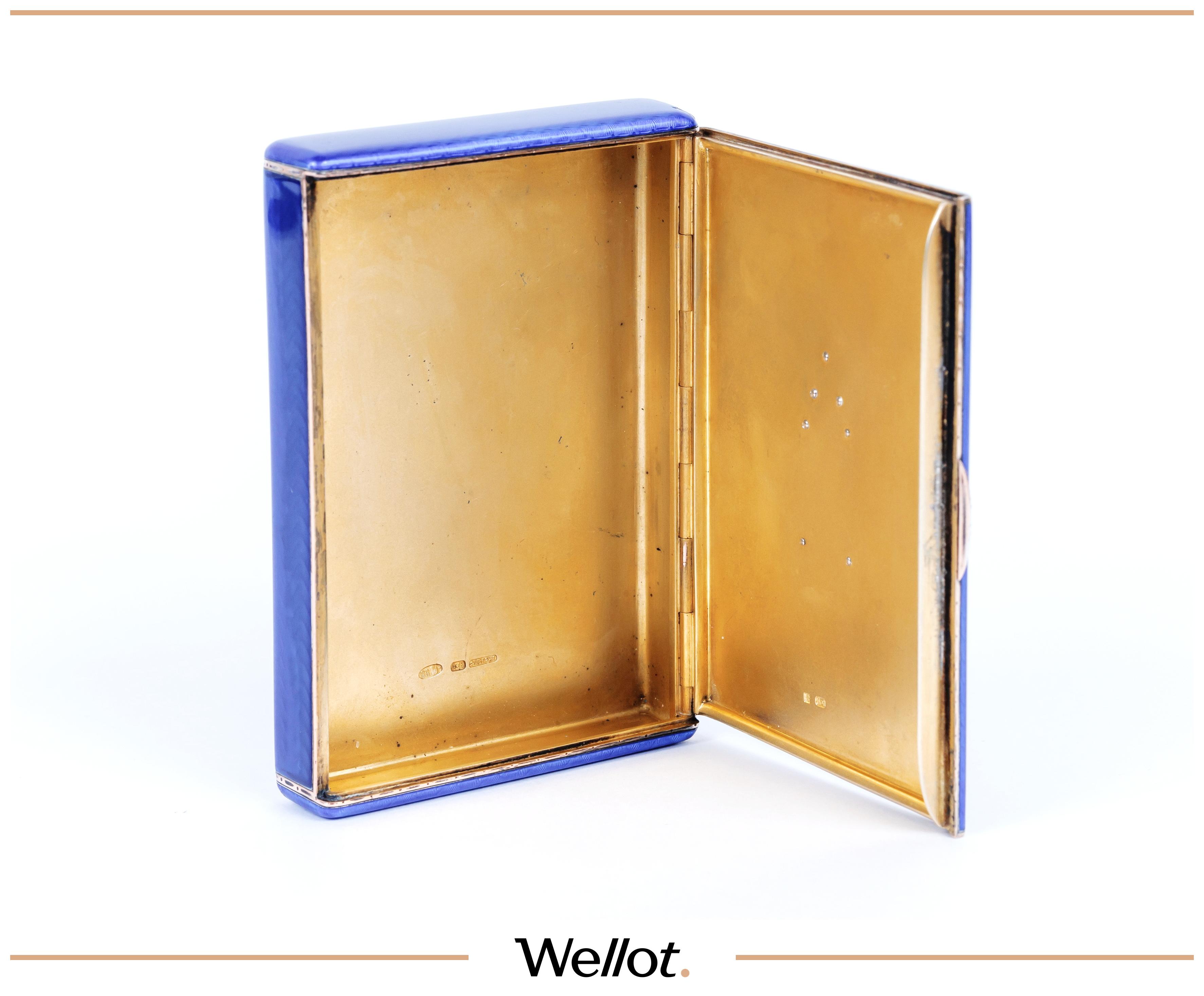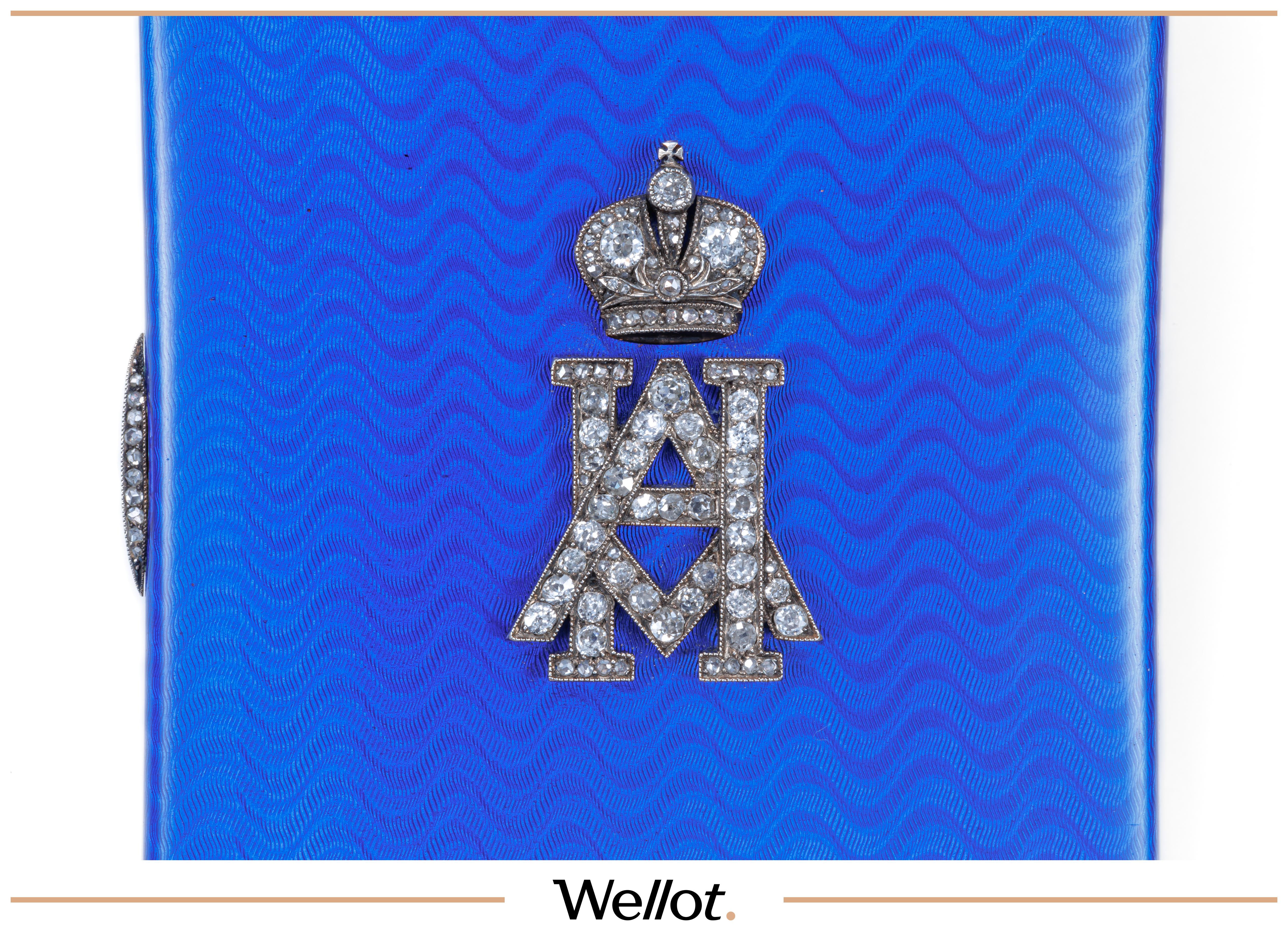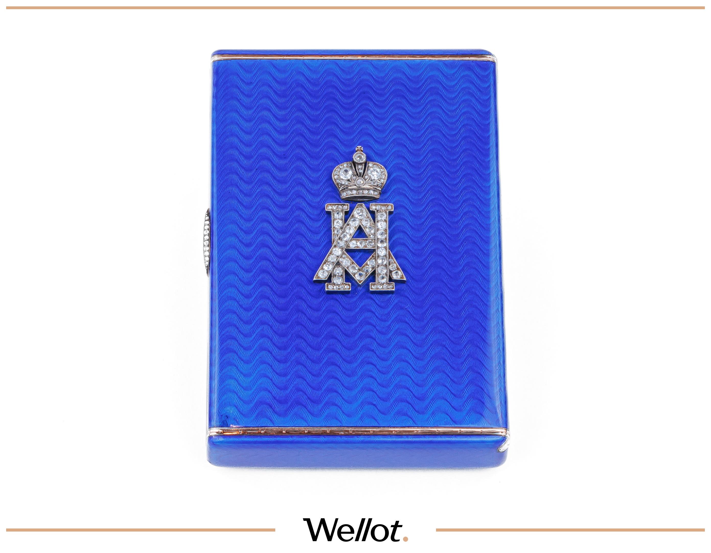 Белый металл, золочение, темно-голубая эмаль, бриллианты, алмазы огранки «роза». Размеры: высота 15 мм, ширина 90 мм, длина 63 мм. Клейма: фирмы «Фаберже»; мастера «А*Н»; тройник Санкт-Петербургского окружного пробирного управления — женская голова, обращенная вправо, с пробой для изделий из серебра «88» и шифром округом — греческой буквой «альфа» (a); проба для изделий из серебра «88». Предмет из семьи Российского императорского дома. Принадлежал супруге князя Николая Николаевича (внука императора Николая I). Коллекционный экспонат музейного значения! Портсигар выполнен одним из лучших столичных ювелиров Августом Фредериком Хольмингом (1854-1913) и принадлежит к числу «кабинетских» украшений — официальных царских подарков, заказываемых Кабинетом Его Императорского Величества. На крышке портсигара укреплен вензель, принадлежавший супруге великого князя Николая Николаевича (1856-1929) — Великой Княгине Анастасии Николаевне (1867-1935), принцессе черногорской, герцогине Лейхтенбергской. Портсигар отличается техническим совершенством, изяществом и роскошью декоративного оформления. В собрании государственных музеев Российской Федерации кабинетские портсигары, исполненные в мастерской А. Хольминга, единичны, а столь роскошные и репрезентативные — и вовсе отсутствуют. На данный предмет имеется экспертное заключение за подписью искусствоведа Мутян Татьяны Николаевны.
