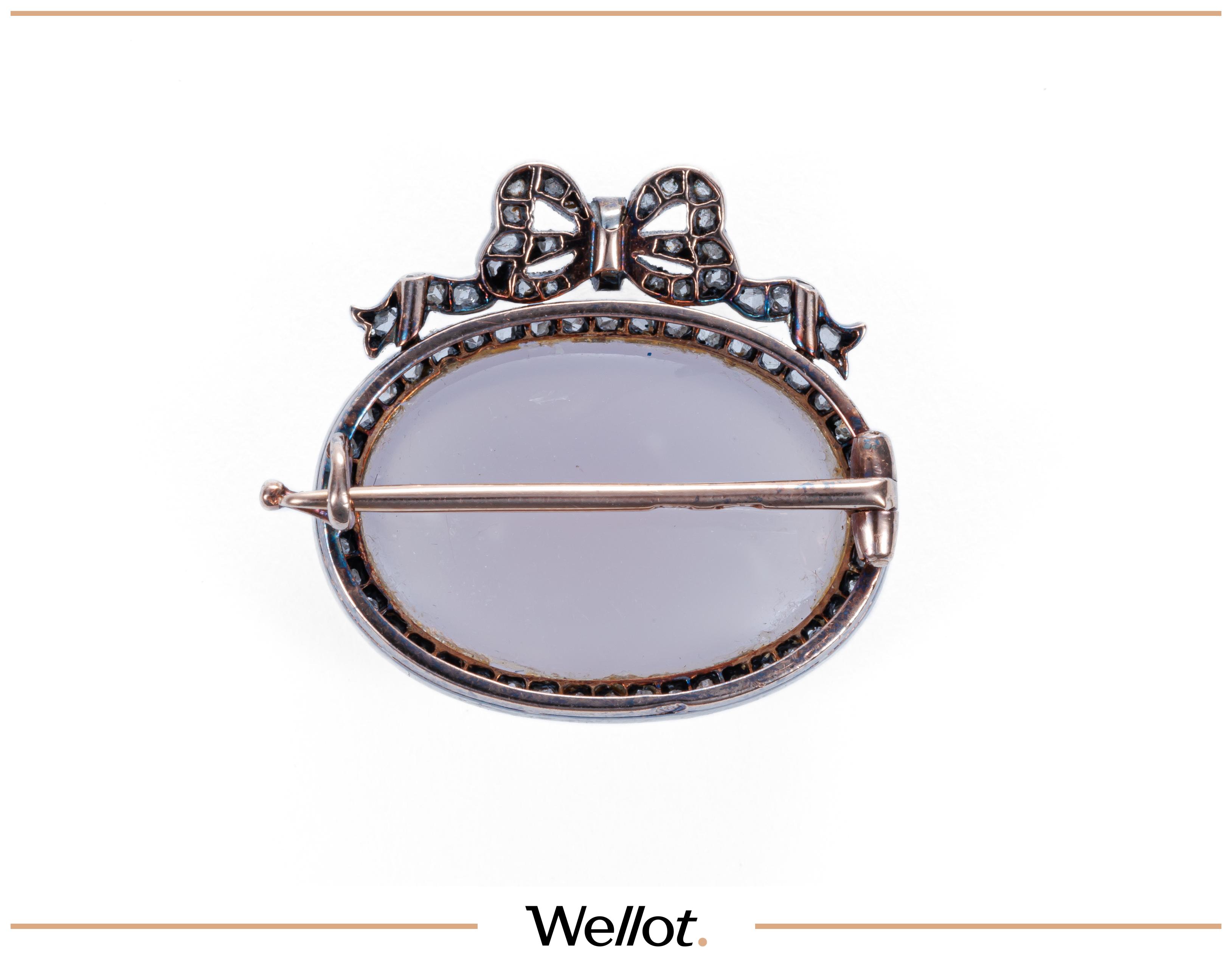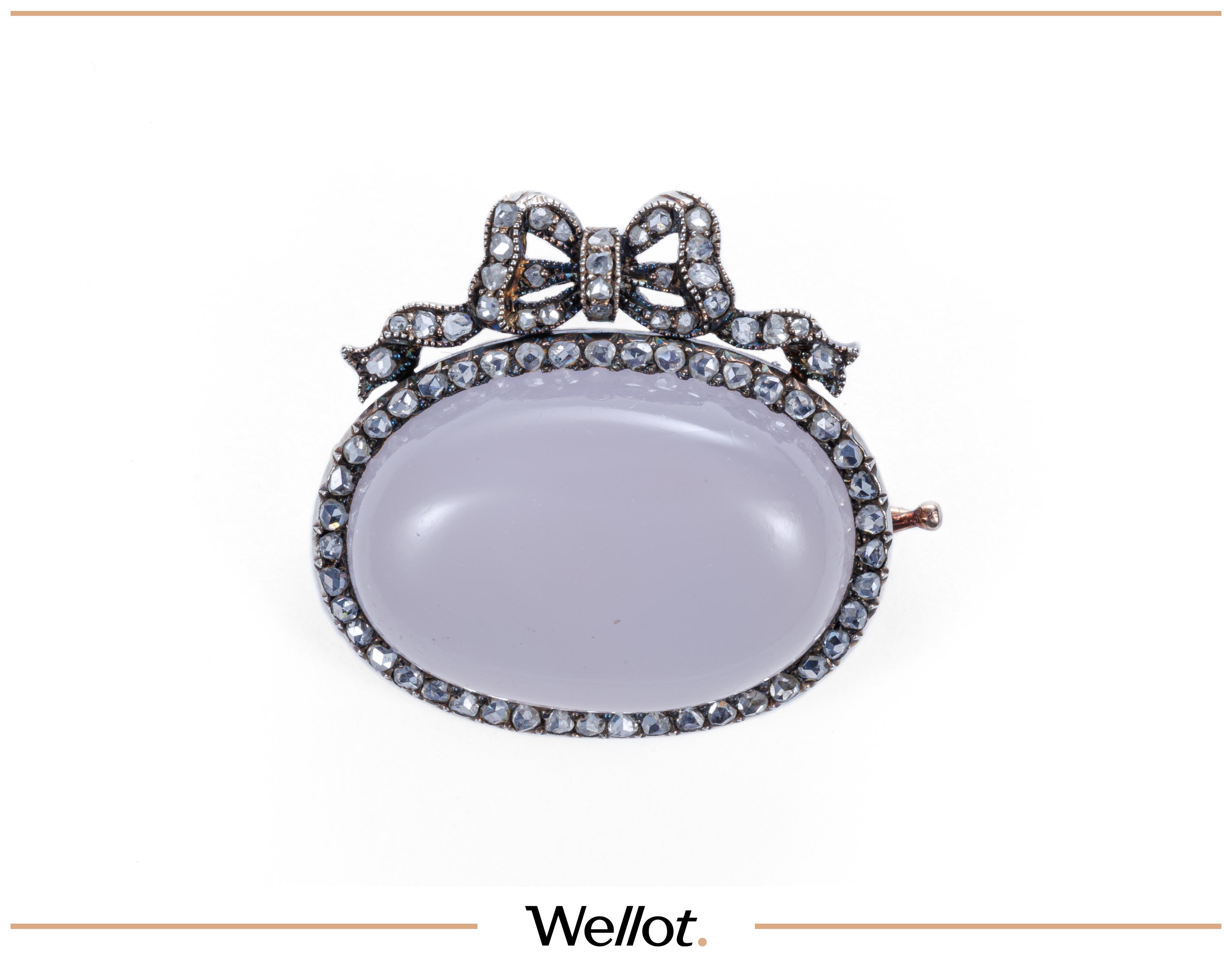 Золото, серебро, халцедон кабошон розово-сиреневого цвета, алмазы огранки «роза». Вес 8,62гр. 74 алмаза 0,66 карата. Размер: ширина 27 мм, высота 25 мм, глубина 14 мм. Клейма: мастера «АТ», тройник Санкт-Петербургского окружного пробирного управления – женская голова, обращенная влево, с инициалами управляющего округом Я.Ляпунова — «ЯЛ» и пробой для золотых изделий «56»; фирменный инвентарный номер 74984. Ярчайший пример ювелирного искусства Фаберже! Брошь представляет собой редкий образец произведений знаменитого ювелира Альфреда Тилемана, сотрудничавшего с фирмой К.Фаберже. Центром украшения, выполненного в неоклассическом вкусе, является крупный овальный халцедон, окаймленный тонким пояском мелких алмазных роз закрепке из серебра. Сверху предмет венчает маленький изящный бантик, усыпанный мелкими алмазами. Подобный «фасон» в стиле Людовика XVI был чрезвычайно популярен на рубеже позапрошлого и прошлого веков и был характерен для ювелирной продукции Северной Пальмиры. Серо-розовые и сиреневые халцедоны, которые Фаберже называл камни "мекка", были особенно популярны в эпоху 1900х прошедшую под влиянием стиля Art Nouveau. По приданию у пророка Мухаммеда было кольцо с таким же камнем. Изысканное украшение является редким и уникальным произведением антикварного и коллекционного значения. Точно такая же брошь была продана на одном из западных аукционов за 42 600 фунтов стерлингов. На данный предмет имеется экспертное заключение за подписью искусствоведа Мутян Татьяны Николаевны; геммологическая экспертиза Архиповой Ларисы Константиновны.