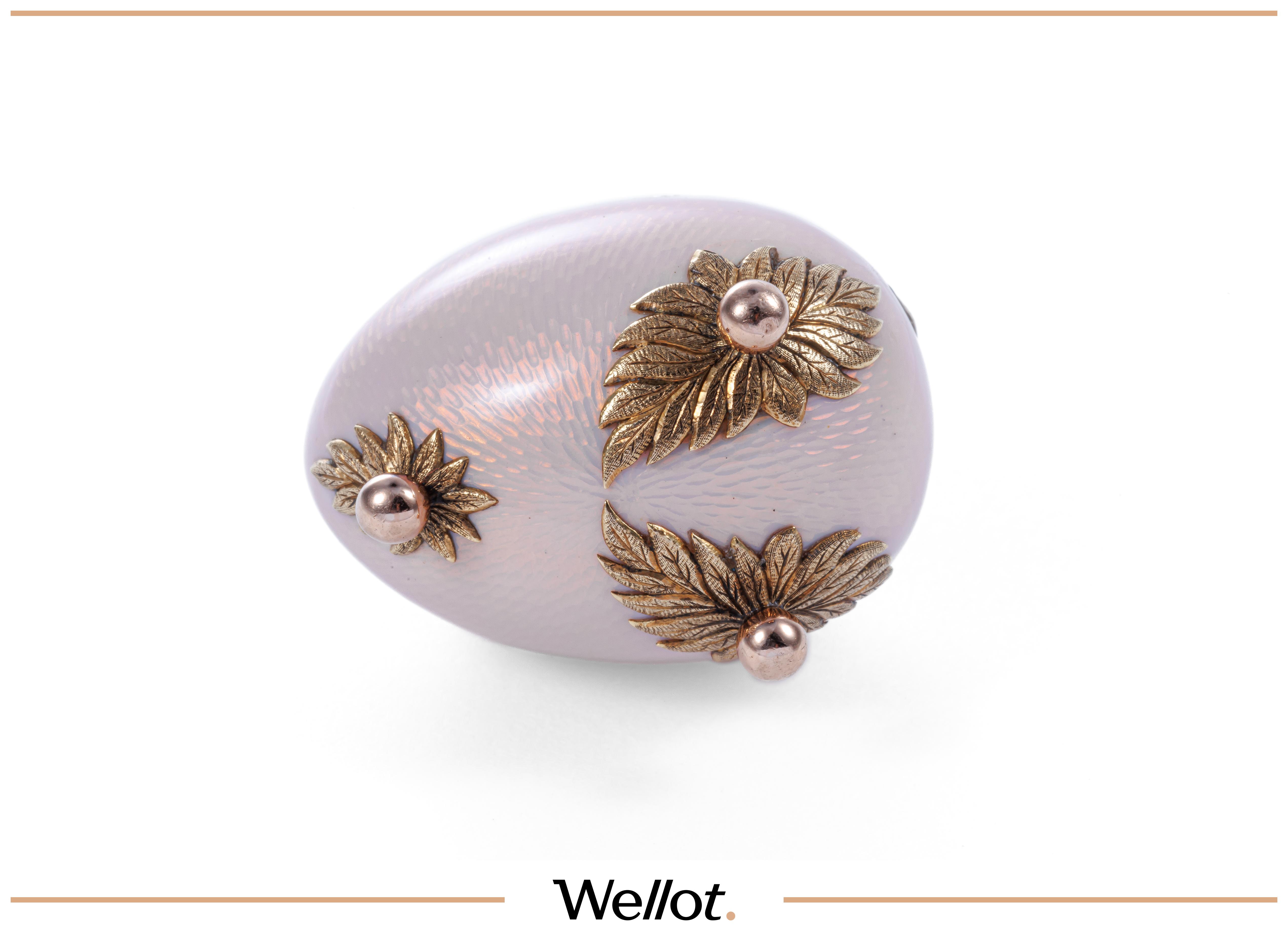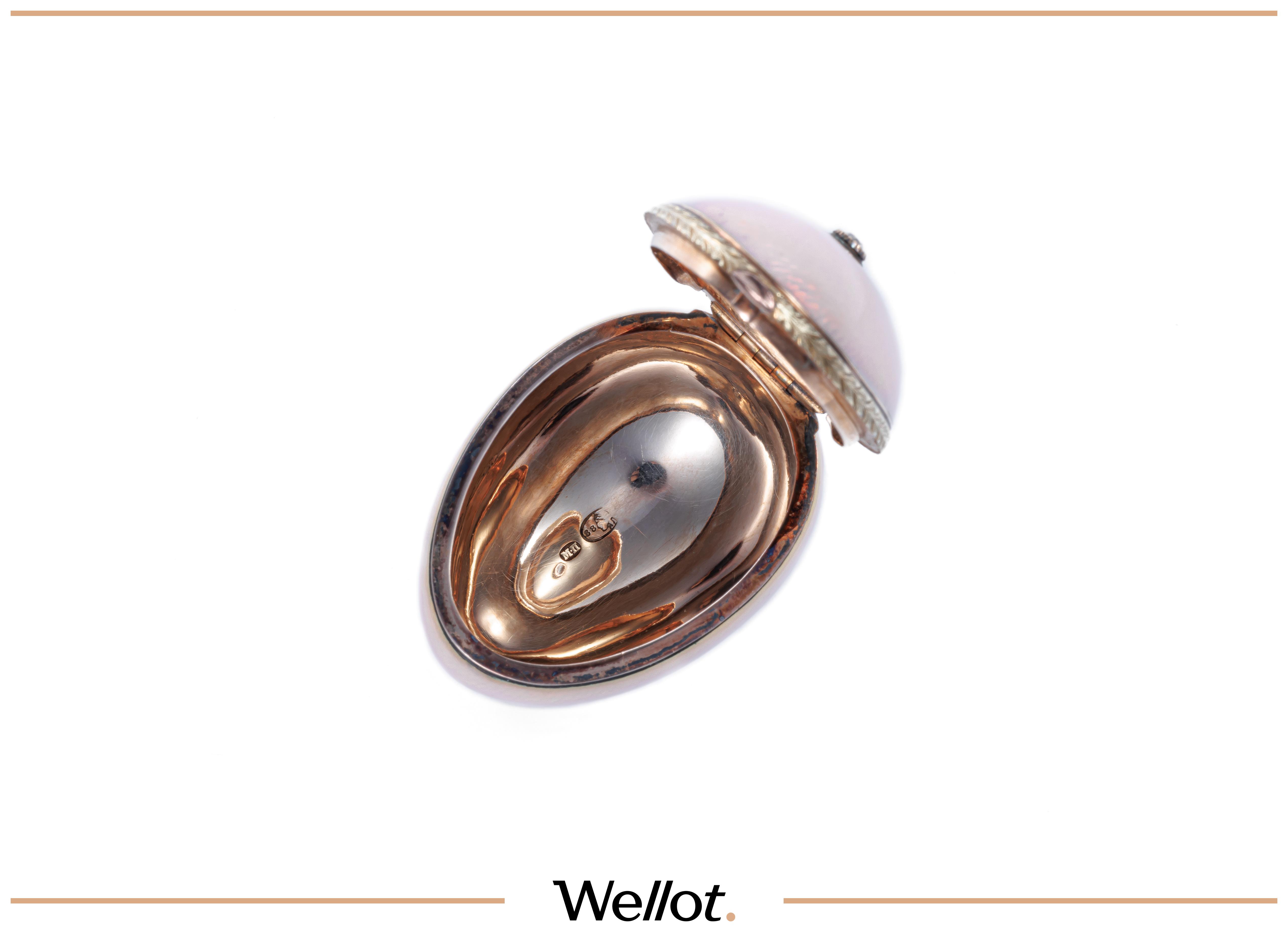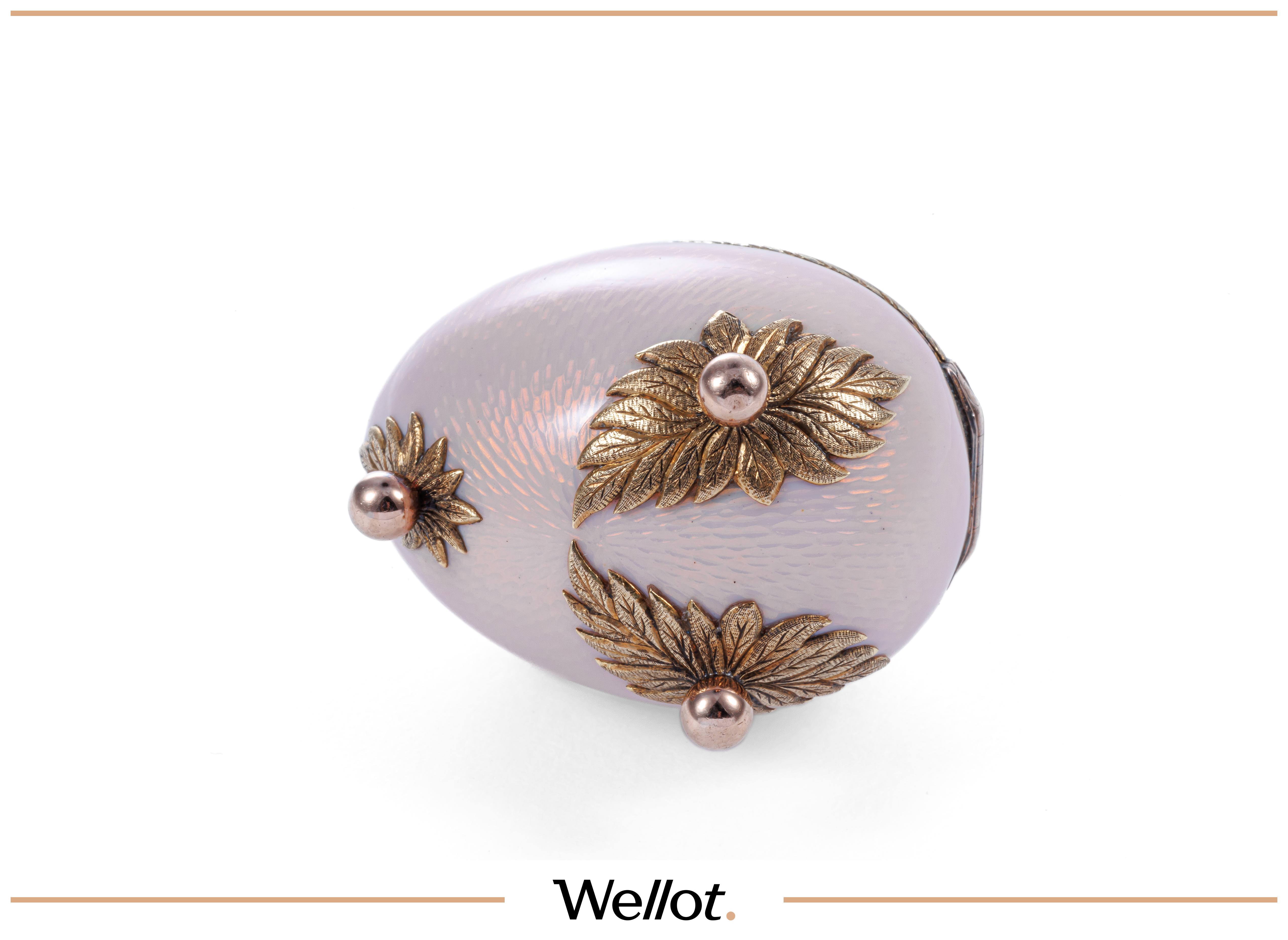 Серебро, многоцветное золото, розовая перламутровая эмаль, бриллиант. Размеры : высота 21 мм, диаметр 41 мм. Клейма: тройник Санкт-Петербургского окружного пробирного управления — женская голова, обращенная вправо, с инициалами управляющего округом Я.Ляпунова – «ЯЛ» и цифрой «88»; клеймо-именник «МП» в овале (главный мастер фирмы К.Фаберже – Михаил Перхин). На крышке клеймо знак удостоверения: «88»; «МП» в овале. Фирменный инвентарный номер: 1805. Прикоснитесь к истории легендарных "яиц Фаберже".