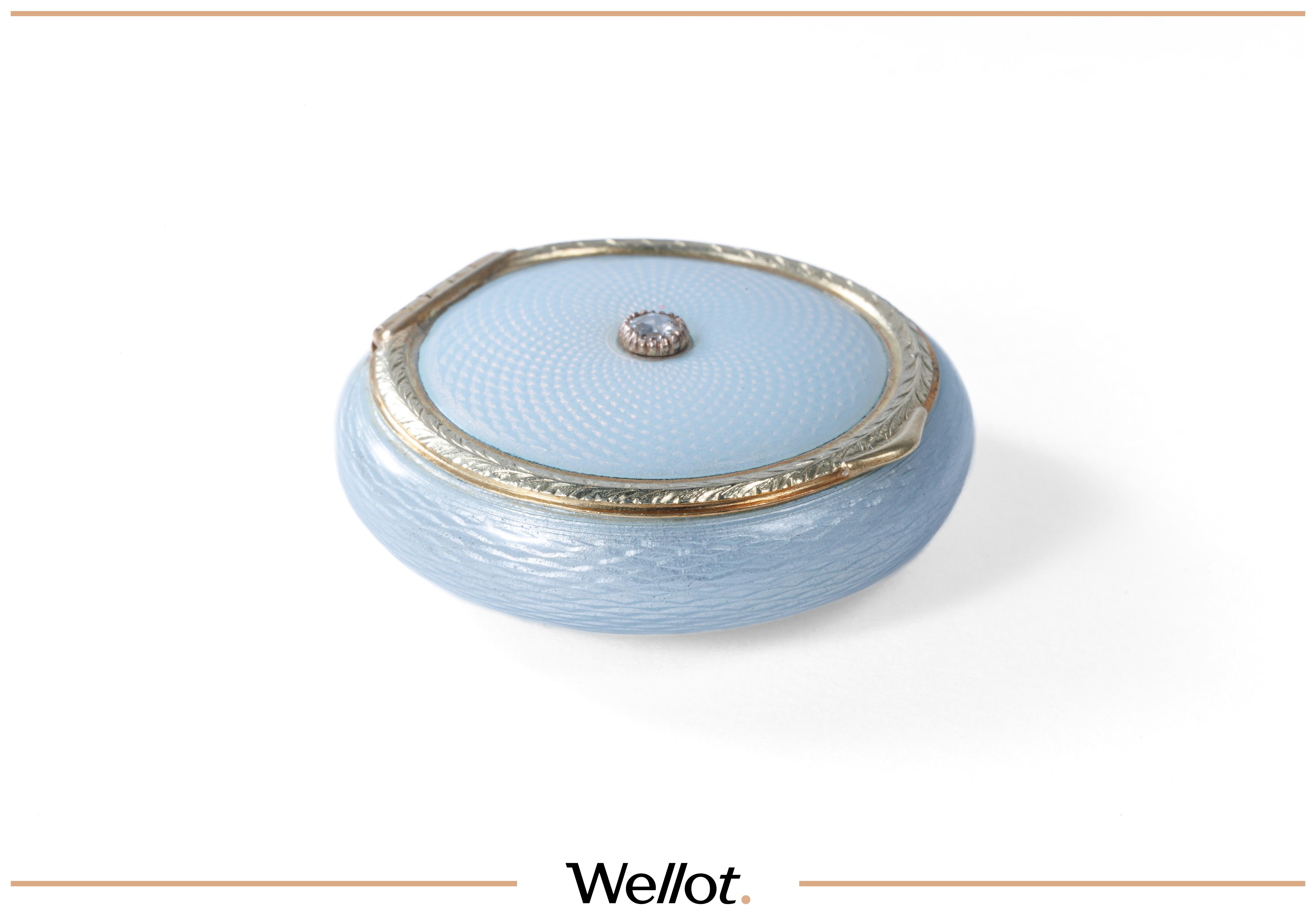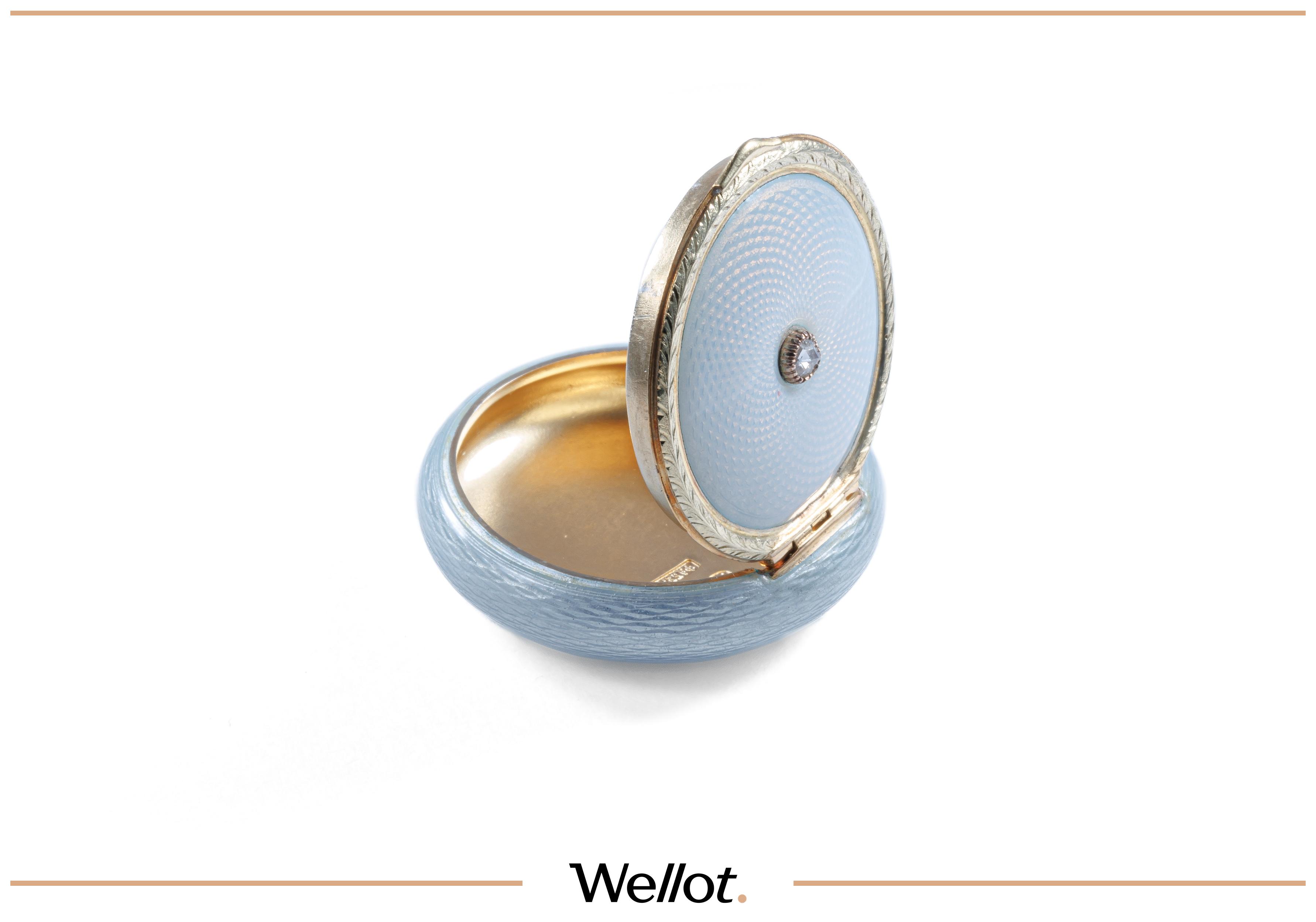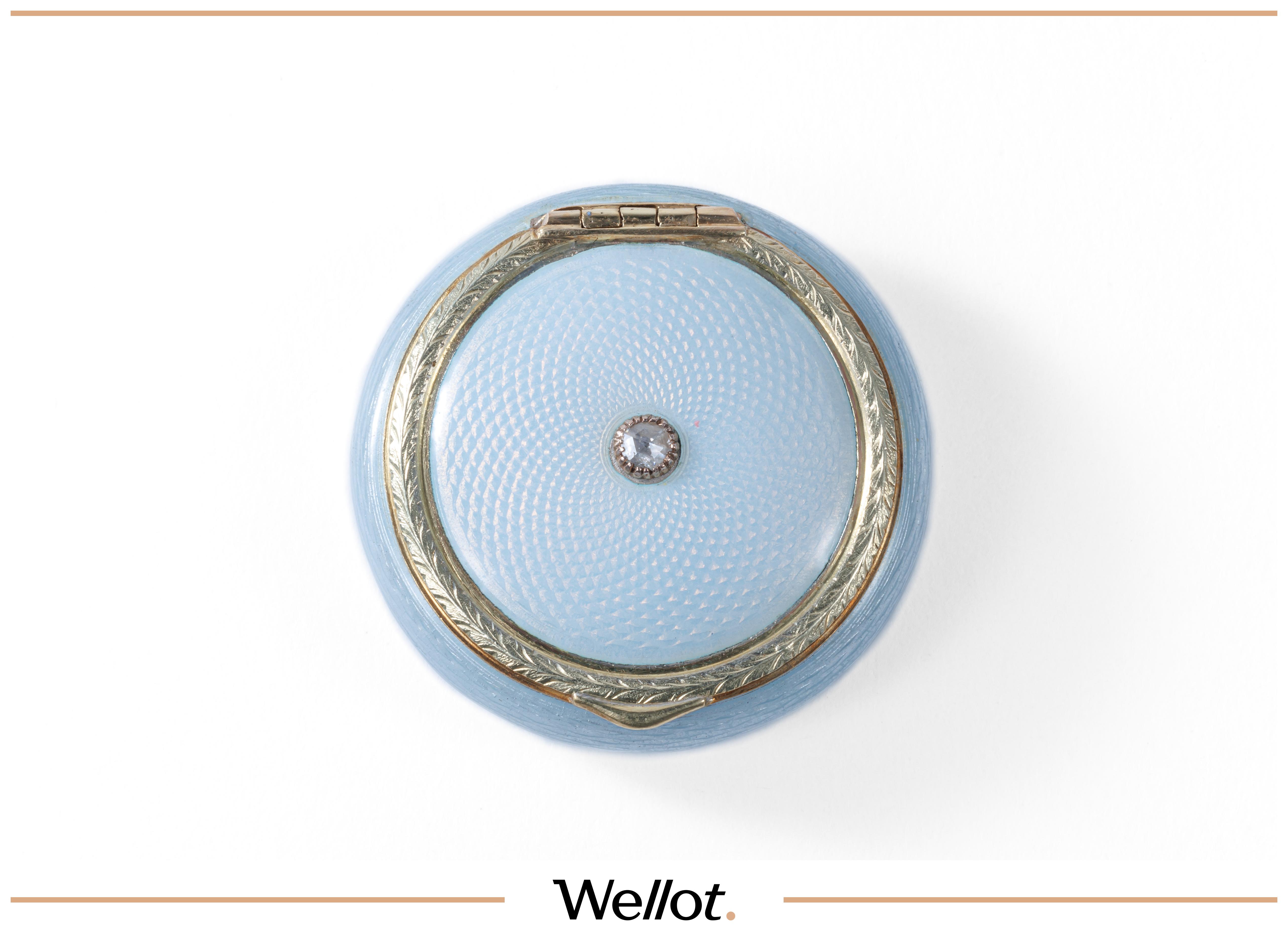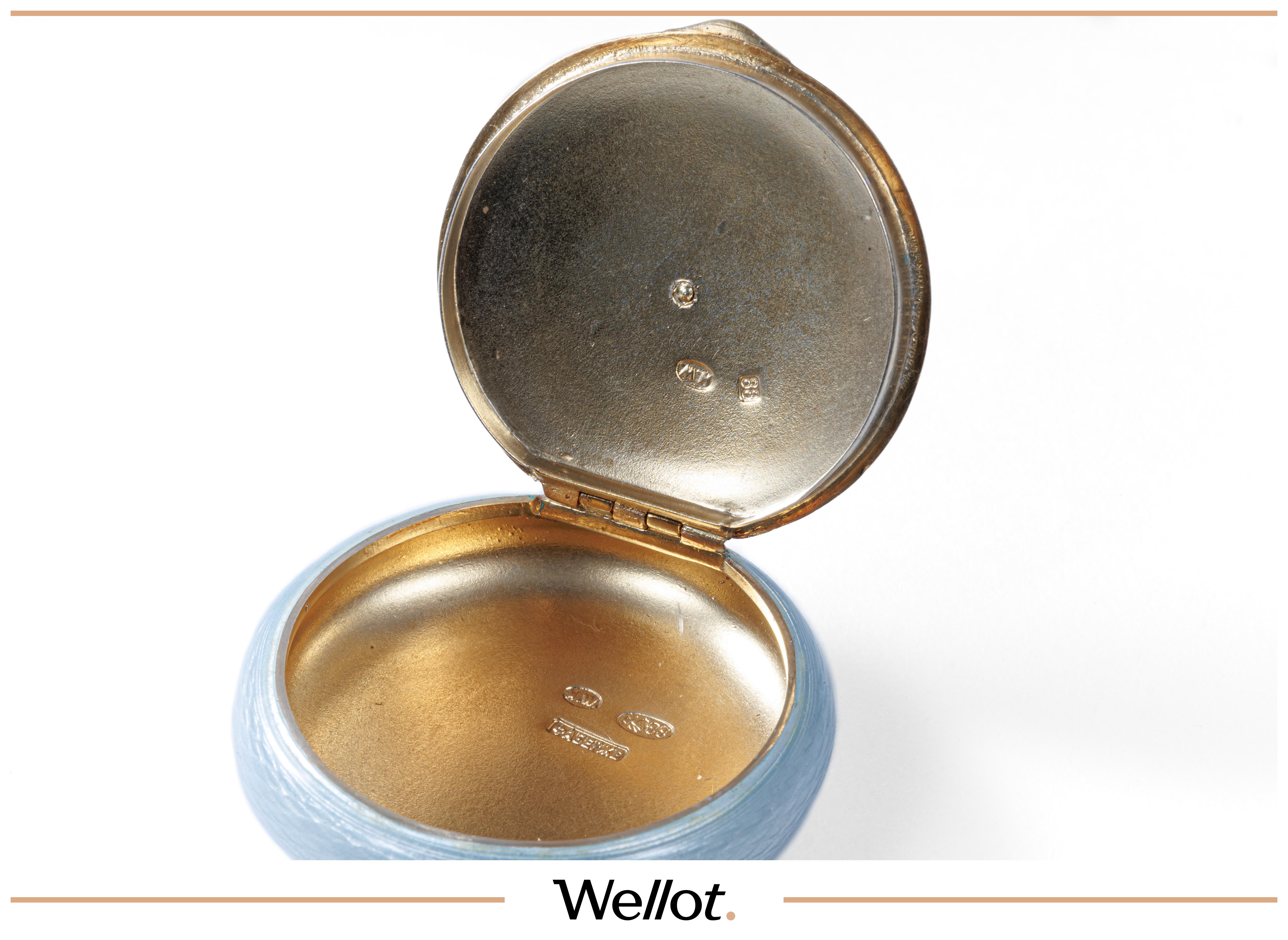 Белый золоченый металл. Отделка из желтого металла. Бриллиант. Устричная эмаль. Размеры: высота 10 мм, диаметр 34 мм. Клейма: фирмы "Фаберже"; мастера "H.W."; тройник Санкт-Петербургского окружного пробирного управления — женская голова в кокошнике, обращенная влево, с пробой для изделий из серебра — "88" и инициалами управляющего округом А.Романова — "АР"; фирменный инвентарный номер — "14792". Изысканный и характерный образец изделий прославленной фирмы Карла Фаберже.