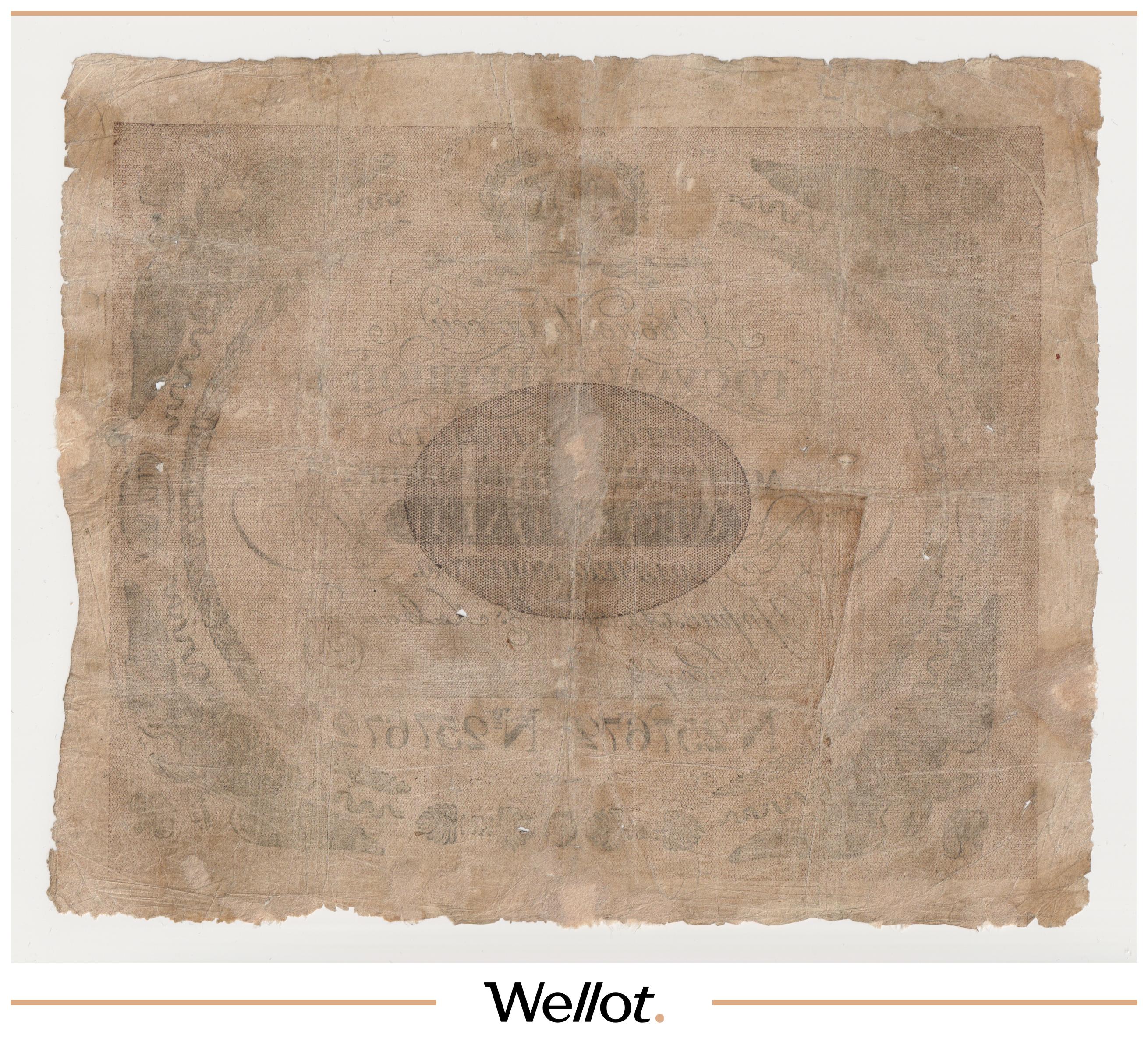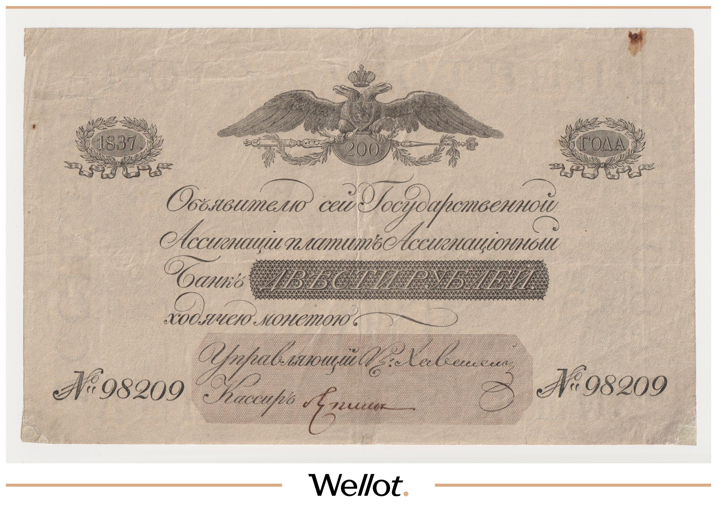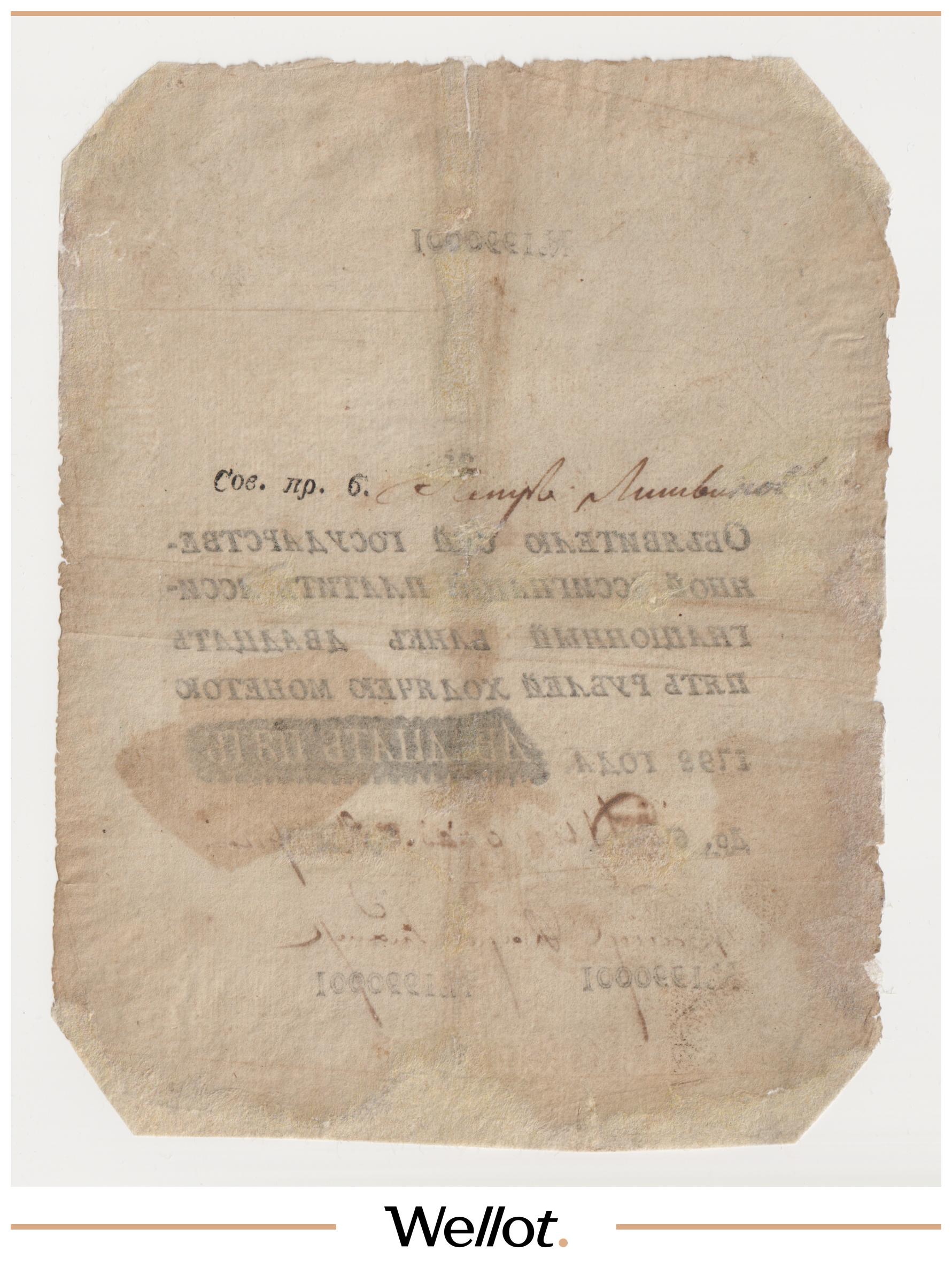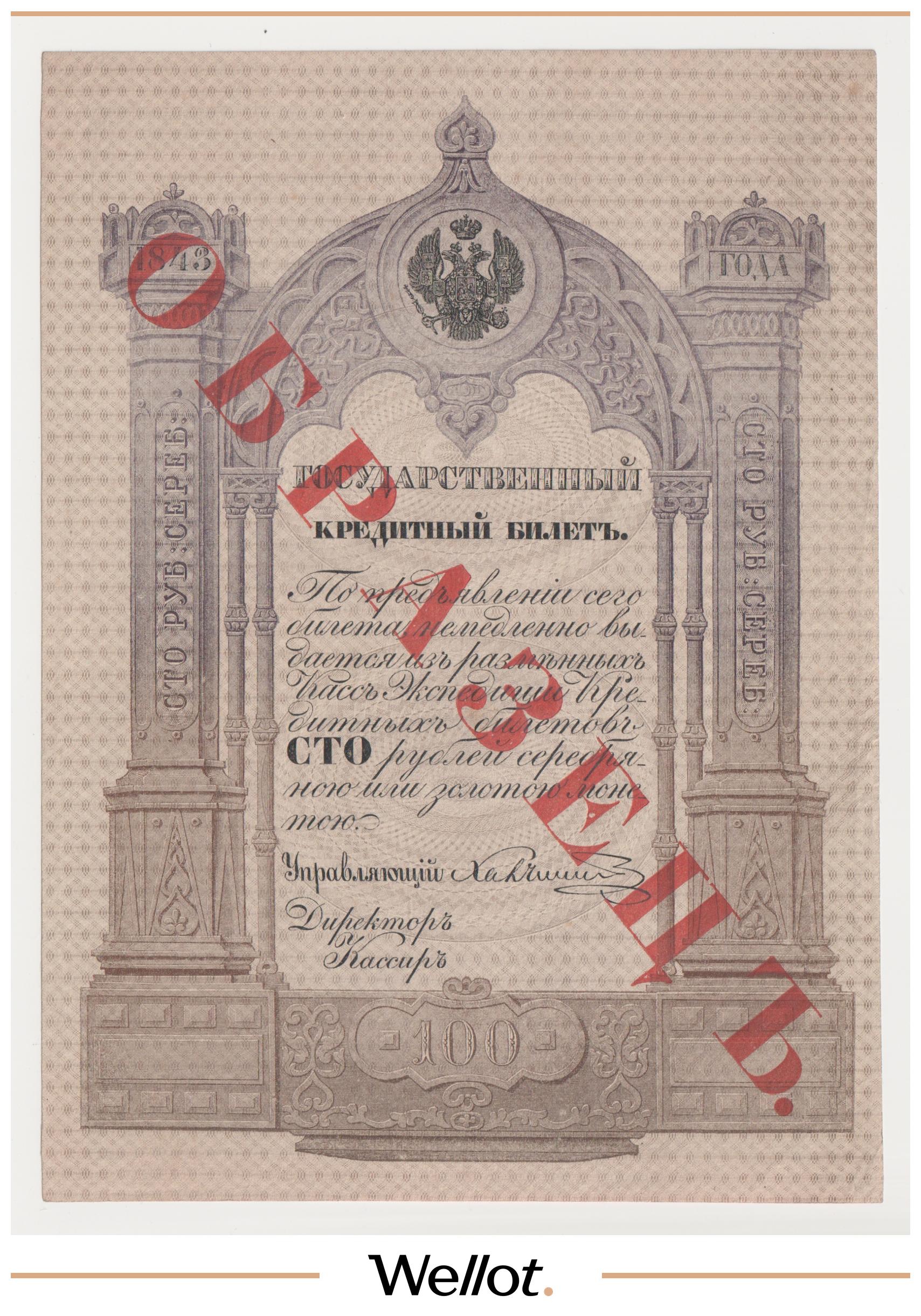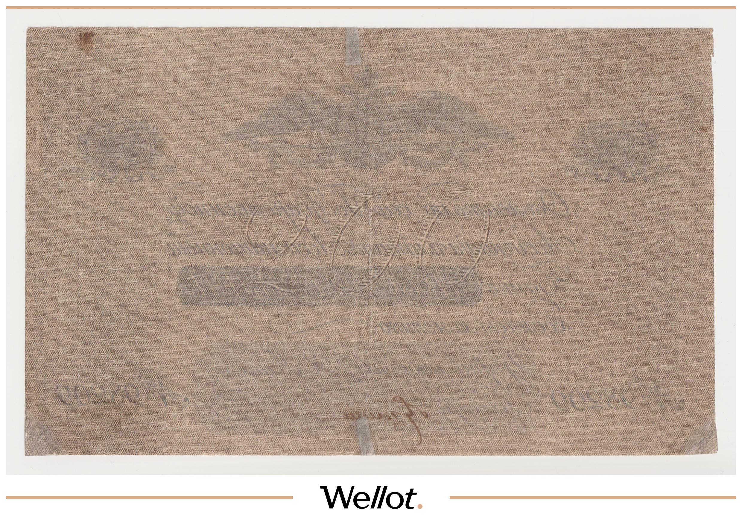Крупный формат (200 х 170 мм) и монументальный дизайн этой купюры делает ее одним из самых впечатляющих бумажных денежных знаков первой половины XIX века. Перед вами значимый исторический артефакт и украшение любой серьёзной коллекции.