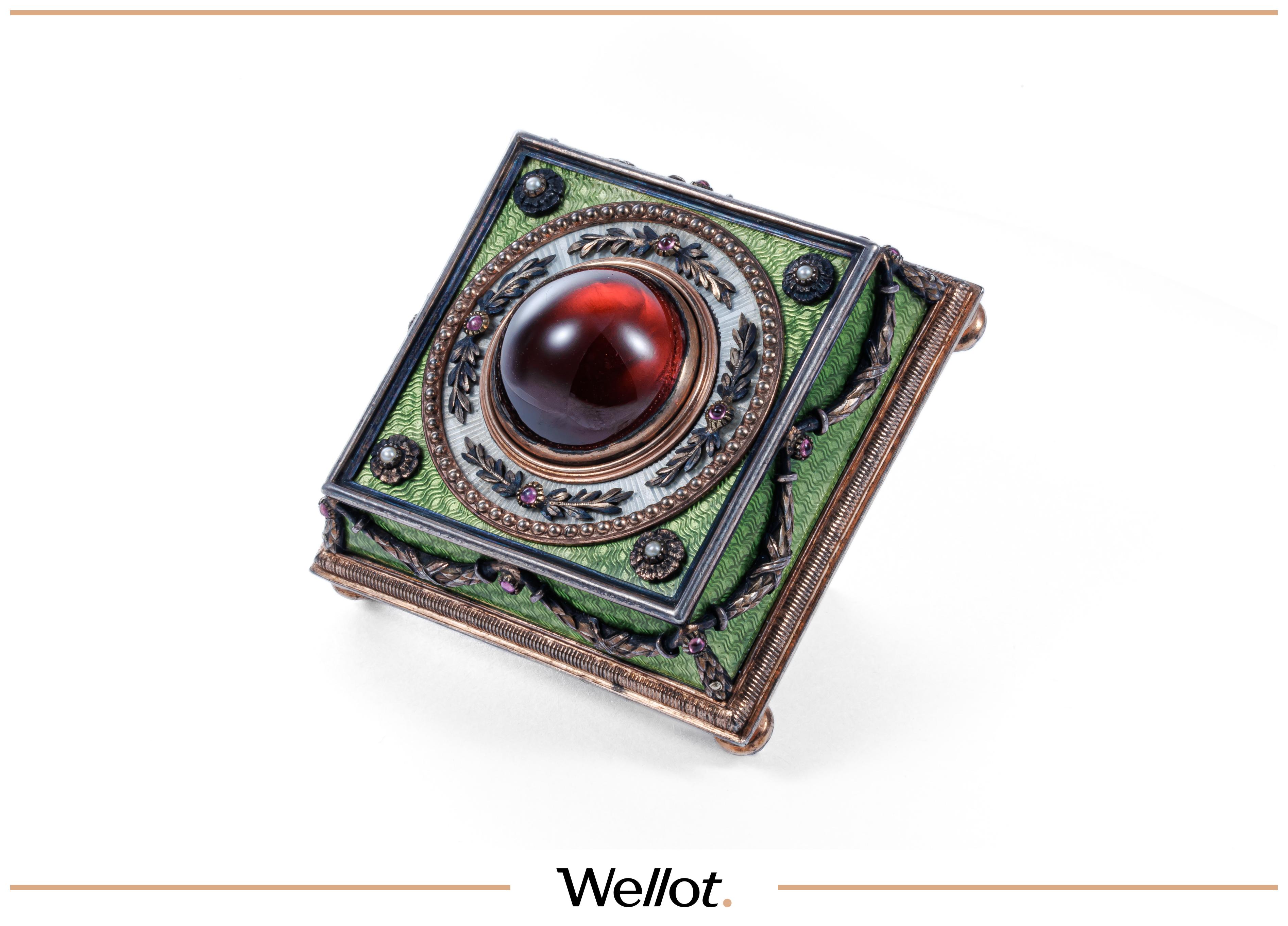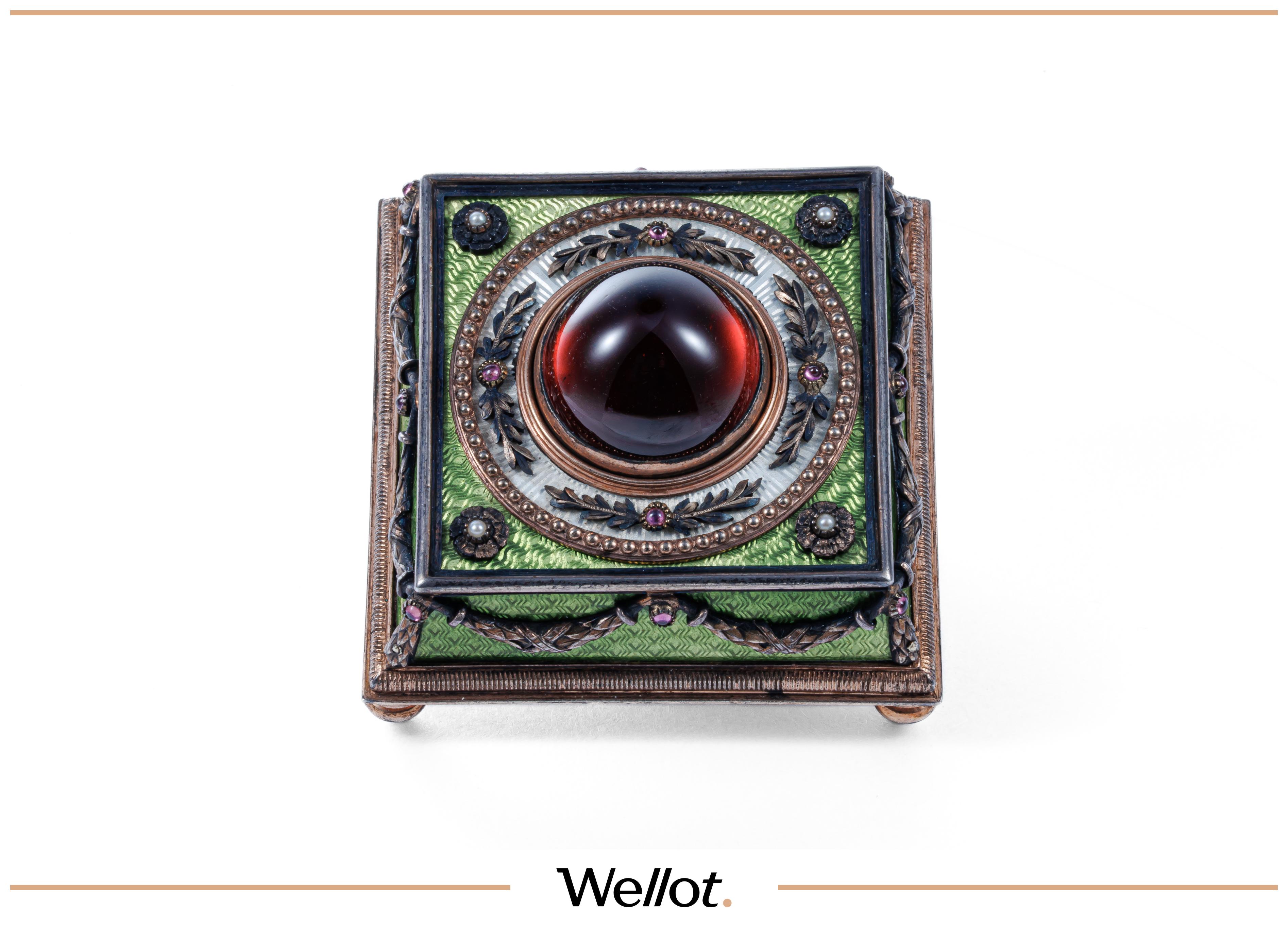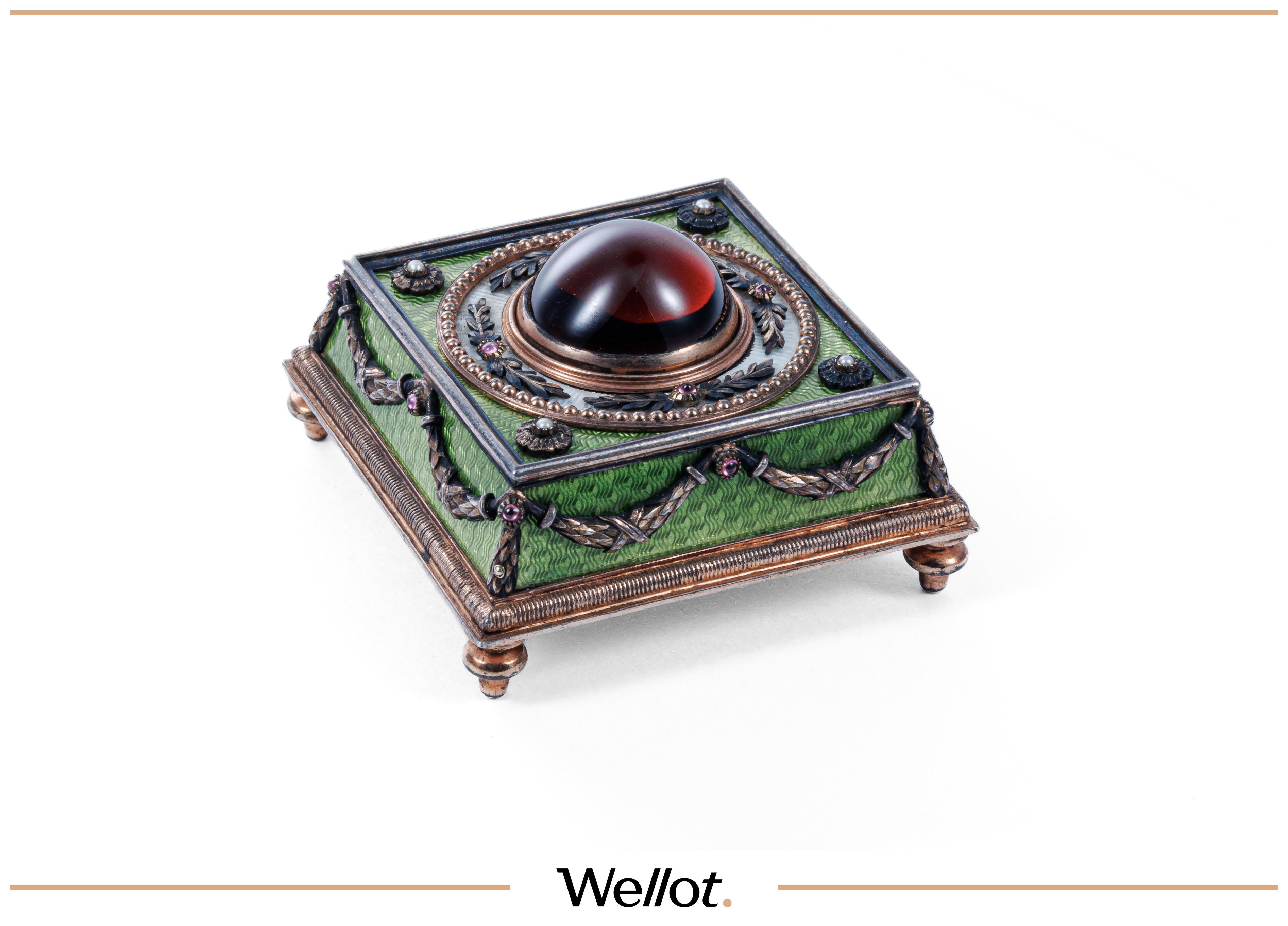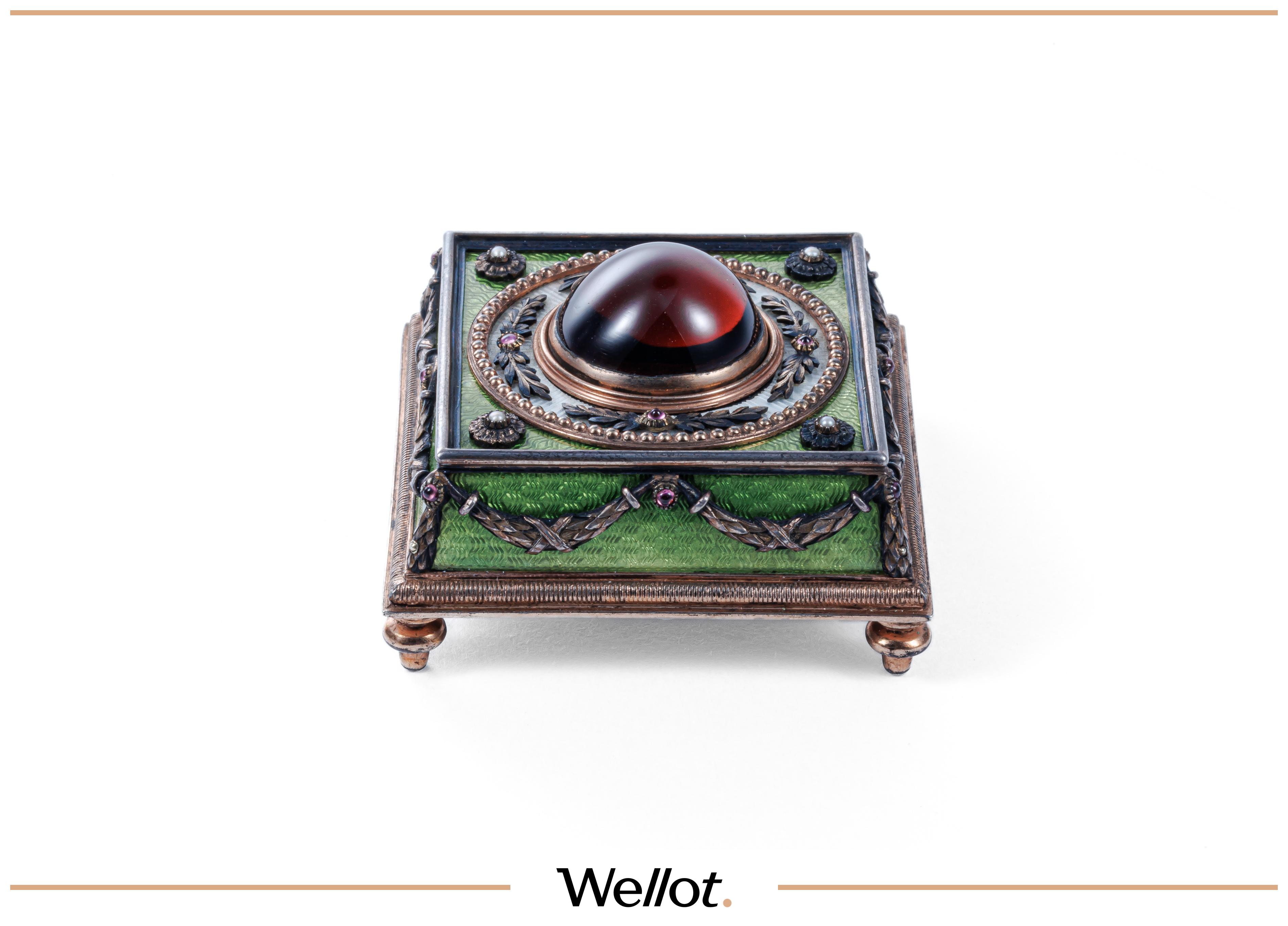 Белый металл, золочение, яблочная гильоше-эмаль, рубины. Размеры: высота 33 мм, ширина 46 мм. Клейма: фирмы "Фаберже"; мастера М.П. (главный ювелир фирмы К.Фаберже М.Е.Перхин); двойник Санкт-Петербургской городской пробирной палатки; герб города — скрещенные якоря и скипетр с пробой для изделий из серебра "88"; инвентарный номер "58156". Сложнейшая техника двуцветной эмали. Подобные предметы, выполненные с использованием сложных многообразных техник, единичны в музейных собраниях. Предмет имеет высокое антикварное, художественное и коллекционное значение!