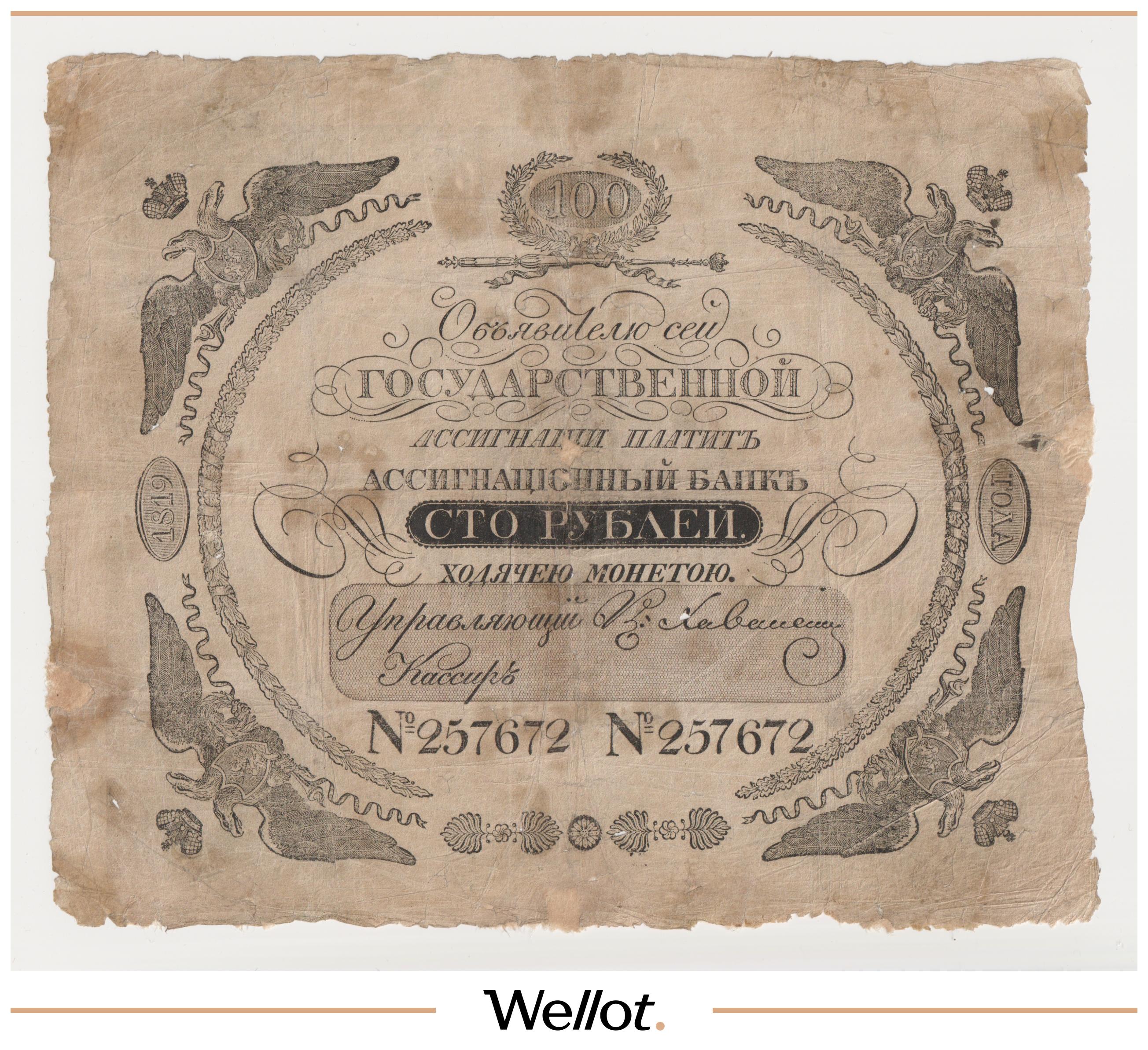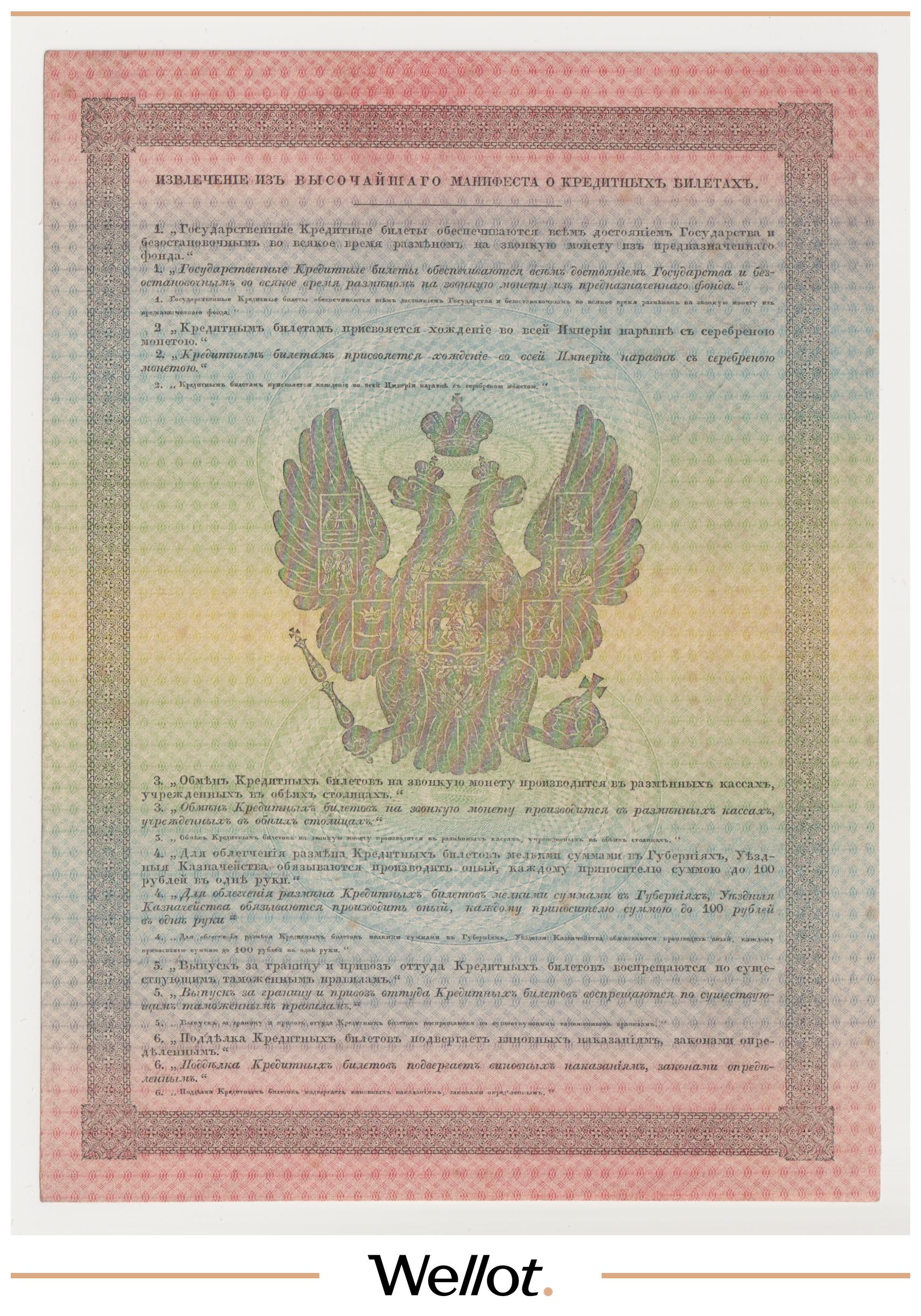 Самый крупный номинал российских ассигнаций — фундаментальная редкость и мечта любого коллекционера. Данный тип денежного знака получил прозвище «цесарка» благодаря изображению двуглавого орла, силуэт которого напоминает эту птицу. Огромная покупательная способность купюры делала её доступной лишь богатейшим слоям общества, а малое число сохранившихся экземпляров превратило её в символ престижа и вершину бонистической коллекции.