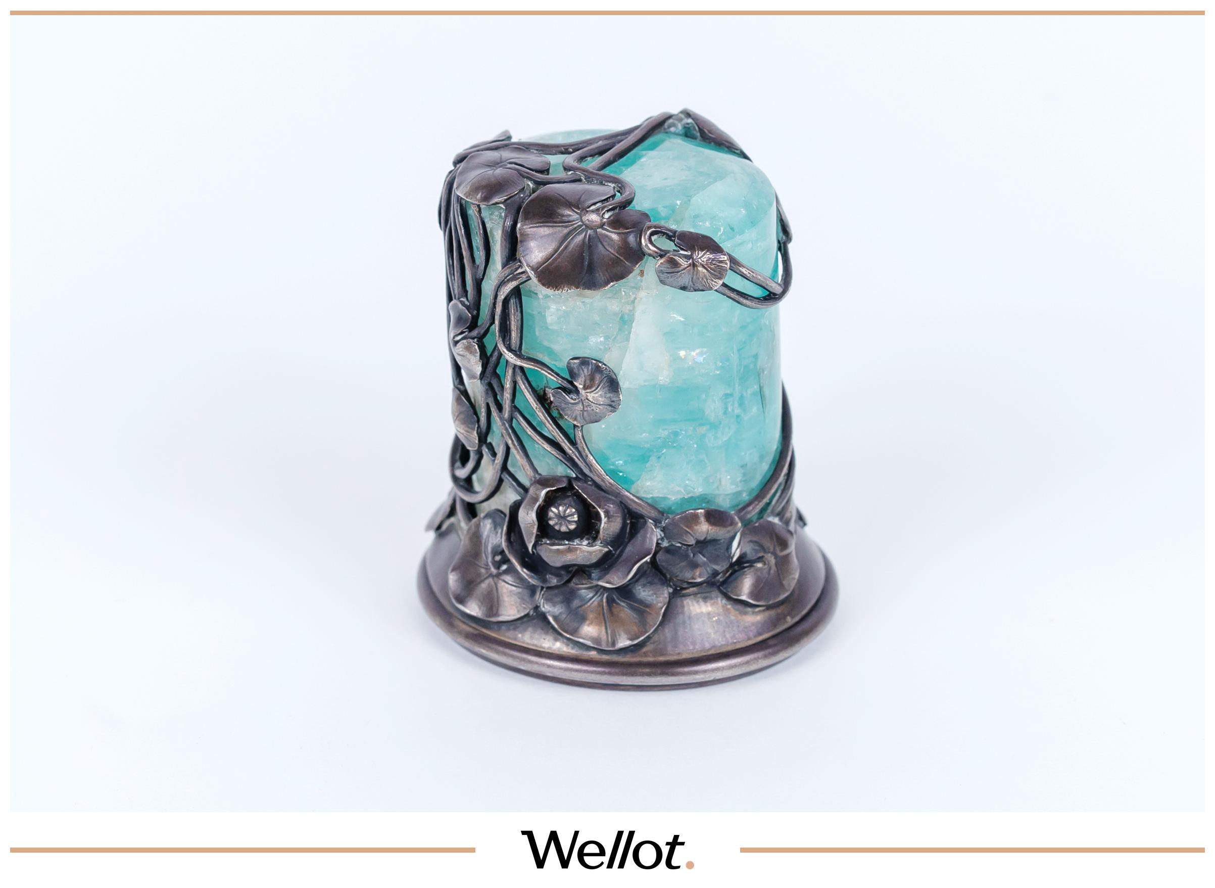 Массивная серебряная печать работы легендарного Петербургского мастера Виктора Аарне, созданная в 1902 году для фирмы «Фаберже». В её основании — крупный кристалл зеленого берилла коллекционного качества, сияющий сквозь изящную серебряную оправу в виде тонкой паутины из листьев кувшинок. Этот образ — квинтэссенция модного в начале XX века стиля ар-нуво, которым Аарне владел виртуозно.
