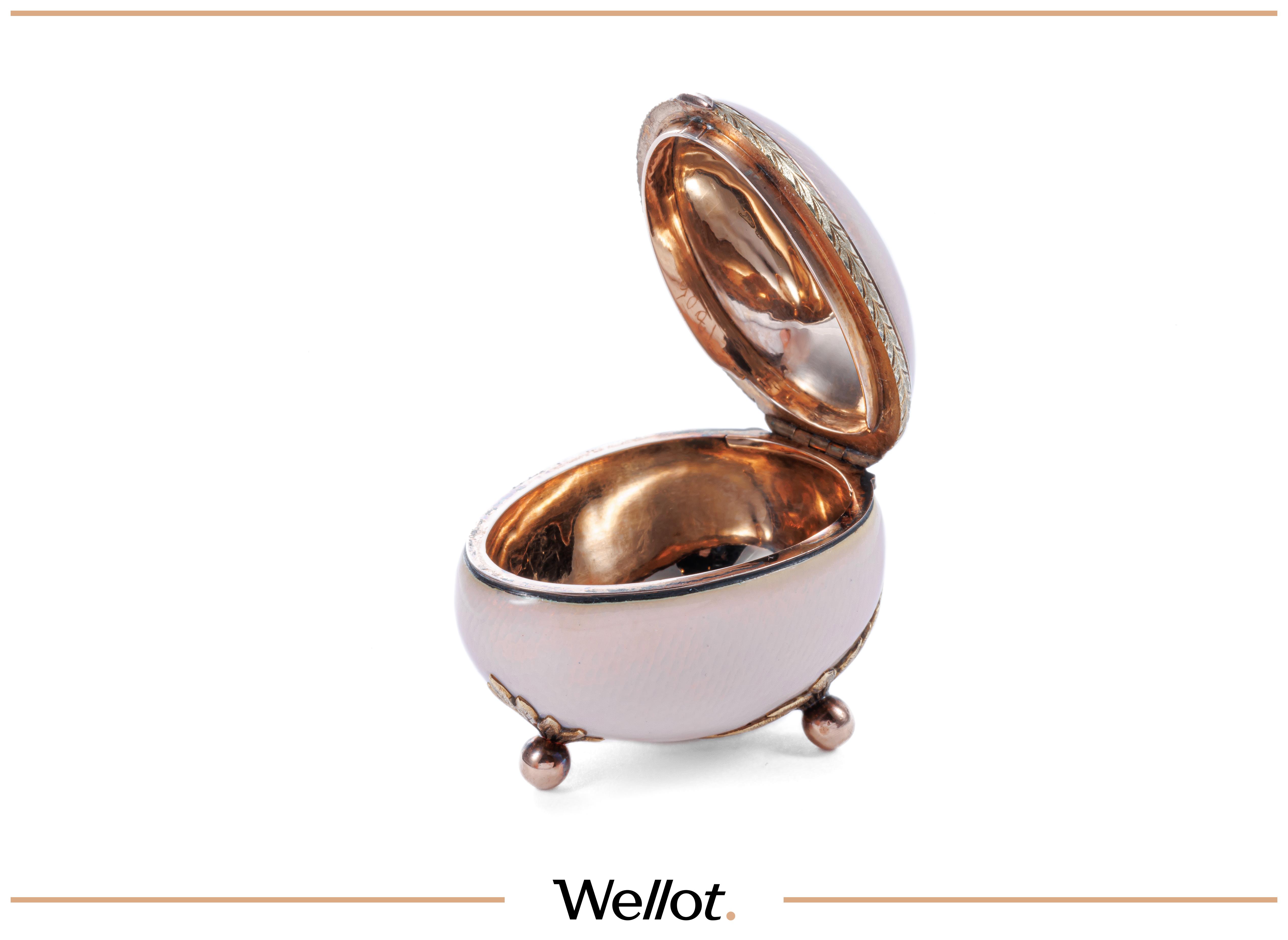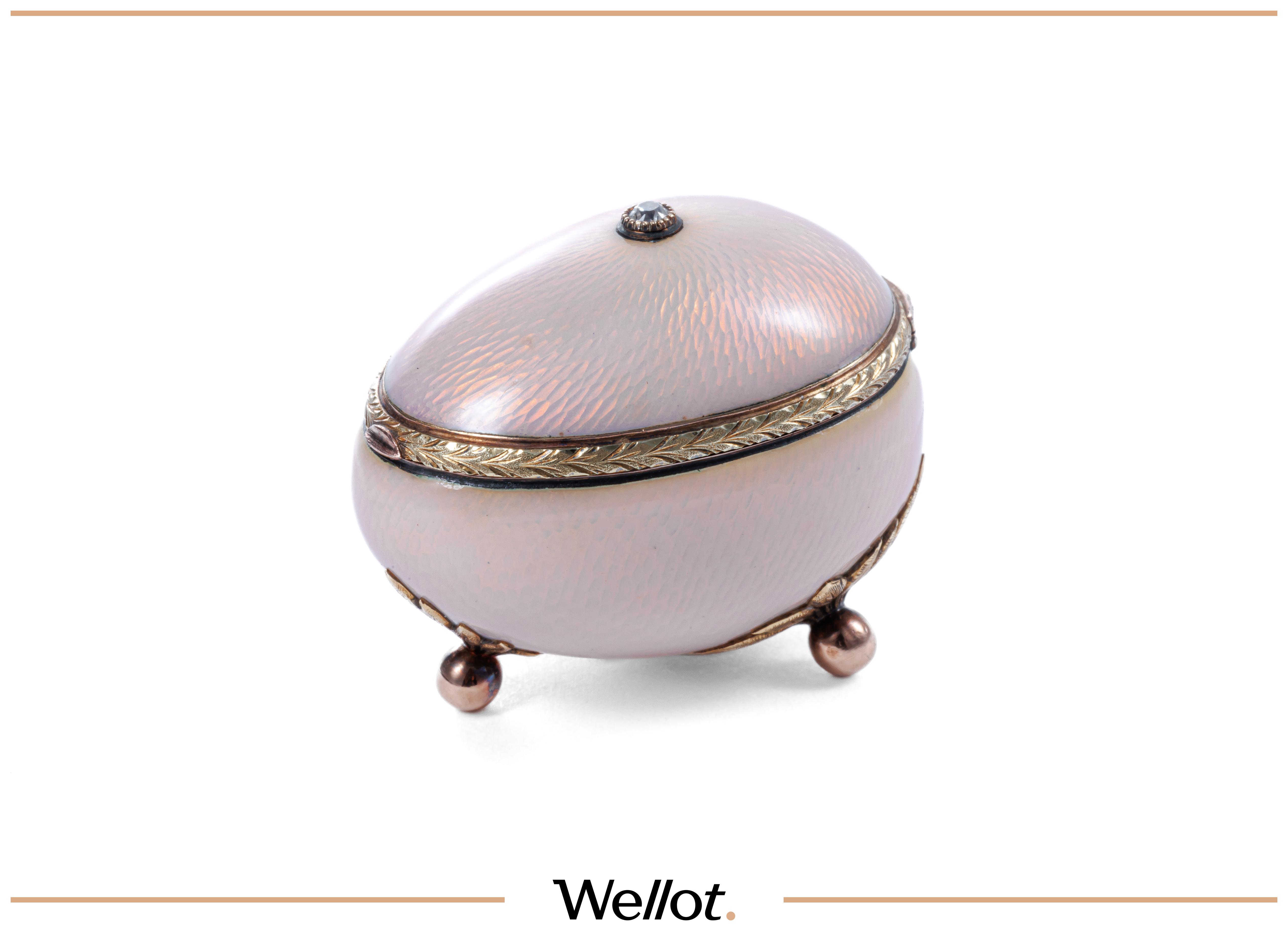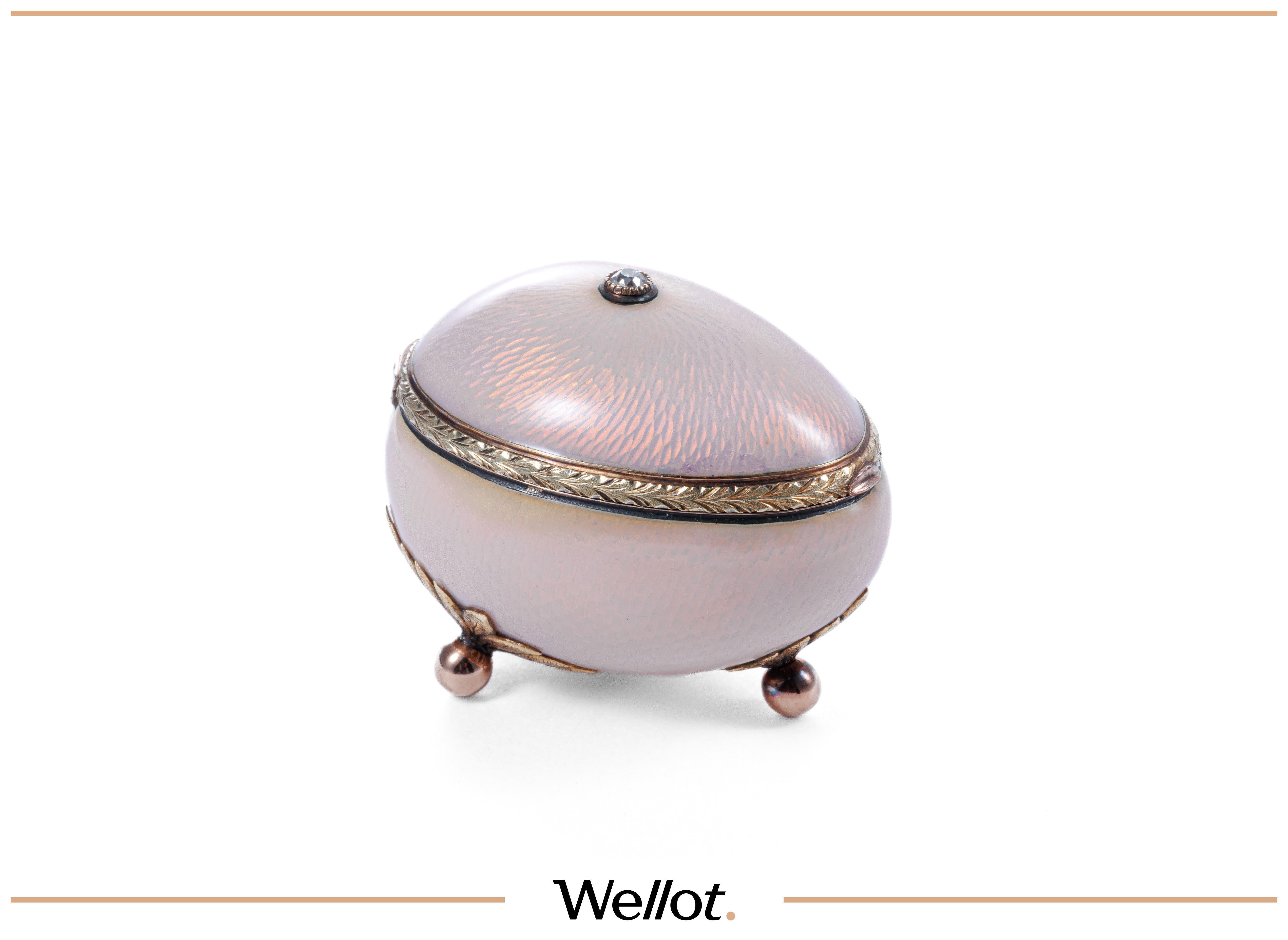 Выполнена в мастерской главного ювелира предприятия Генриха Вигстрема. Будучи подмастерьем и преемником великого Михаила Перхина, он возглавил его мастерскую после смерти учителя в 1903 году. Уже под его руководством продолжали создавать уникальные императорские пасхальные яйца и другие важные и сложные заказы. Данная коробочка отличается особым изяществом стиля, сложностью технологий и исключительным мастерством исполнения. Она проста и изящна одновременно. Устричная эмаль была крайне популярной среди клиентов фирмы «Фаберже» — это главное украшение предмета.