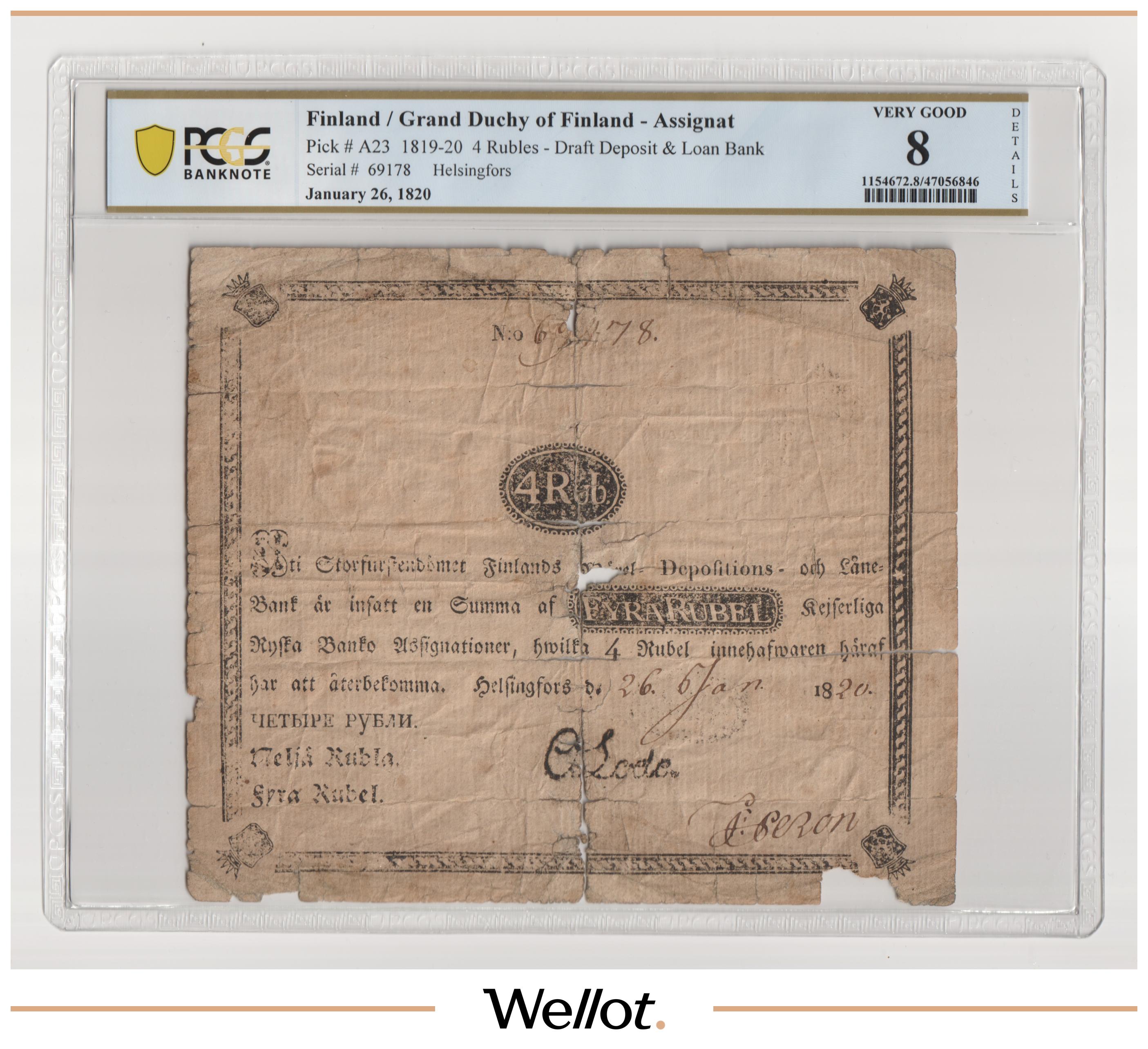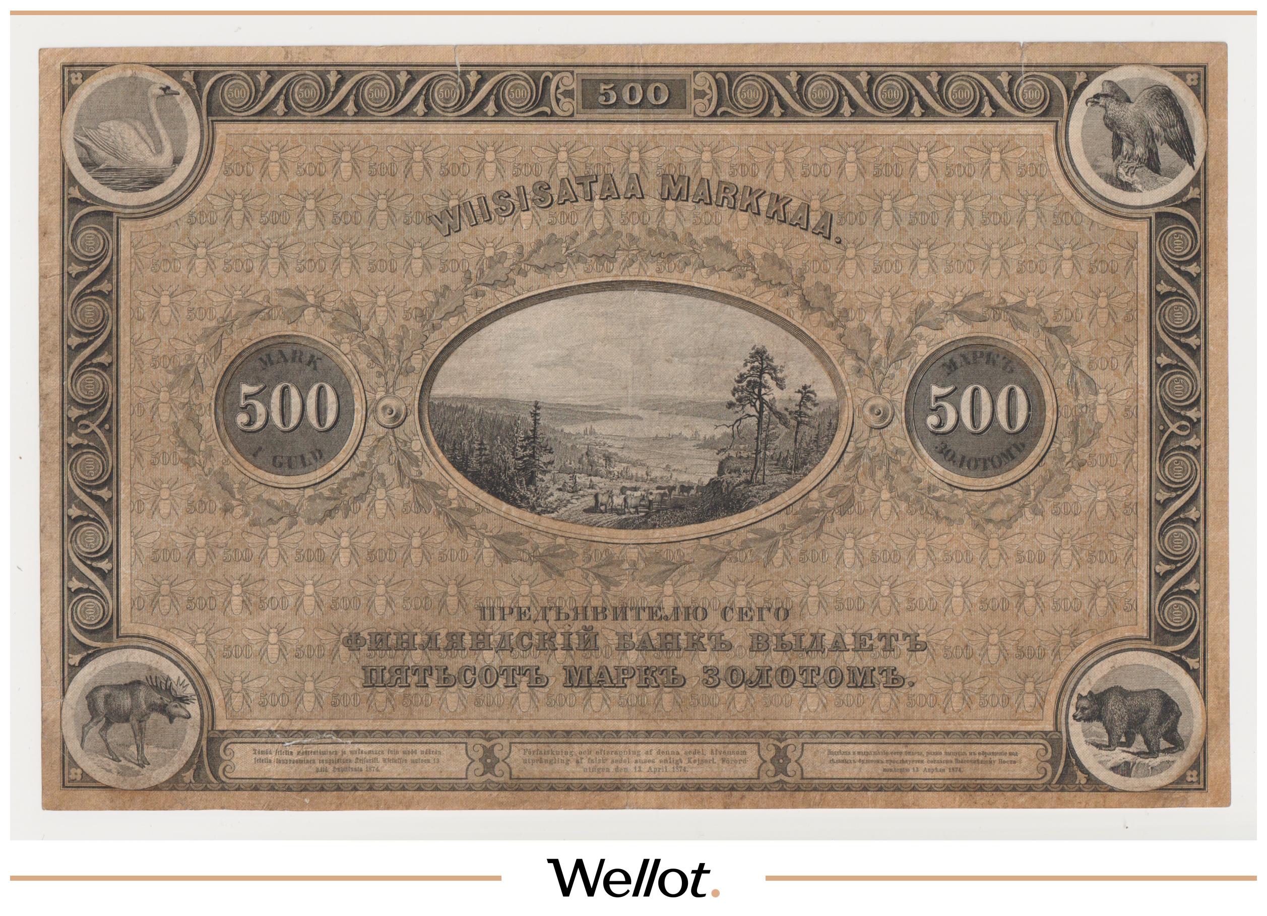 Первая банкнота Финляндии столь крупного номинала. Ее ценность была эквивалентна 161,5 граммам золота 900 пробы — колоссальная покупательская способность, которая обуславливает малый тираж и редкость. Одна из главных жемчужин коллекции Русско-Финских банкнот XIX века.