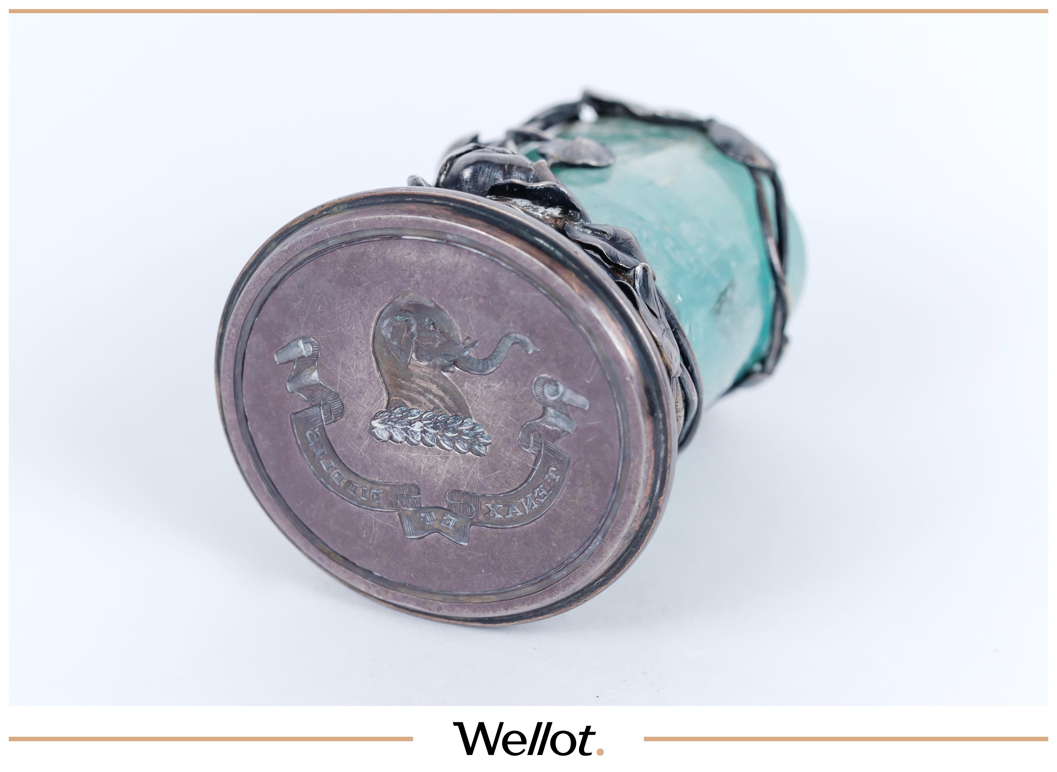 Берилл, серебро. Размеры: высота 57 мм, ширина 42 мм, длина 48 мм. Клейма: фирмы "Фаберже"; мастера ВА (Виктор Аарне); тройник Петербургского пробирного управления с пробой для изделий из серебра "88", женской головой в кокошнике и инициалами пробирного мастера "ЯЛ"; инвентарный номер "5831". Уникальное произведение ювелирного искусства!