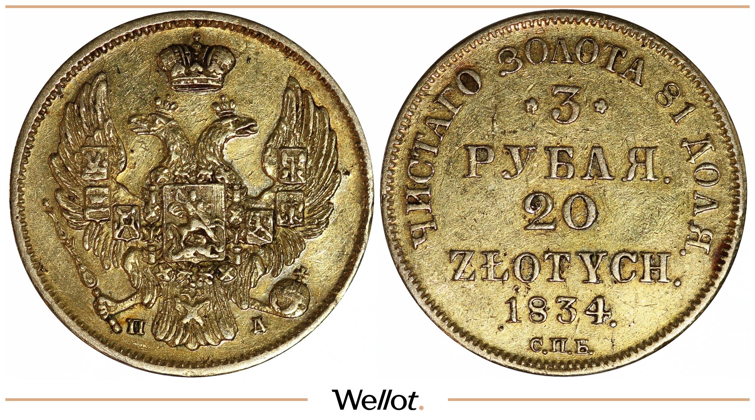 3 Рубля - 20 Злотых 1834 СПБ ПД Николай I для Польши