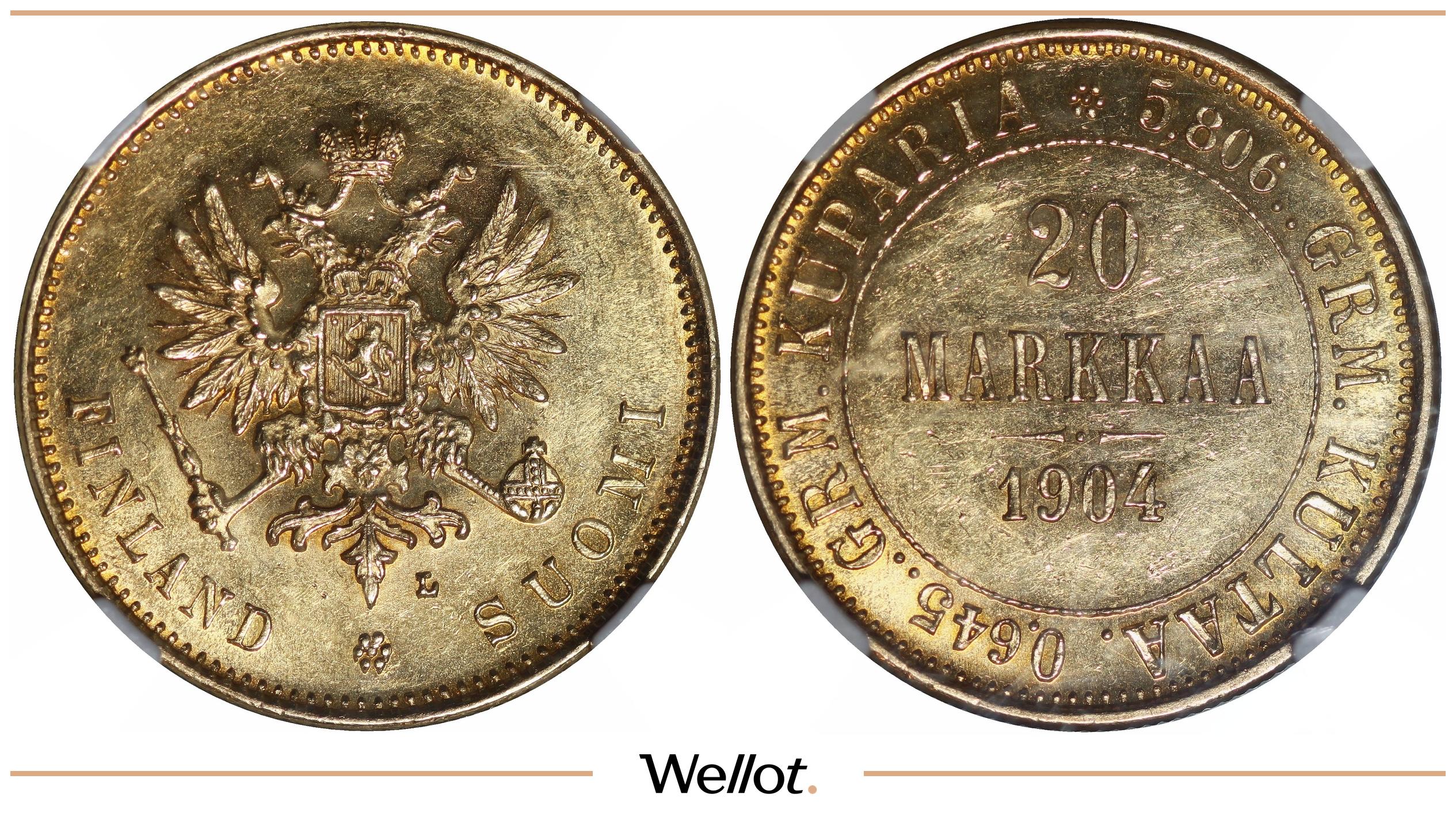 20 Марок 1904 L Николай II для Финляндии NGC MS61