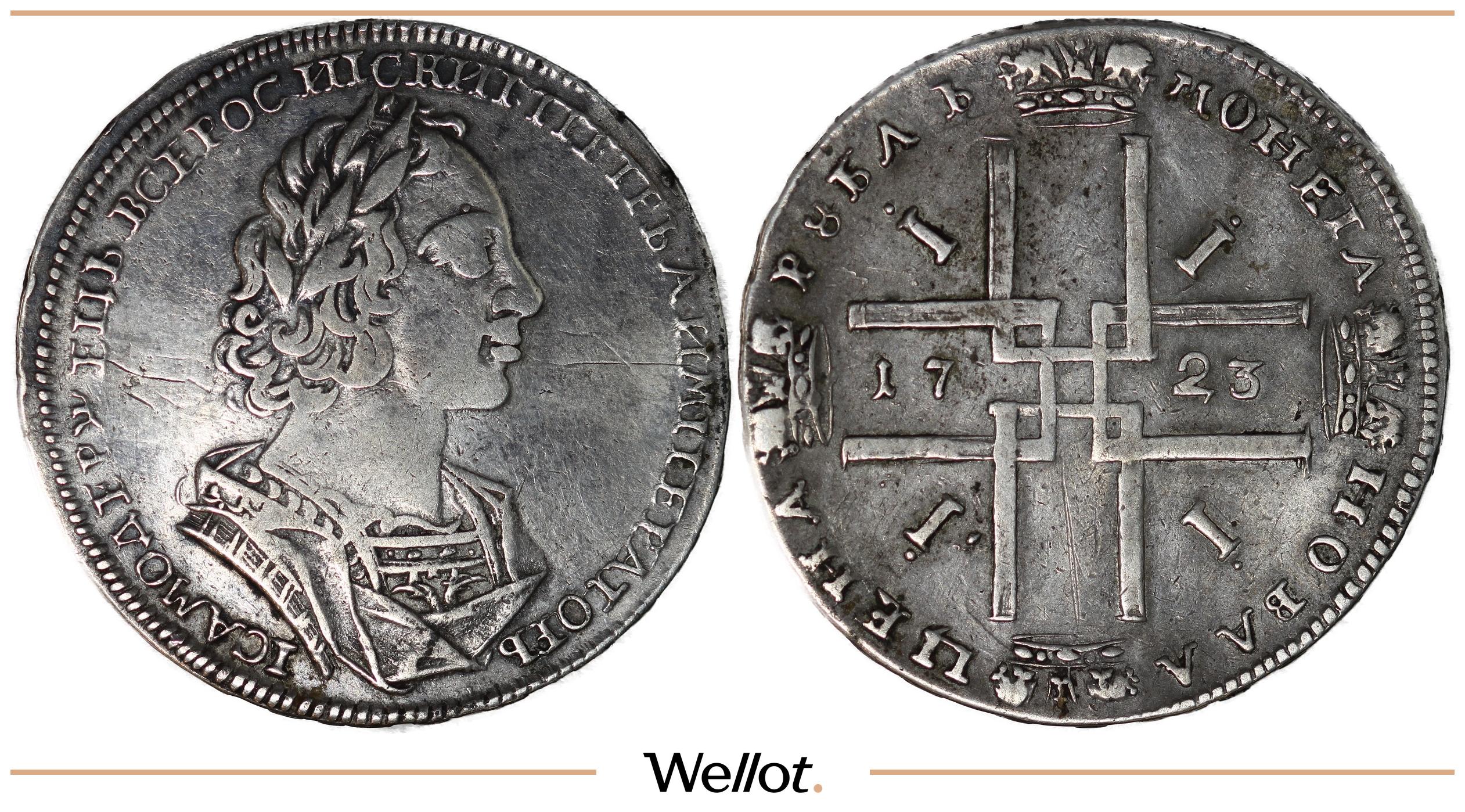 Биткин# 983 (R). 27,60 г. Редкий. С инициалами минцмейстера Осипа Калашникова. Оригинальная патина. Отслоение металла на аверсе.
