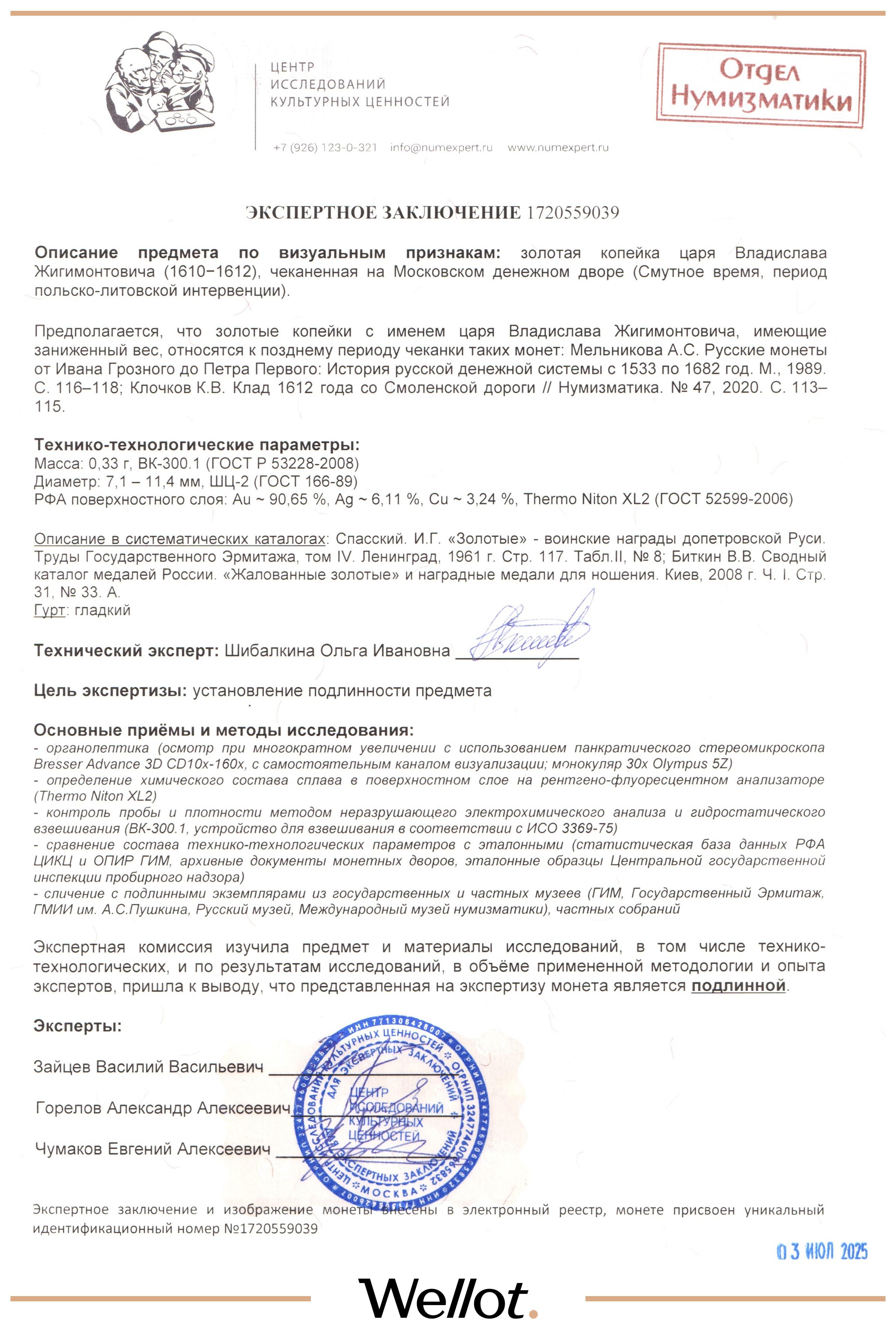 Золотая Копейка 1610-1612 Владислав Жигимонтович Москва UNC