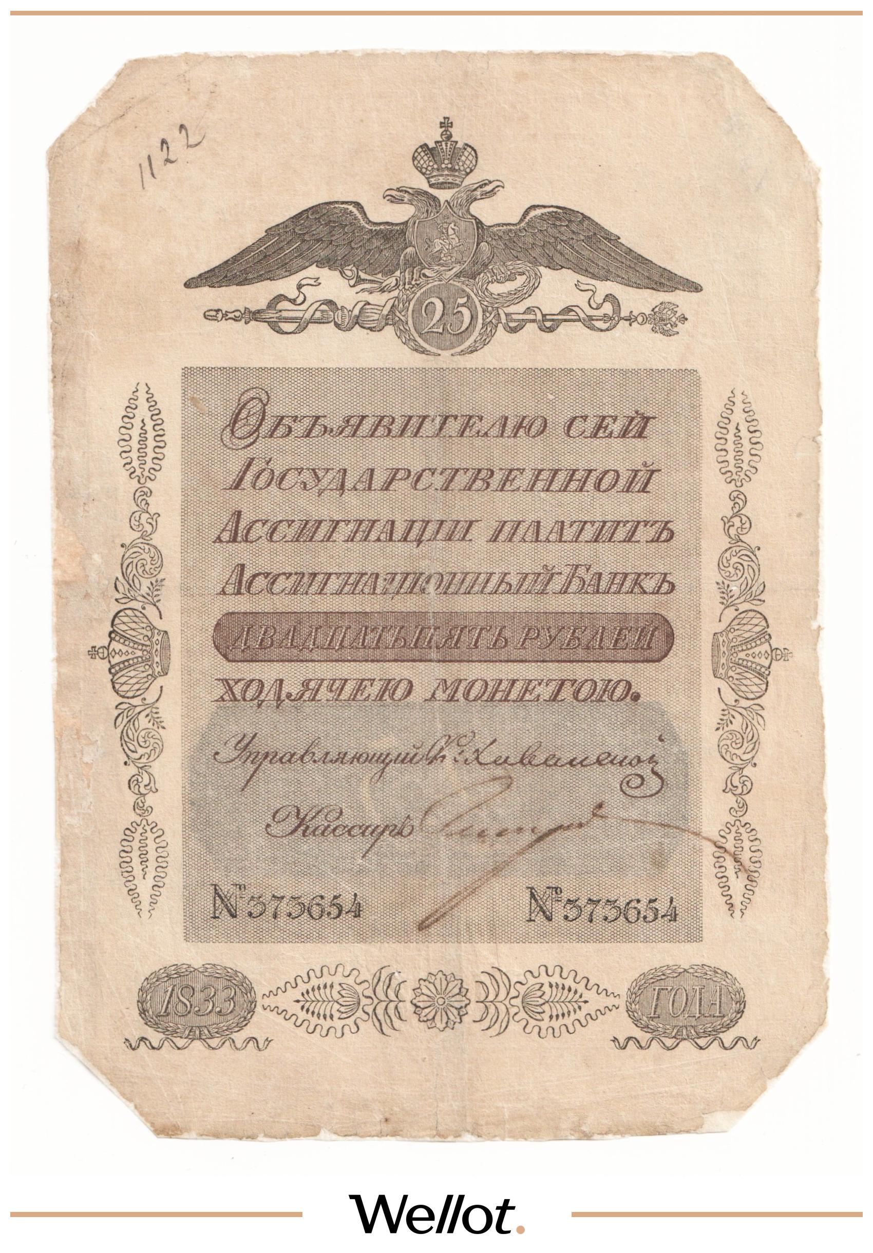 P# A24. Ассигнация. Николай I. Подписи: Хованский / Лунин. Небольшая реставрация. Крепкая бумага. Одна из 12 известных банкнот этого года. Чрезвычайная редкость!