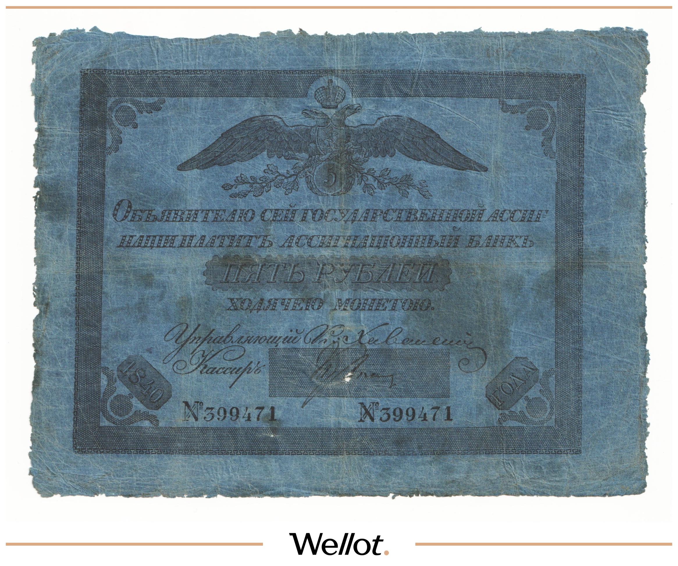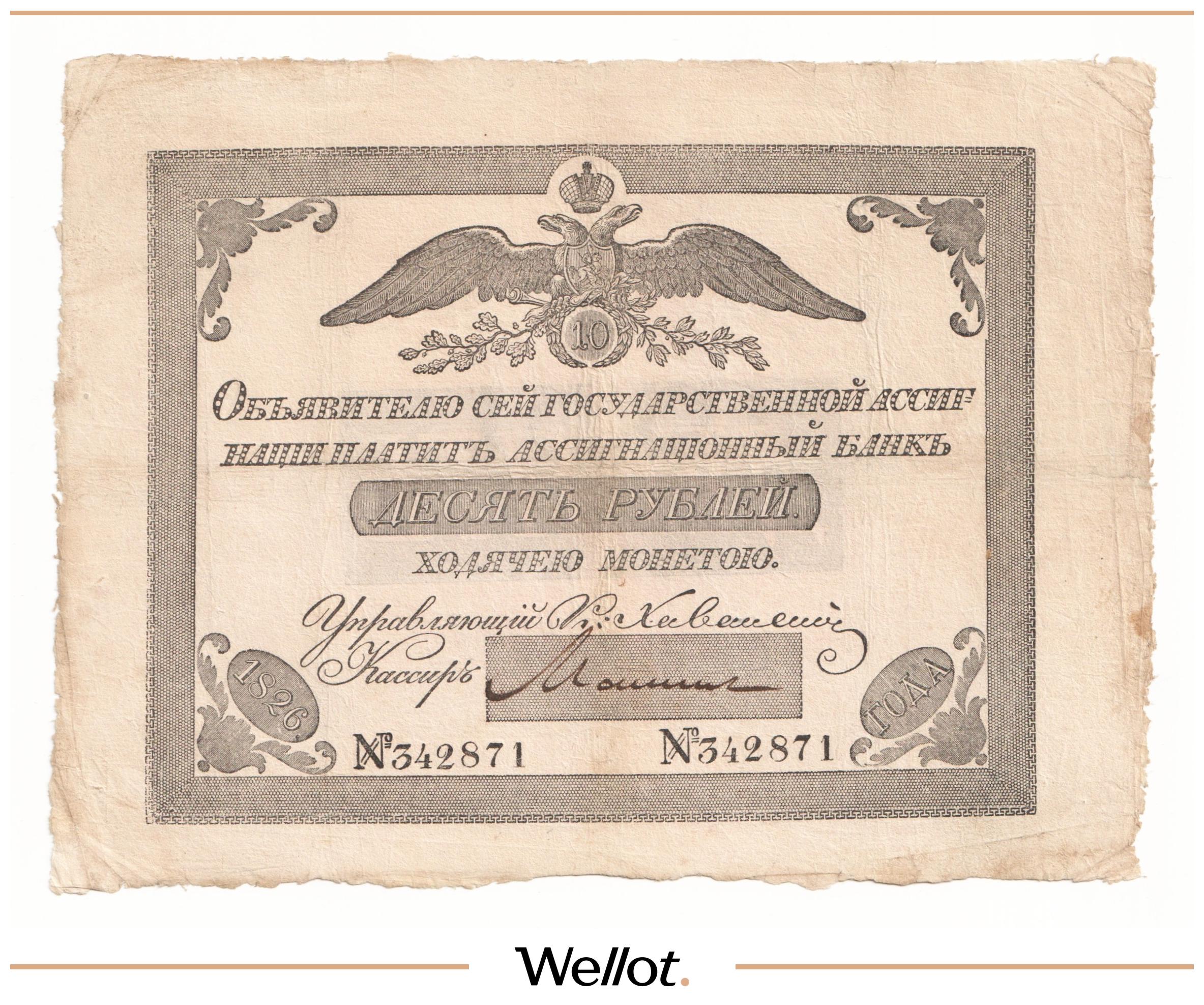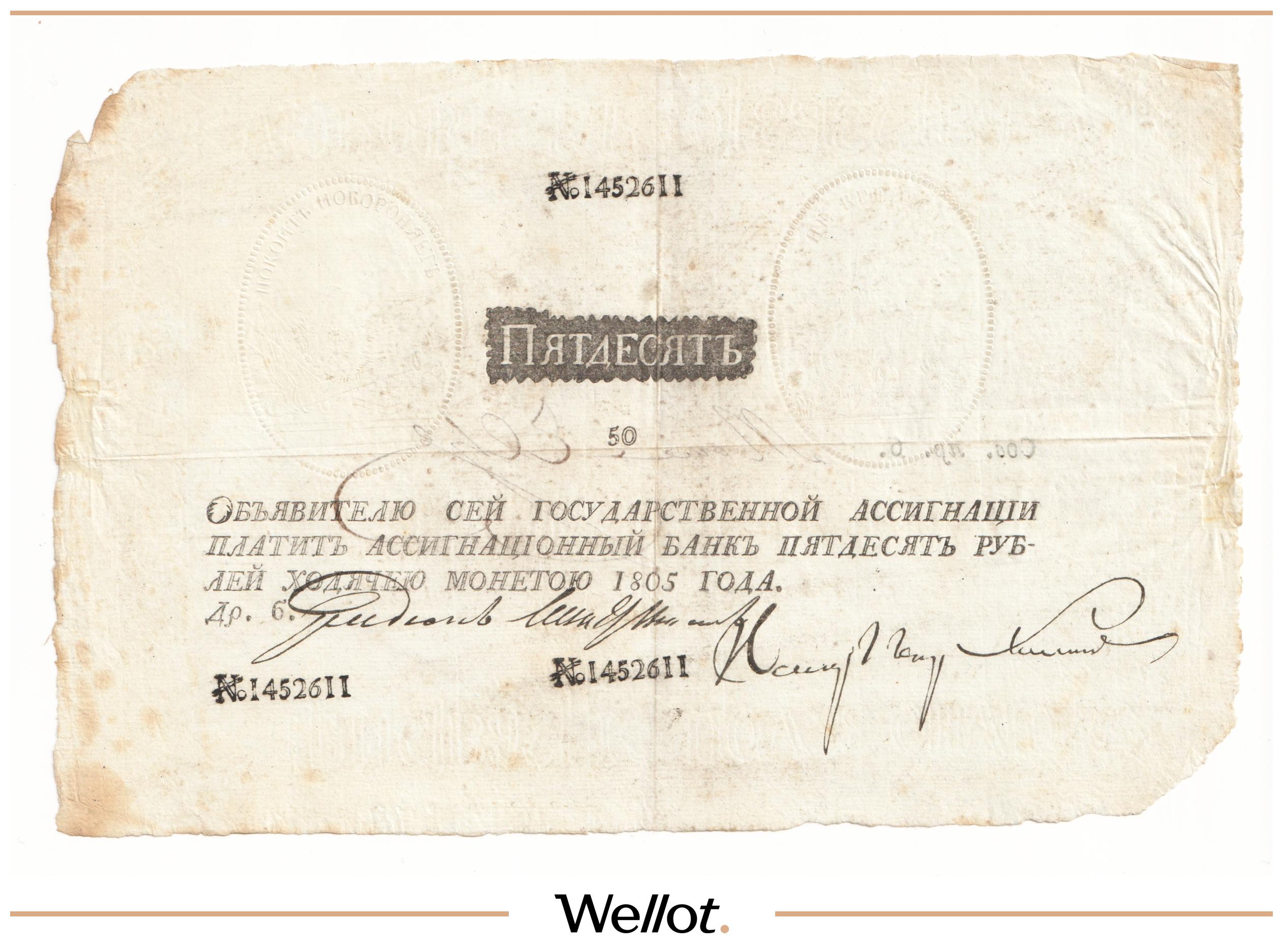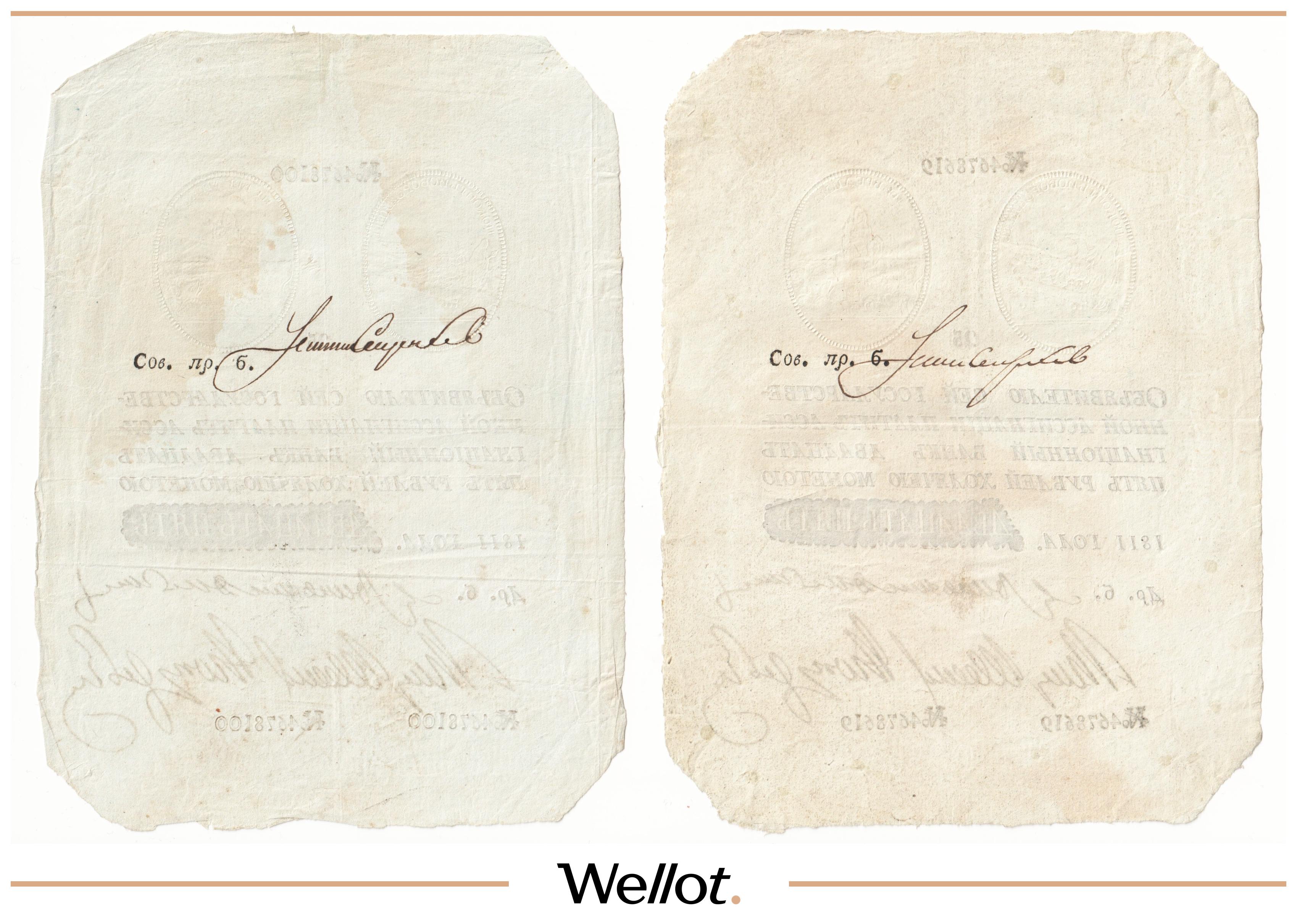 Крупный формат (200 х 170 мм) и монументальный дизайн этой купюры делает ее одним из самых впечатляющих бумажных денежных знаков первой половины XIX века. Перед вами значимый исторический артефакт и украшение любой серьёзной коллекции.