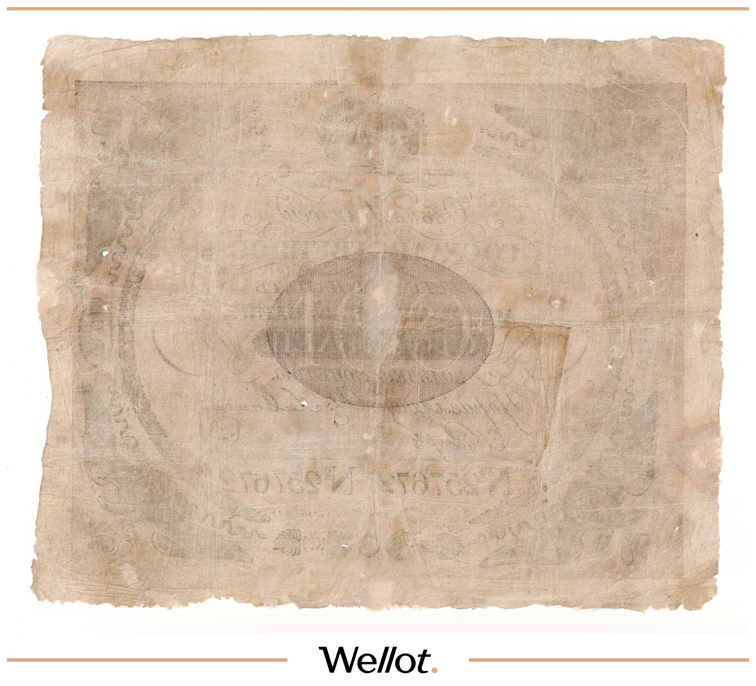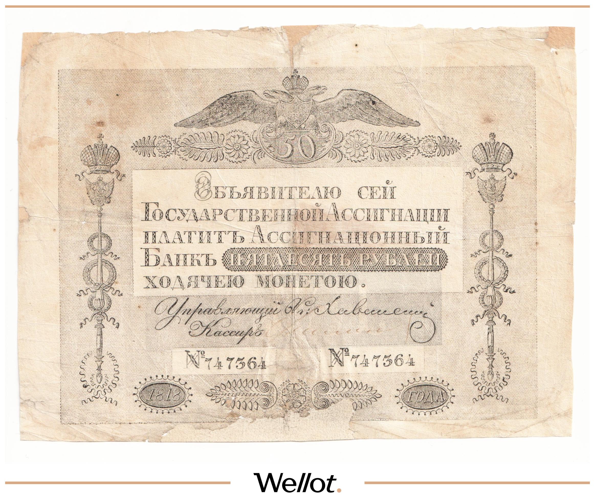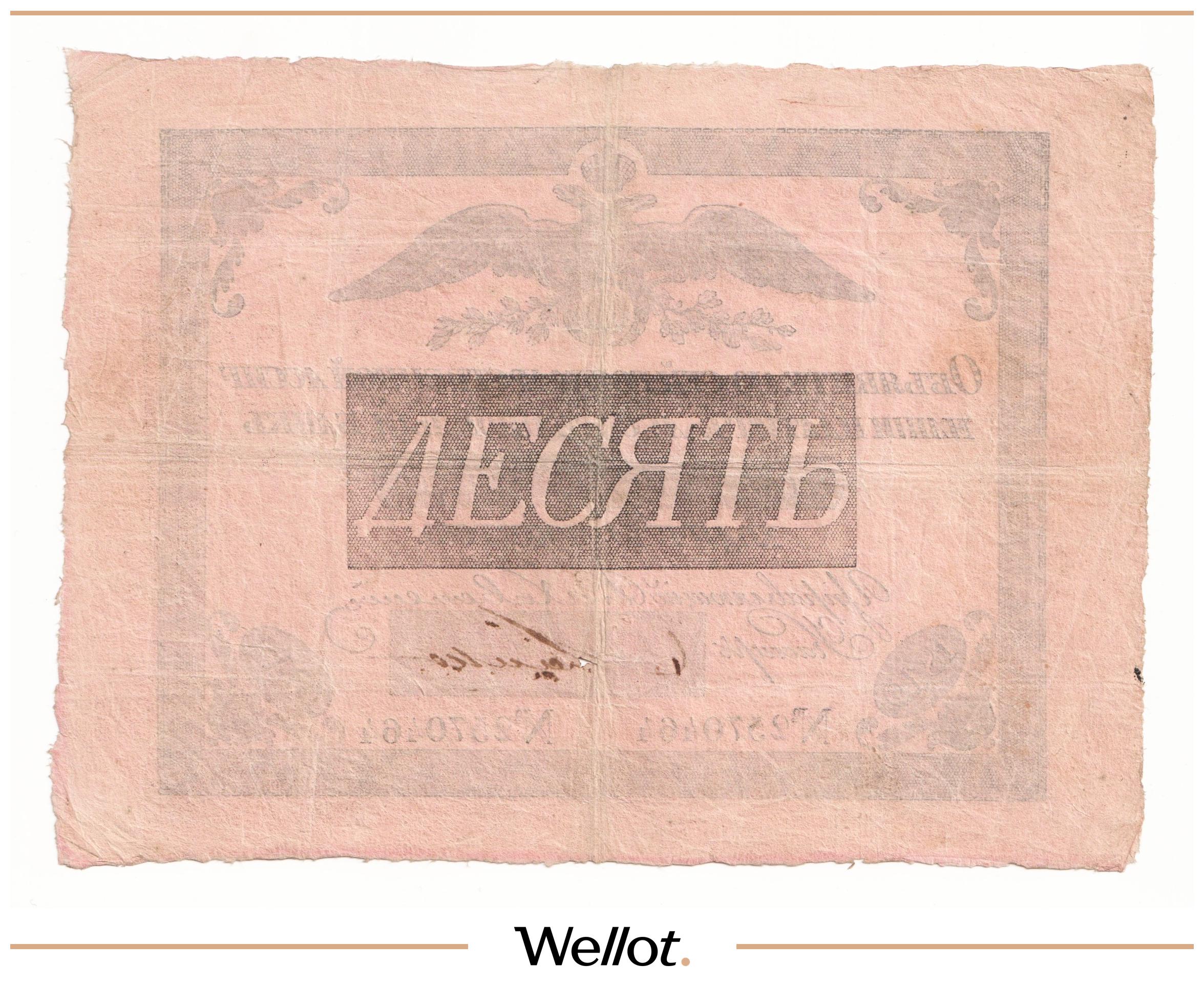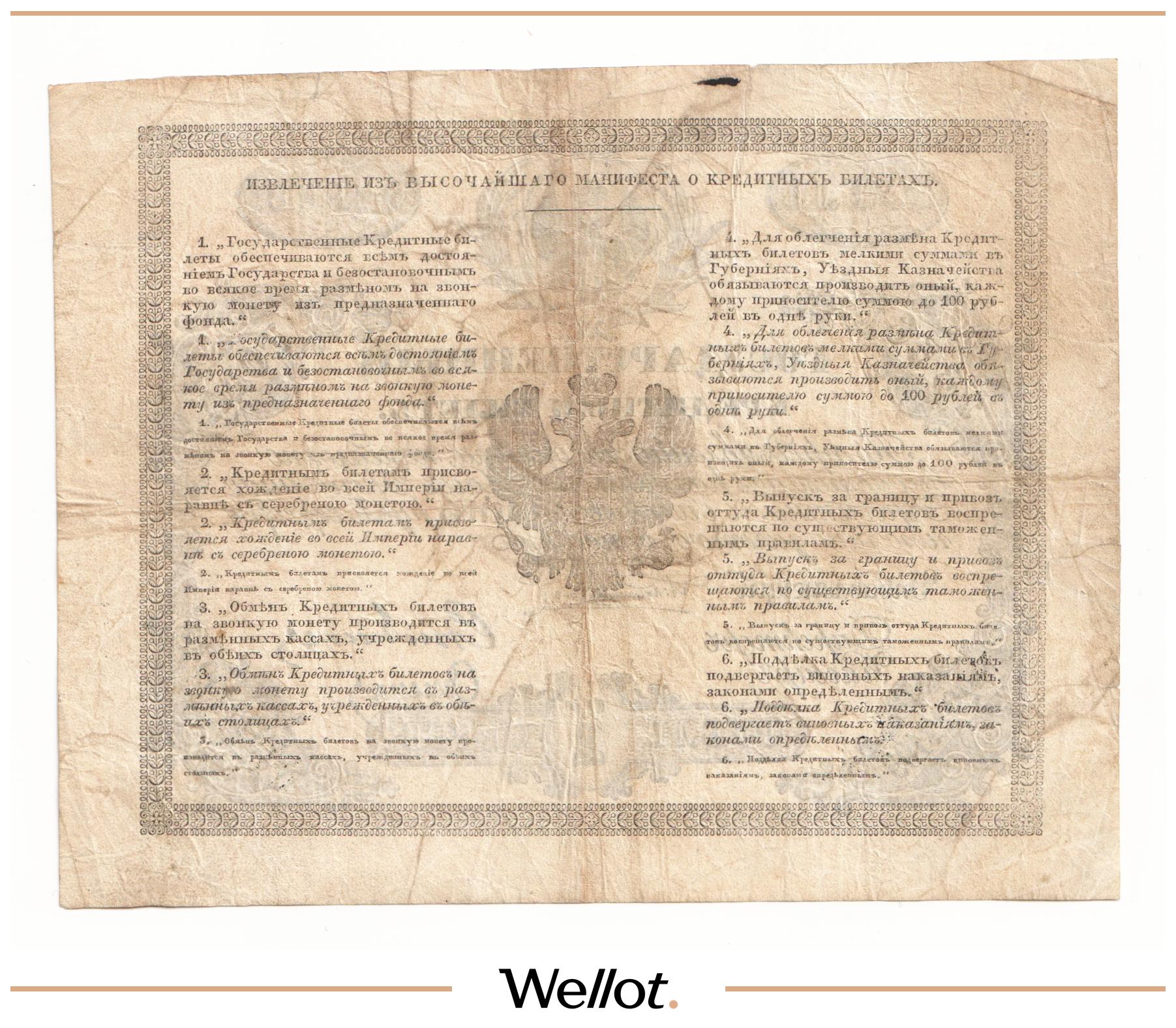 Крупный формат (200 х 170 мм) и монументальный дизайн этой купюры делает ее одним из самых впечатляющих бумажных денежных знаков первой половины XIX века. Перед вами значимый исторический артефакт и украшение любой серьёзной коллекции.