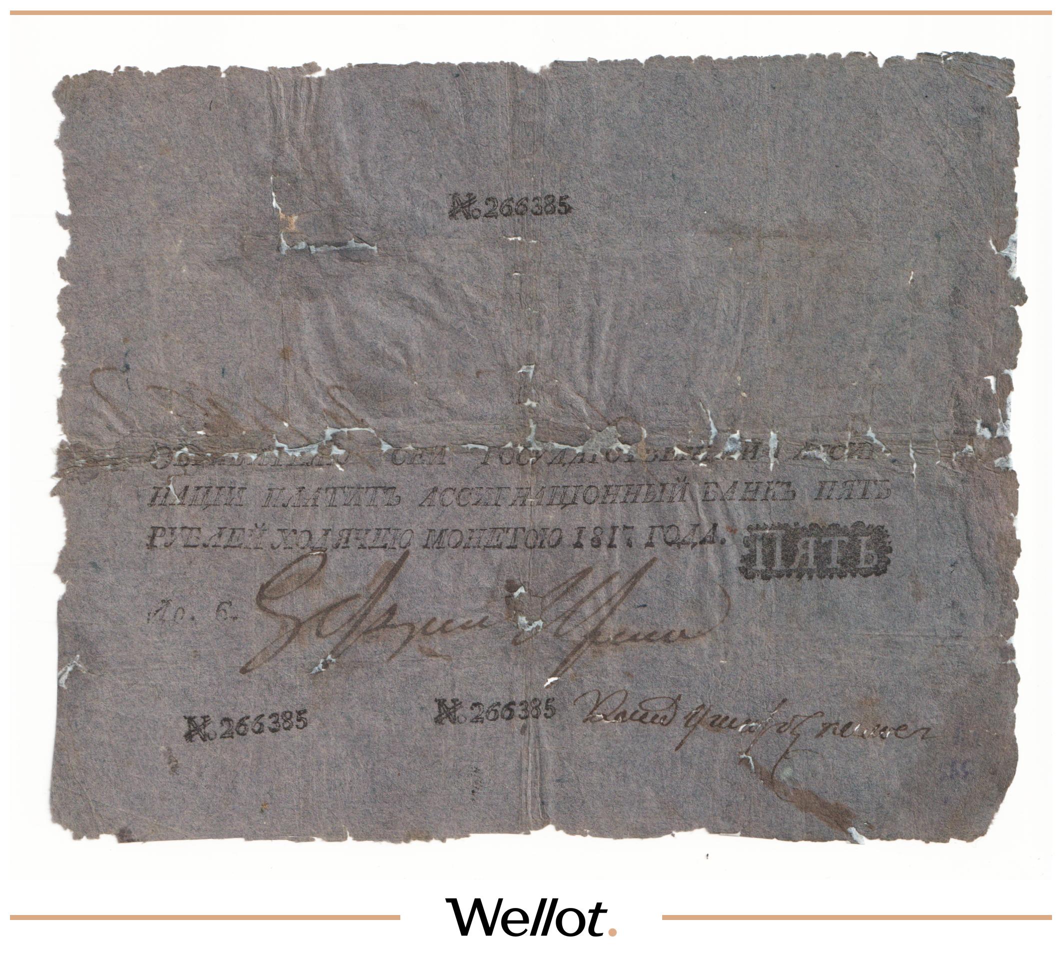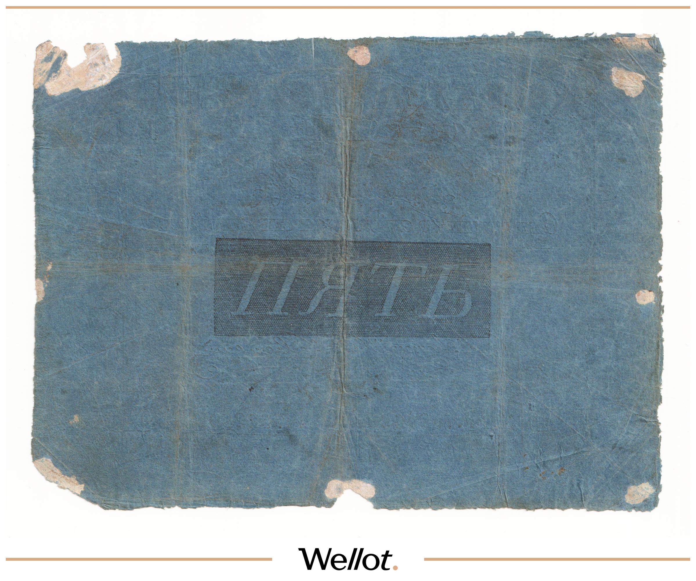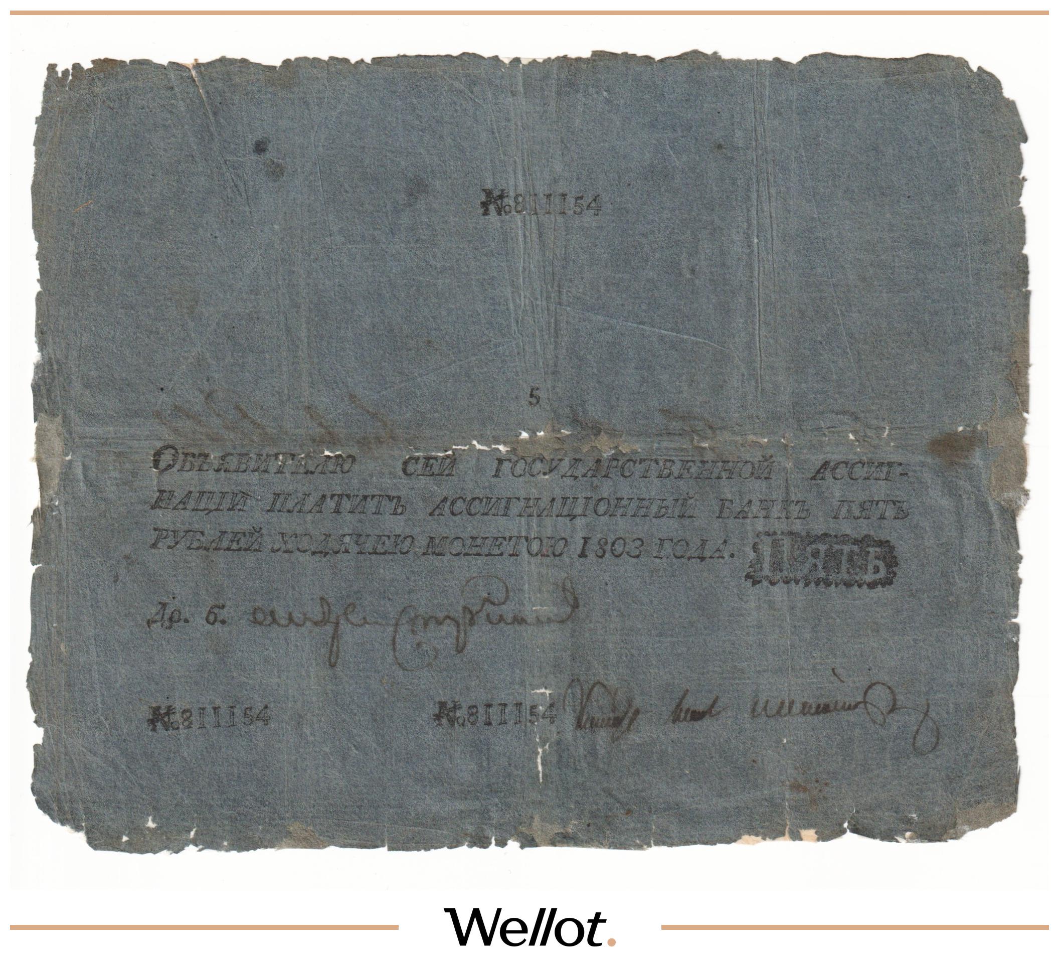 P# A8. Ассигнация. Александр I. Реставрация. По реестру Иванкина Ф.Ф. и Кузнецова А.Ю. известно всего лишь 17 банкнот этого года. Последняя дата на пятирублевых ассигнациях II типа. Редкие.