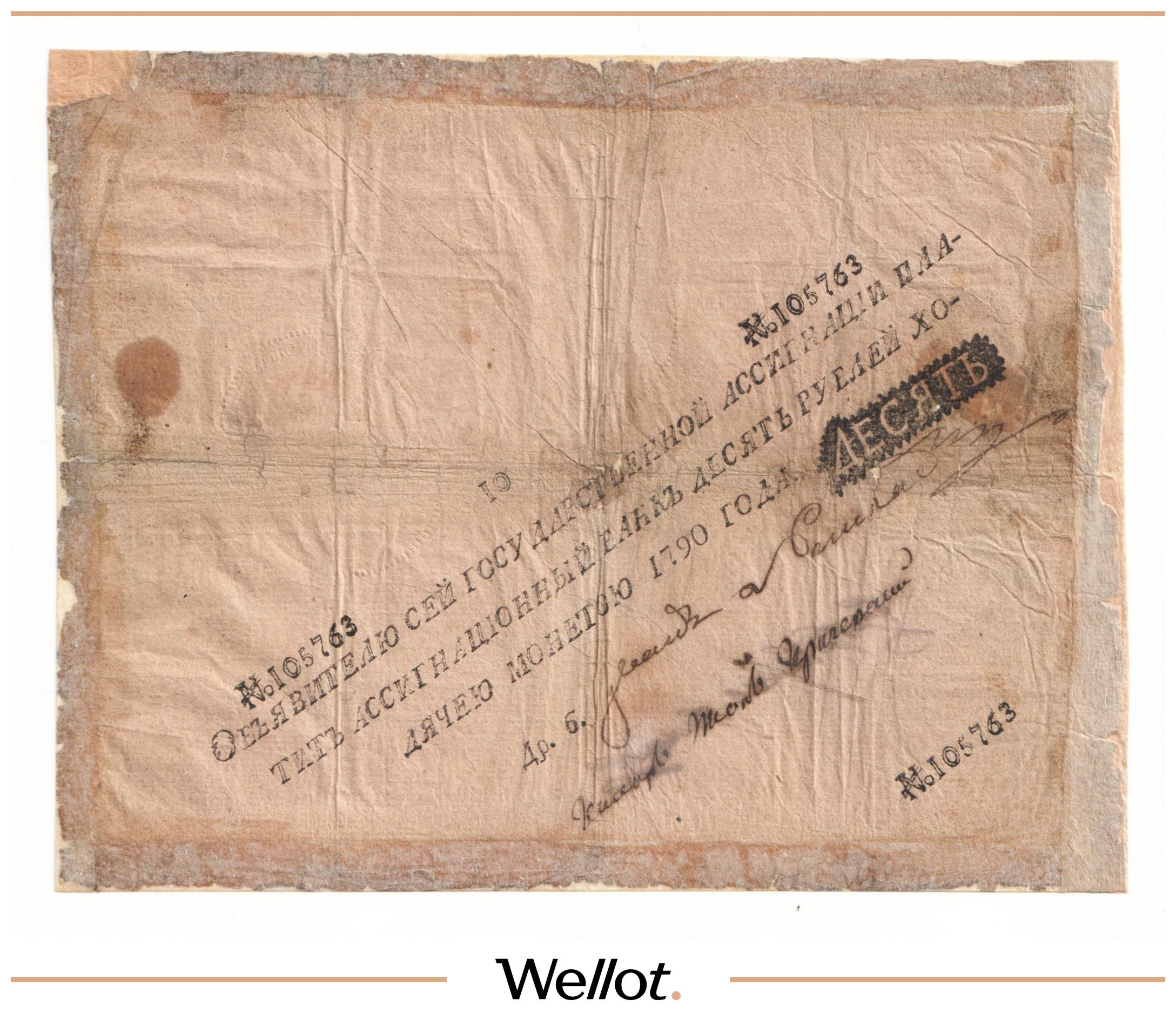 P# A10. Ассигнация. Павел I. Реставрация. По реестру Иванкина Ф.Ф. и Кузнецова А.Ю. известно всего лишь 10 банкнот этого года. Крупный номинал. Ранняя датировка. Чрезвычайная редкость!