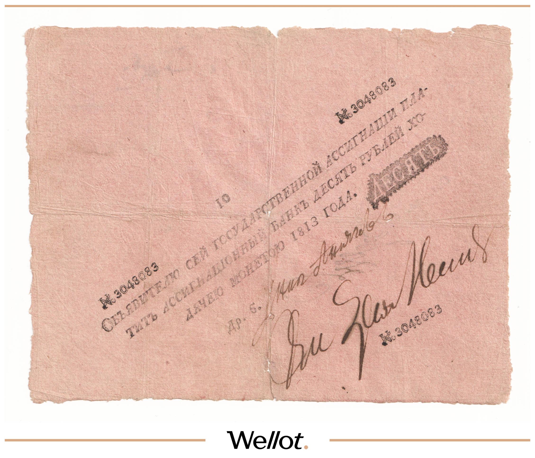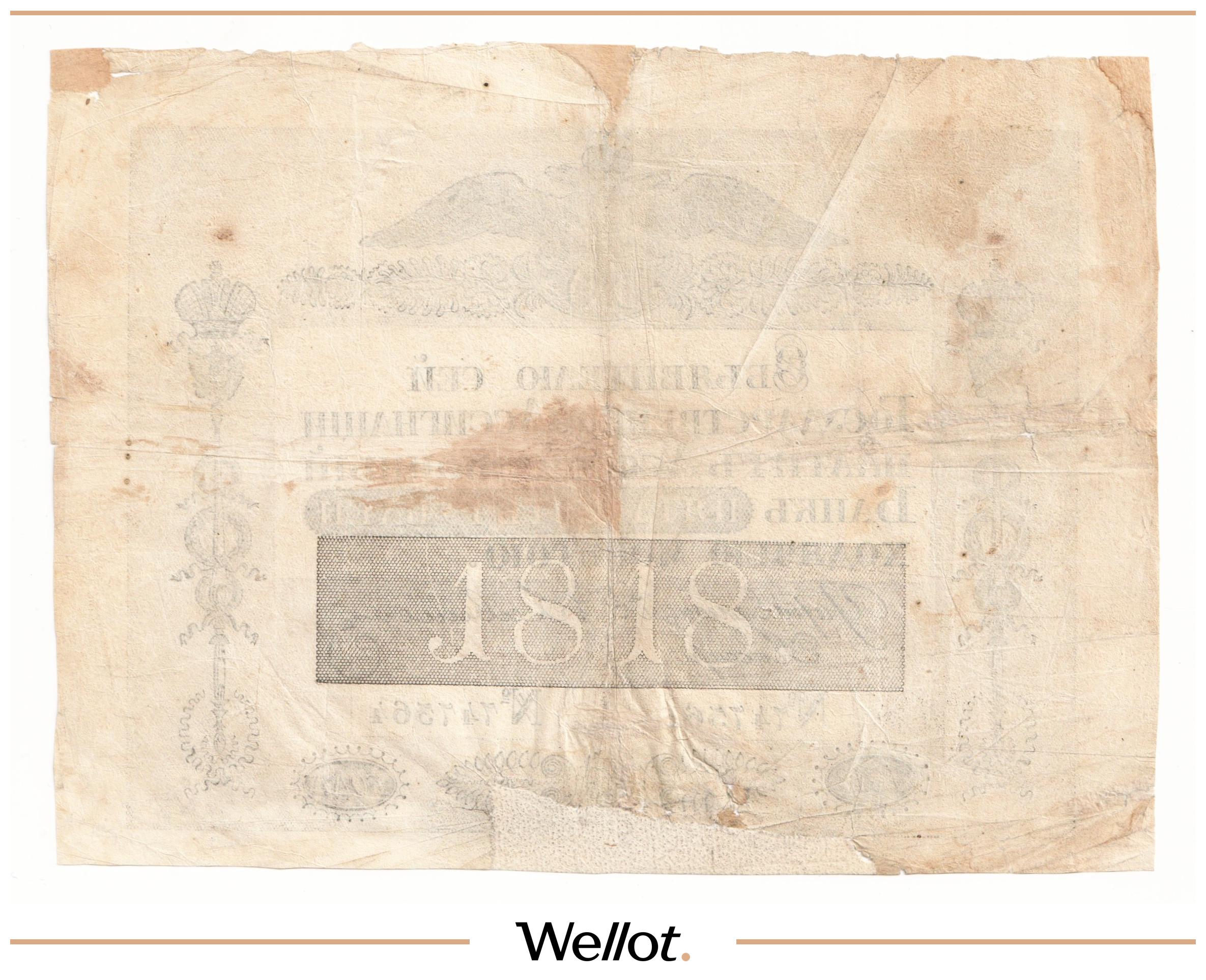 P# A10. Ассигнация. Александр I. Реставрация. По реестру Иванкина Ф.Ф. и Кузнецова А.Ю. известно 14 банкнот этого года. Крупный номинал. Очень редкие.