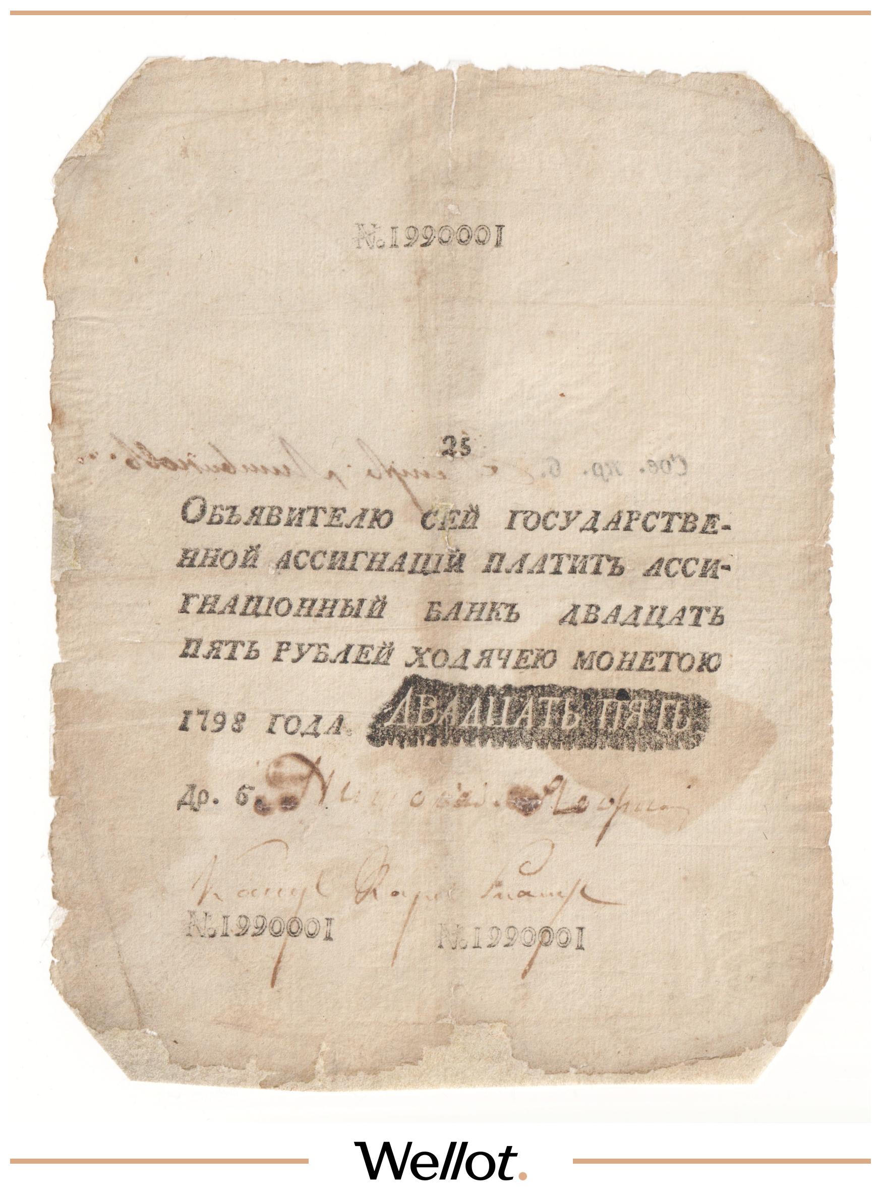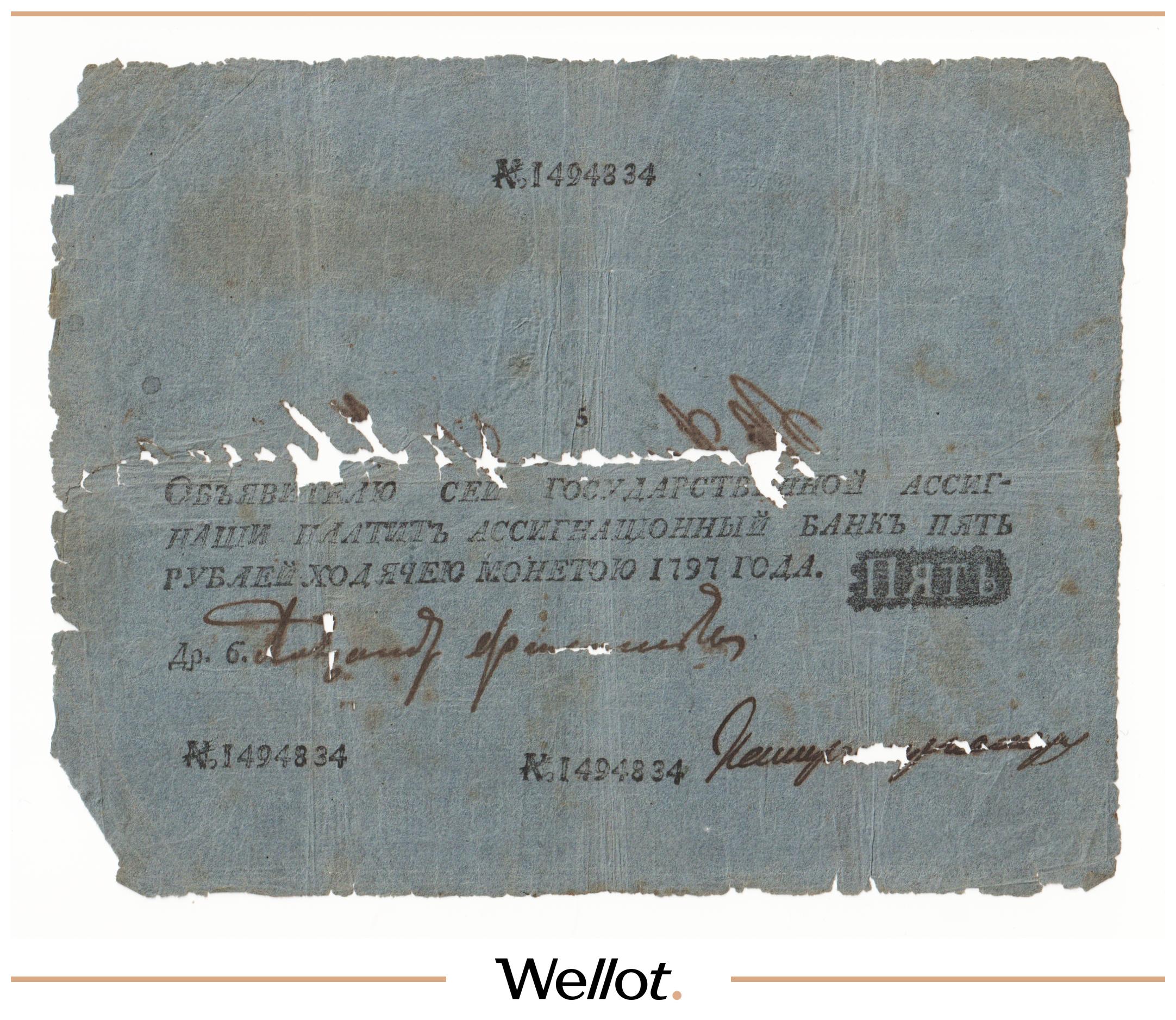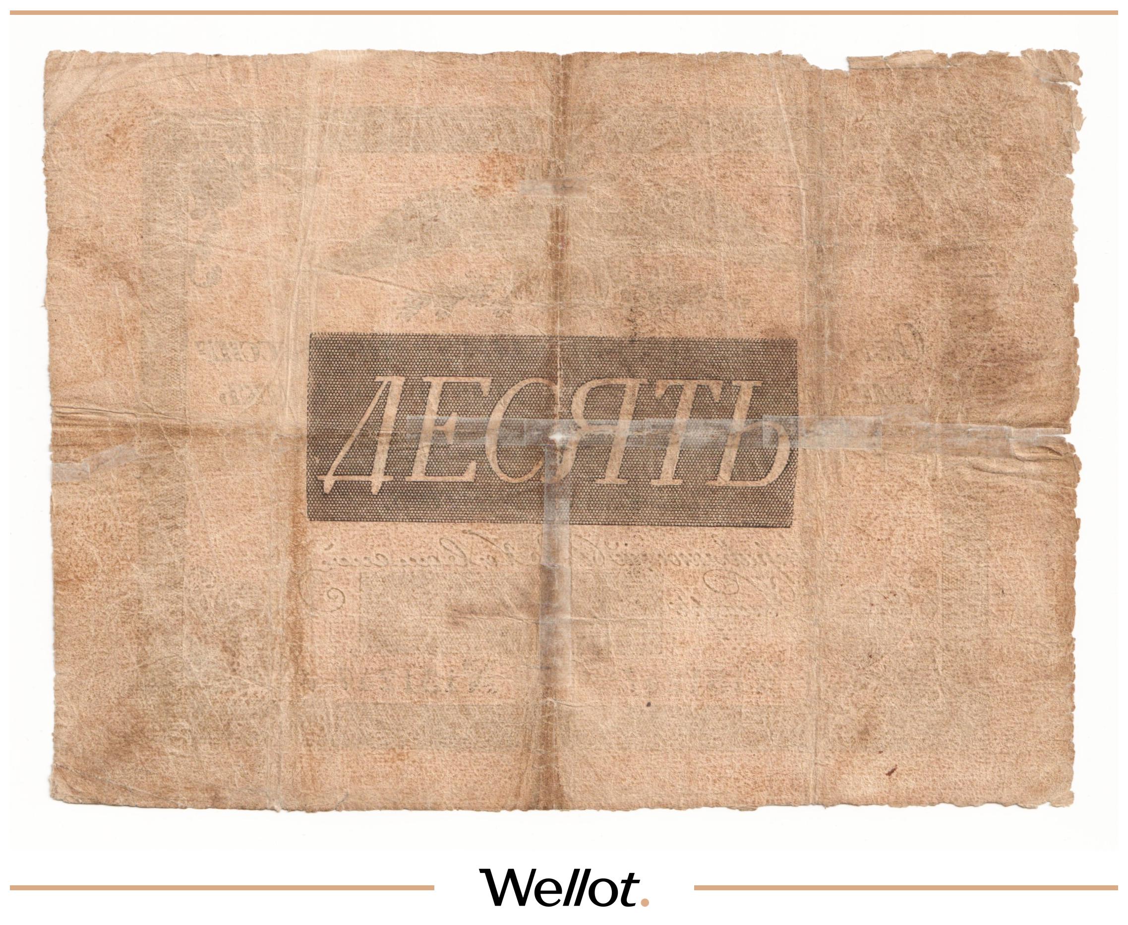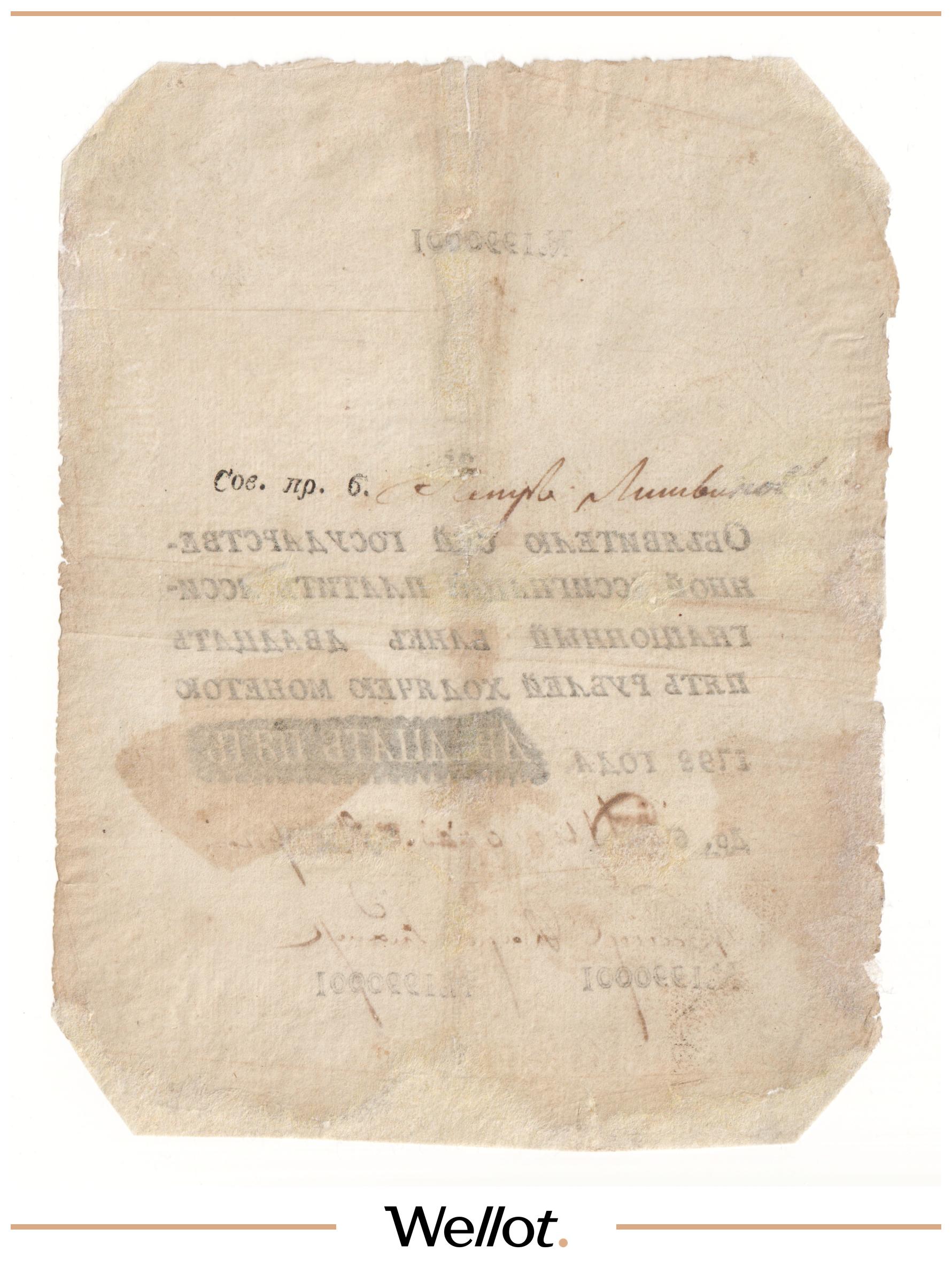 P# A9. Ассигнация. Павел I. Небольшая реставрация (подклейка). По реестру Иванкина Ф.Ф. и Кузнецова А.Ю. известно всего лишь 15 банкнот этого года. Ранняя датировка. Очень хорошая сохранность. Исключительно редки, особенно в таком состоянии.