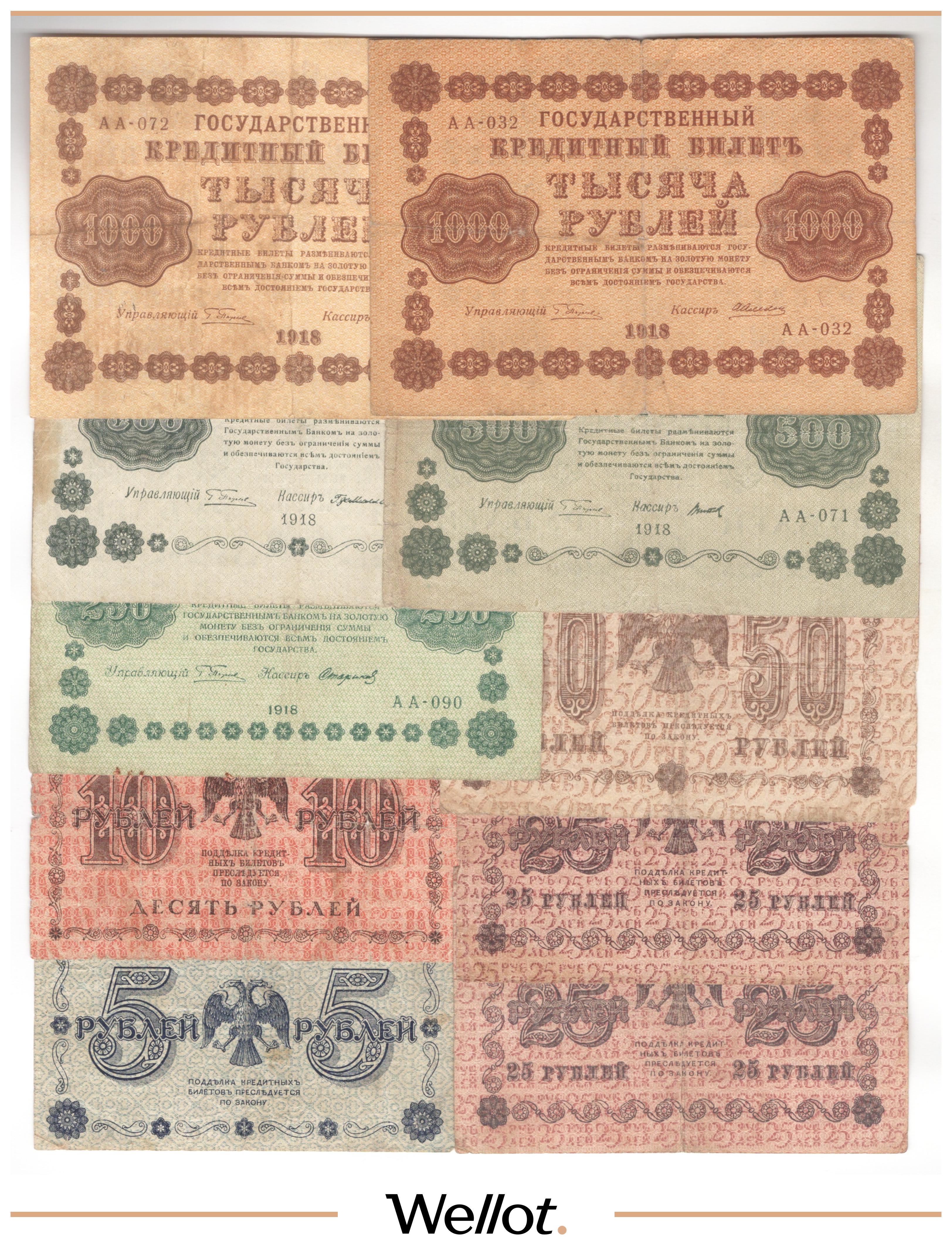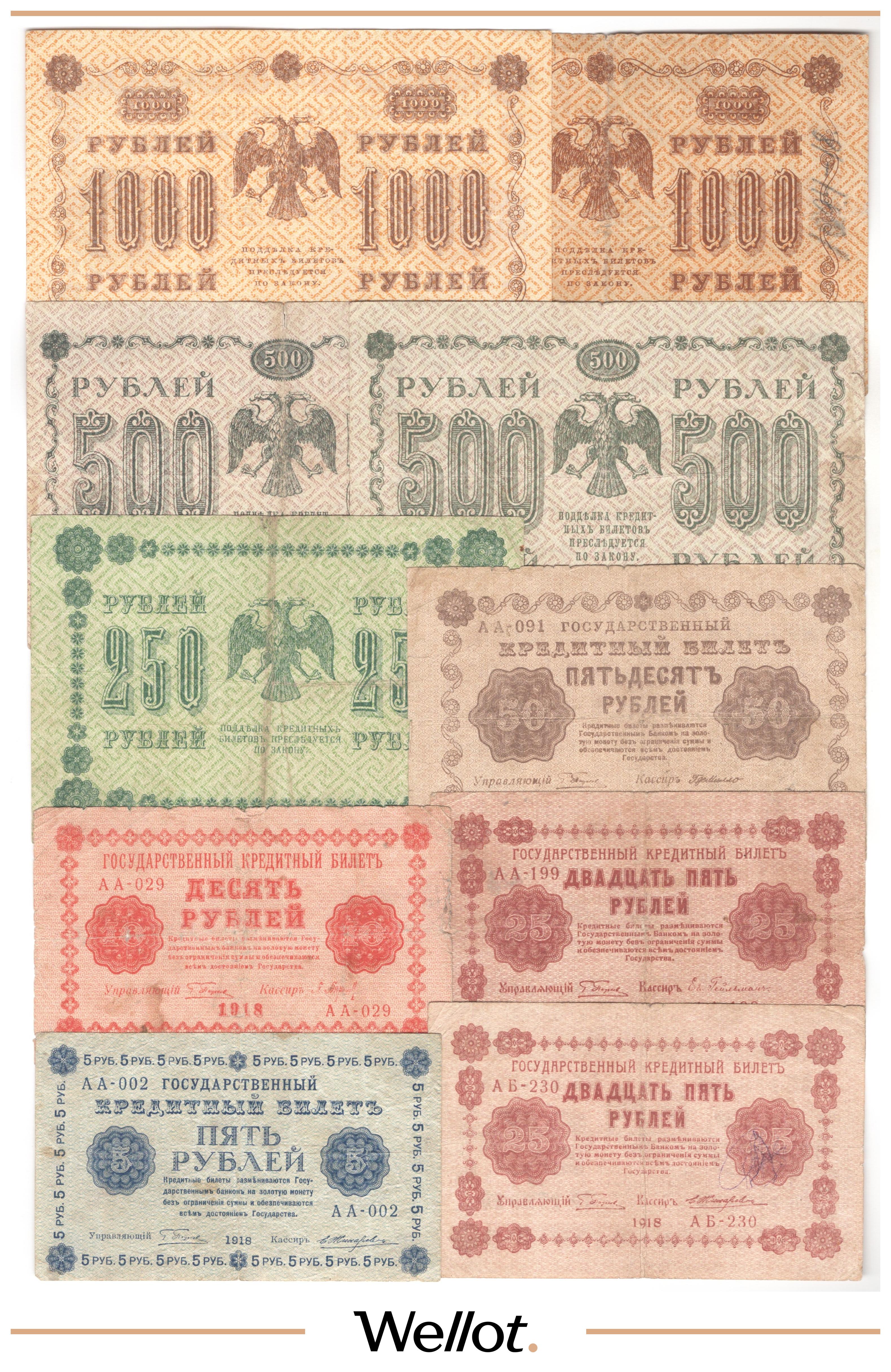 5-10-25-50-250-500-1000 Рублей 1918 Россия РСФСР 10шт