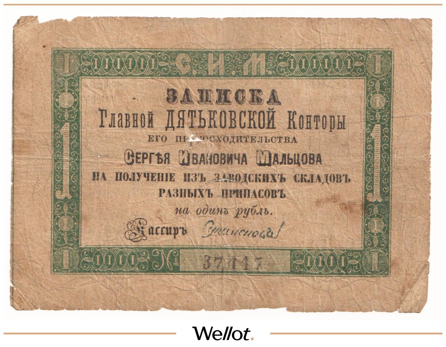 Рябченко# 1746р. Записка главной Дятьковской конторы. Подпись кассира факсимильная. Водяной знак: "1 Руб.". II-й выпуск. Нечастые.