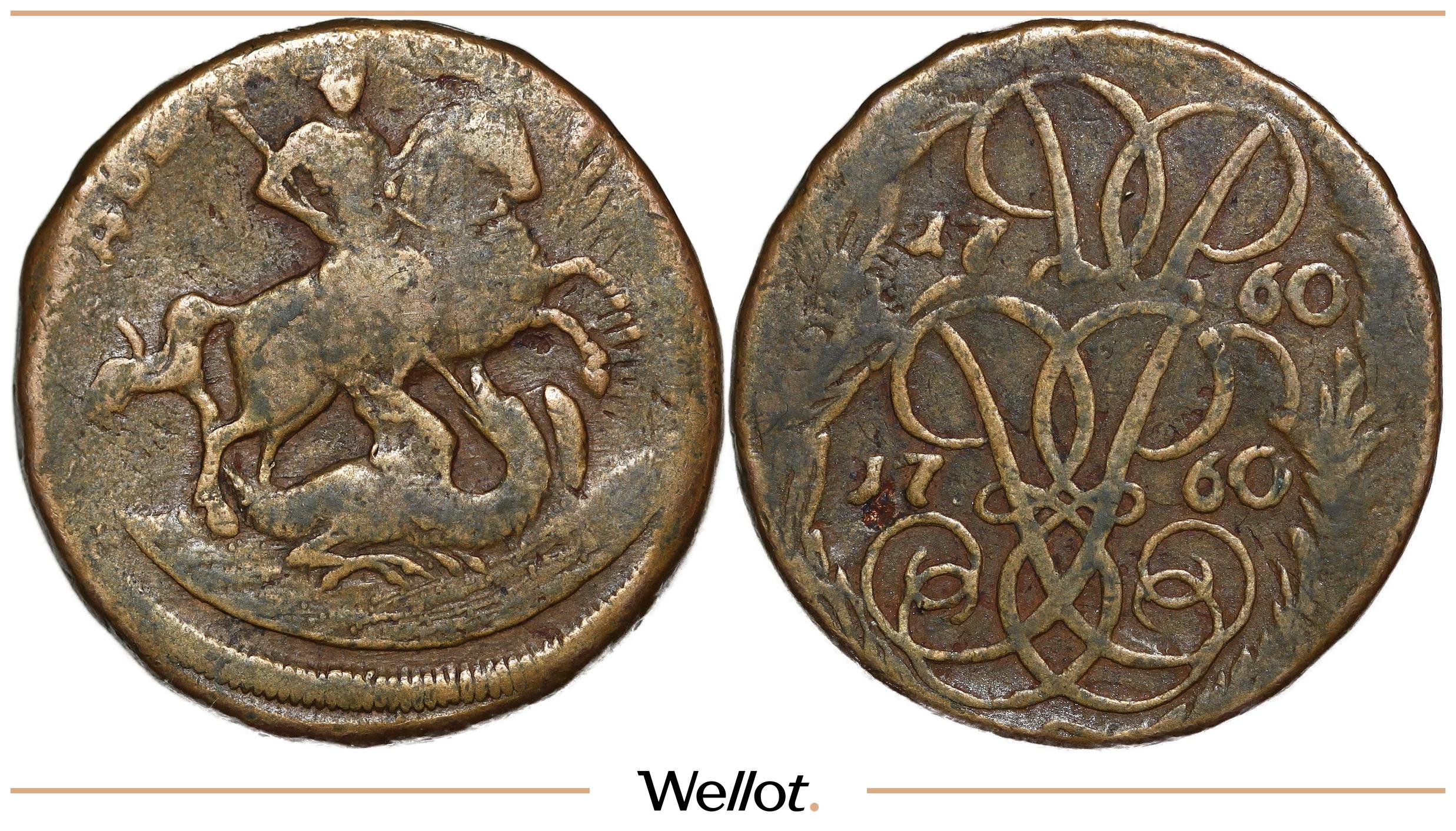 Биткин# 455. Номинал над Св. Георгием. Екатеринбургский гурт. Медь. 21,64 г. Тираж 595614. Кабинетная патина. Интересный брак - двойное соударение штемпелей с одной стороны монеты с сильным смещением. По технологии чеканки аверс тоже должен быть с двойным ударом со смещением, но брак чеканки только с одной стороны монеты.