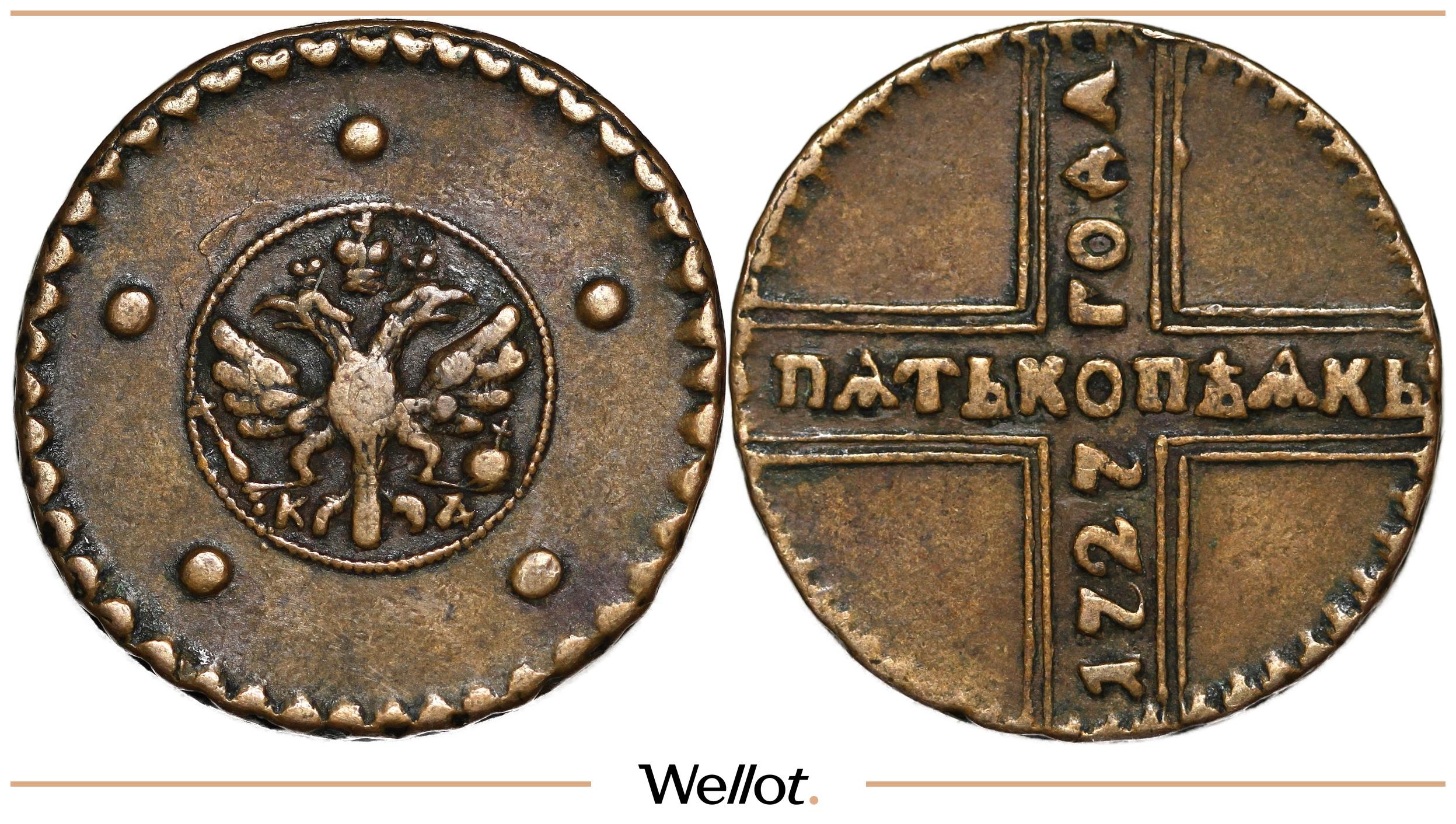 Биткин# 313. Медь. Великолепное коллекционное состояние, высокая детализация рельефа и центровка штемпеля. Легкая коррозия на аверсе.