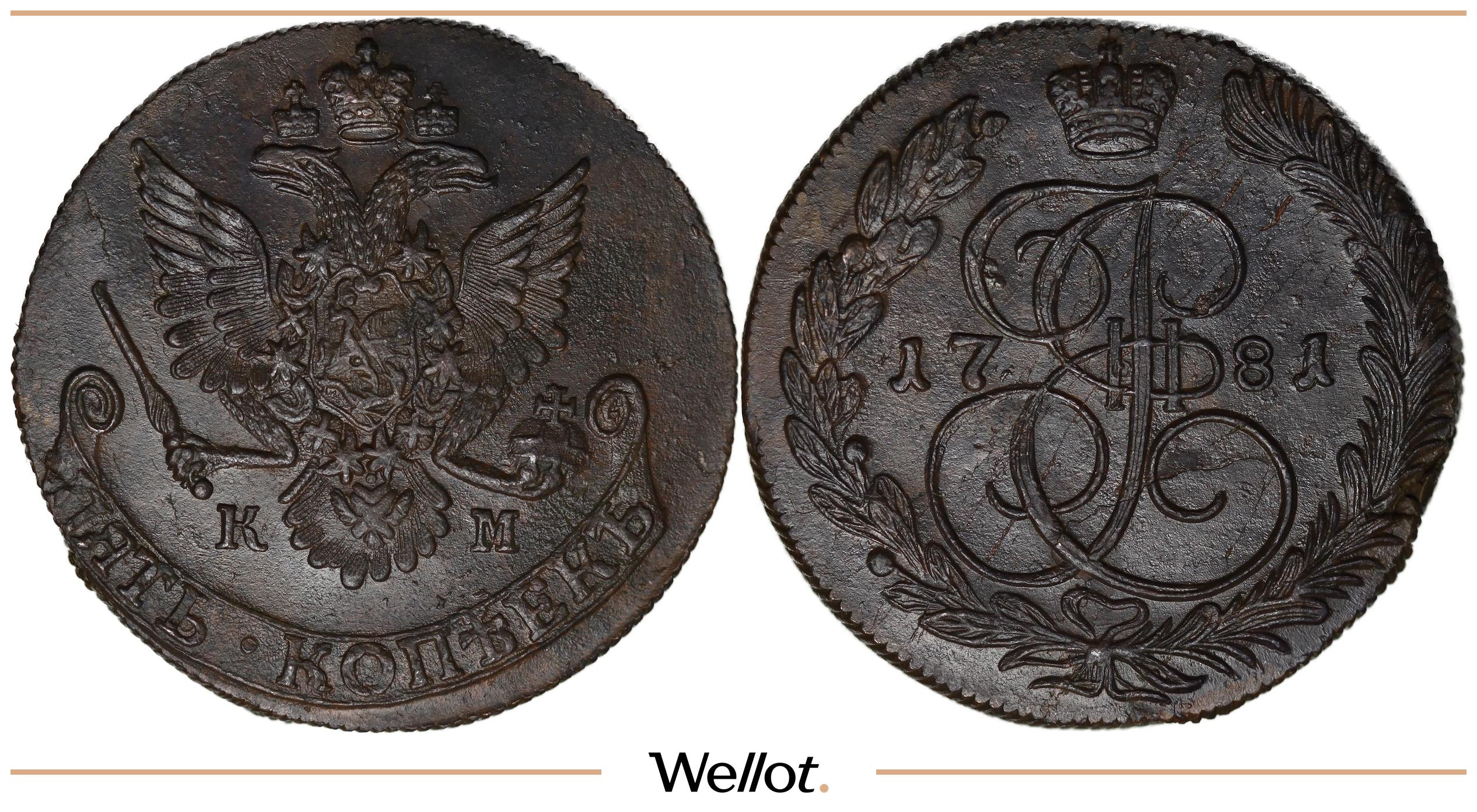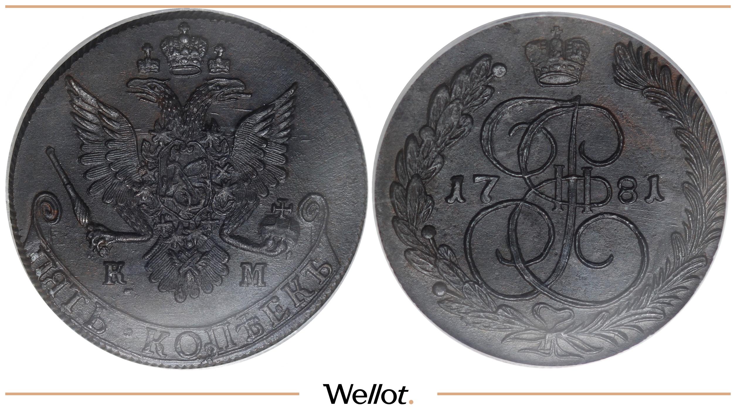 5 Копеек 1781 КМ Екатерина II PCGS MS62BN