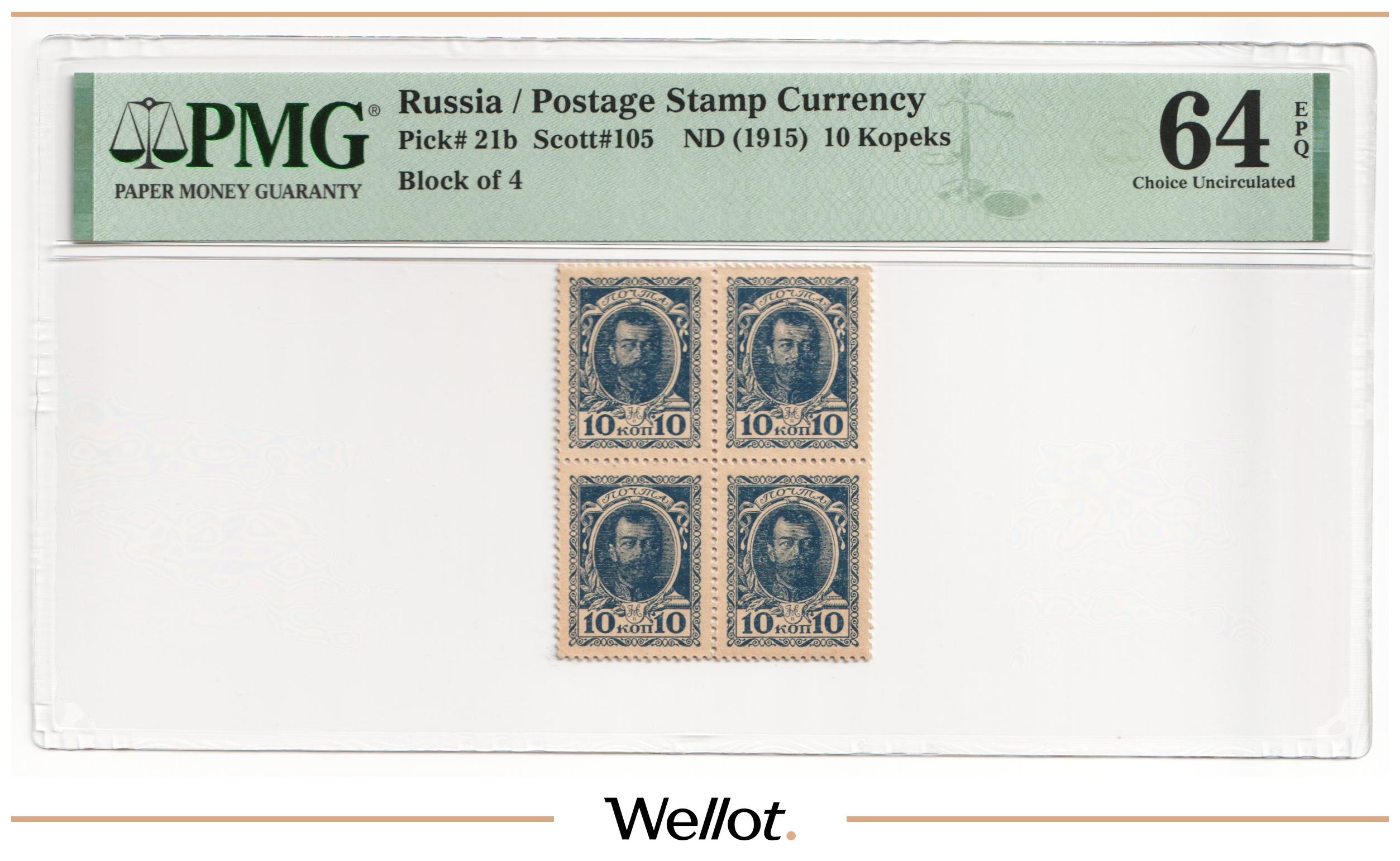 10 Копеек ND (1915) Российская Империя Квартблок PMG 64 EPQ UNC