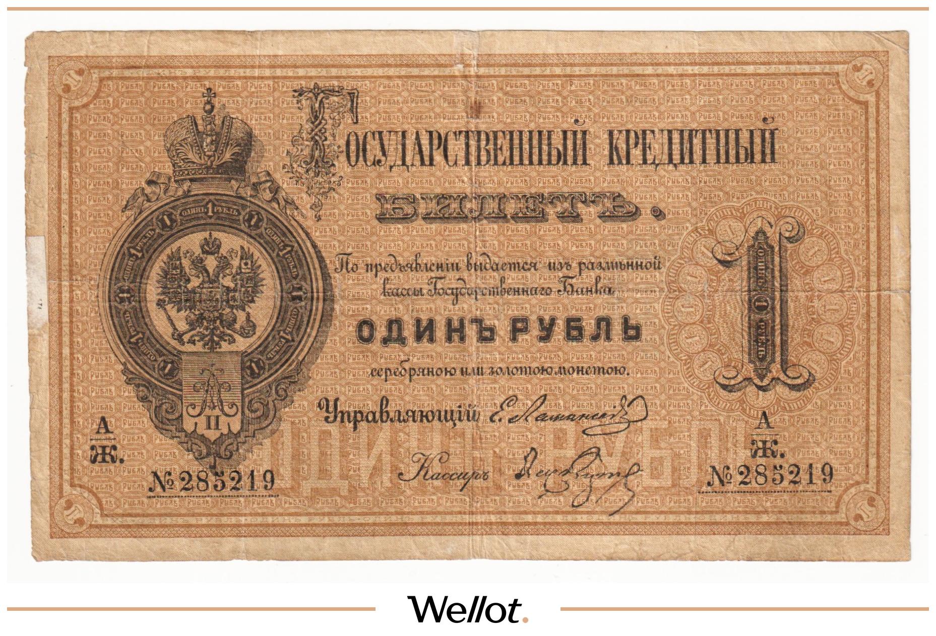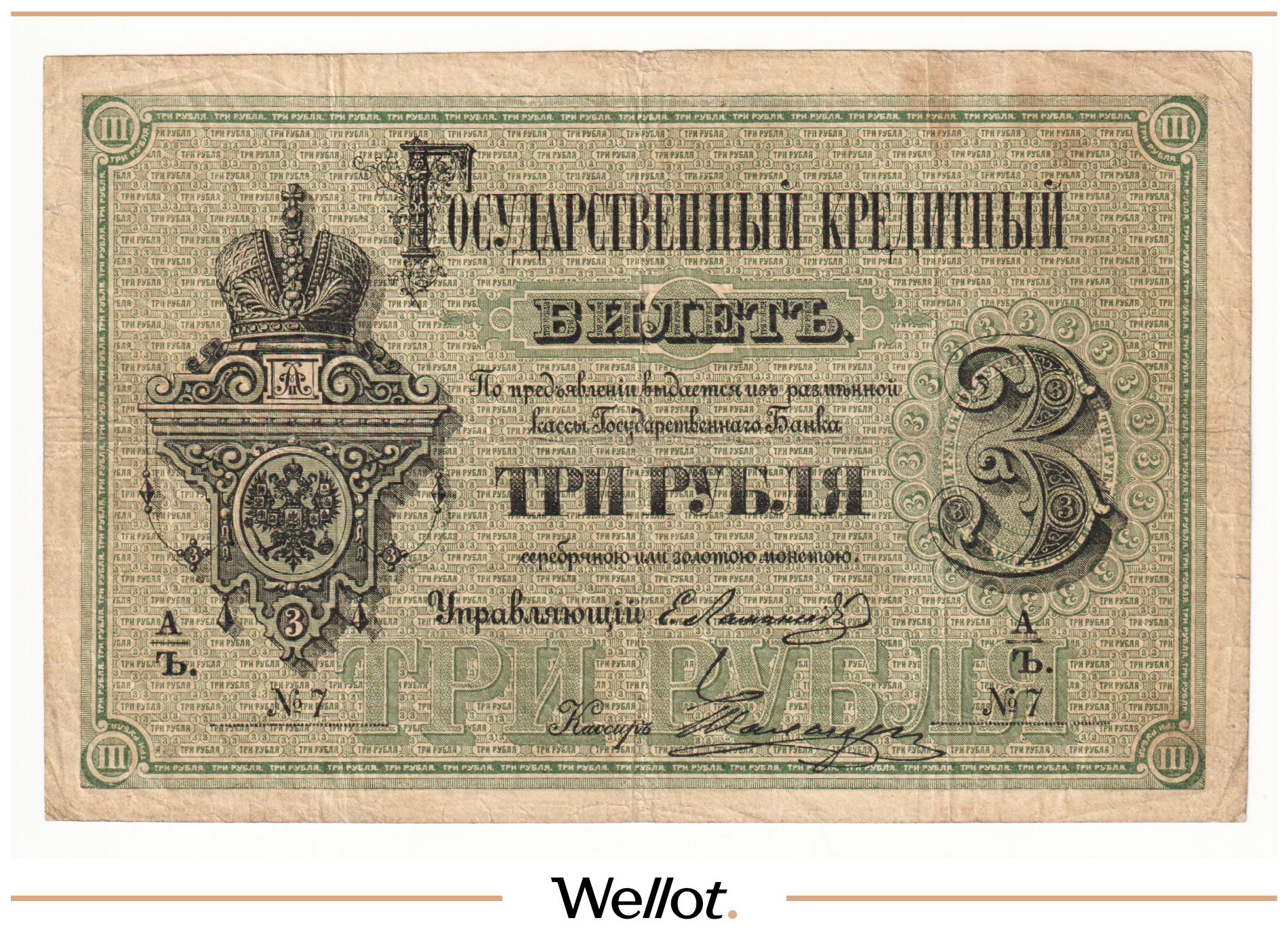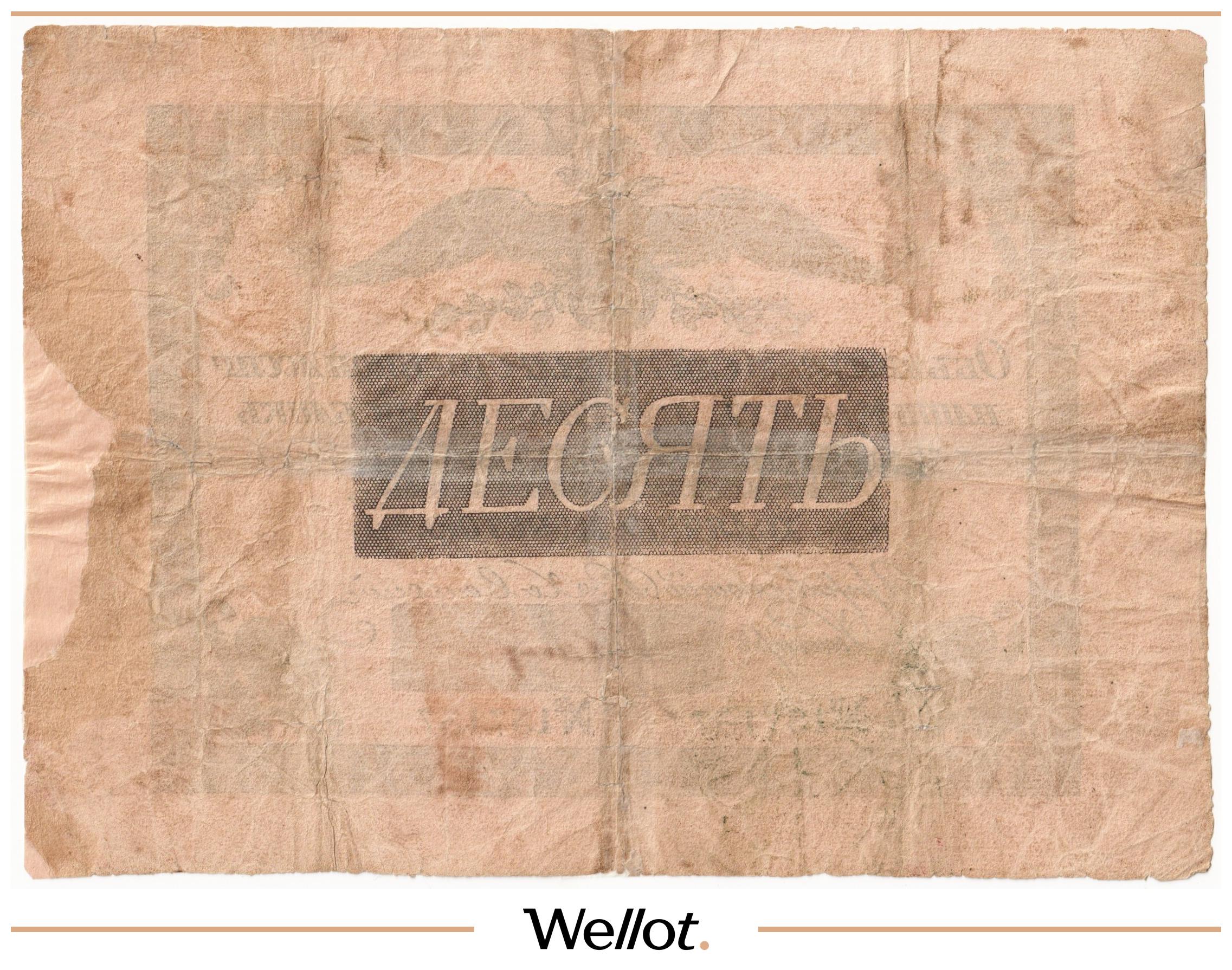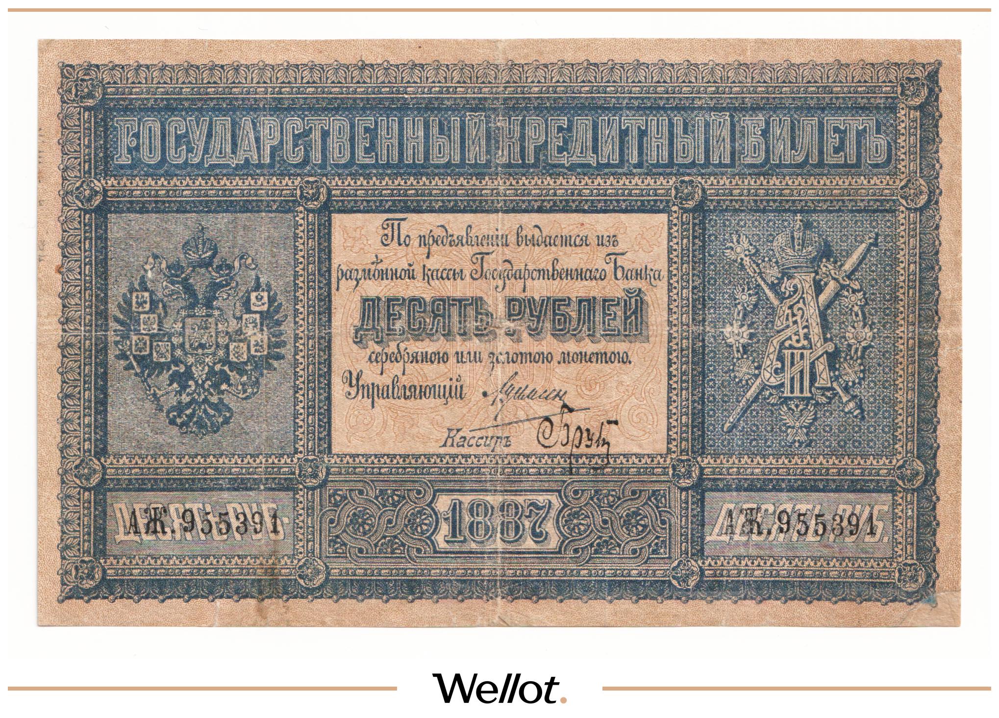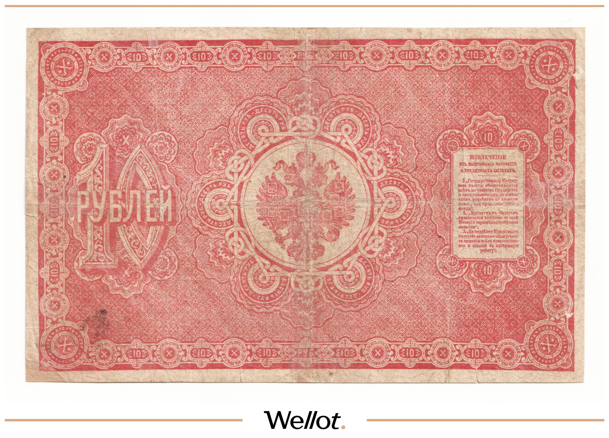 P# A57. Подписи: Цимсен - Брут. Подделка Леона Варнерке в ущерб обращению. Большинство знаков этого типа были изъяты из обращения и погашены. По имеющейся у нас информации это третий известный непогашенный экземпляр. В каталоге А.Алямкина "Государственные законные платежные средства без ограничений" такие банкноты обозначены "RRR" (известно не более 10 штук). Учитывая редкость, отсутствие гашения, данный экземпляр представляет особою коллекционную ценность.