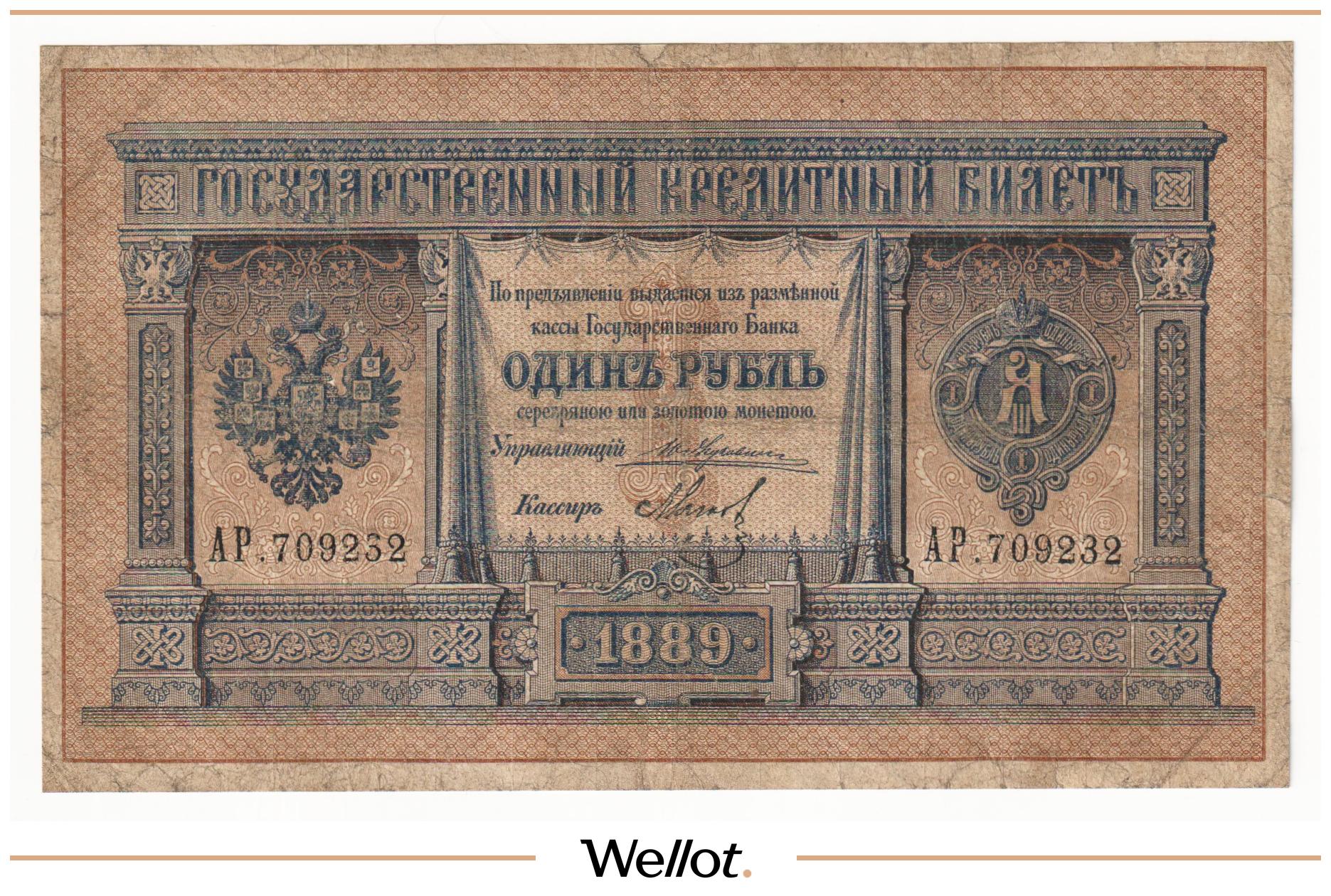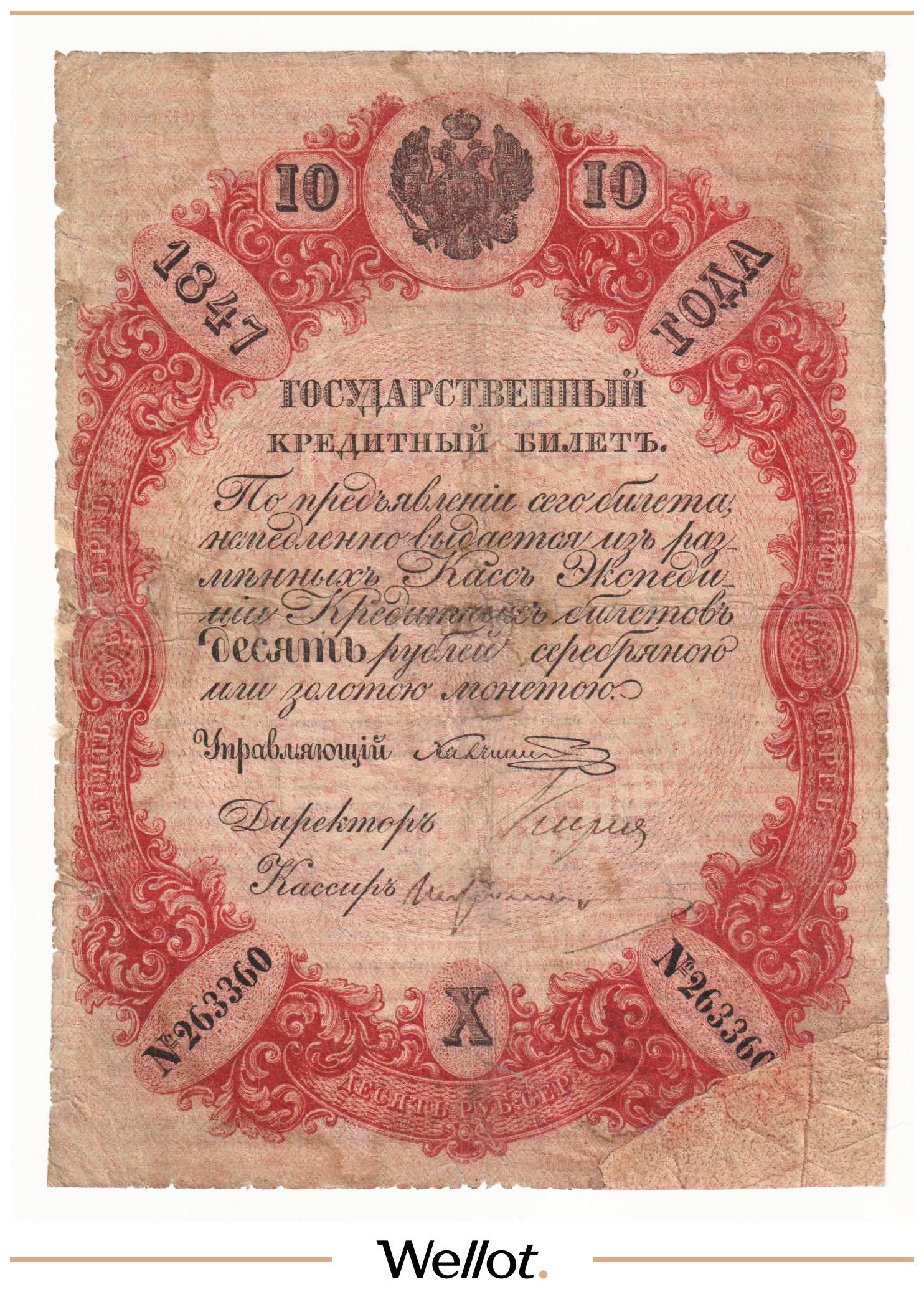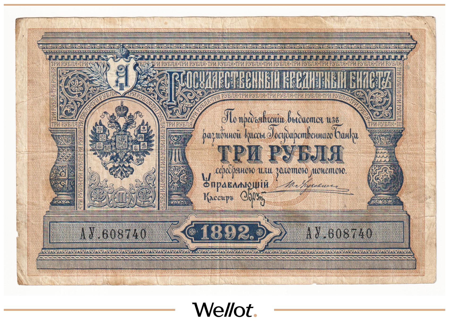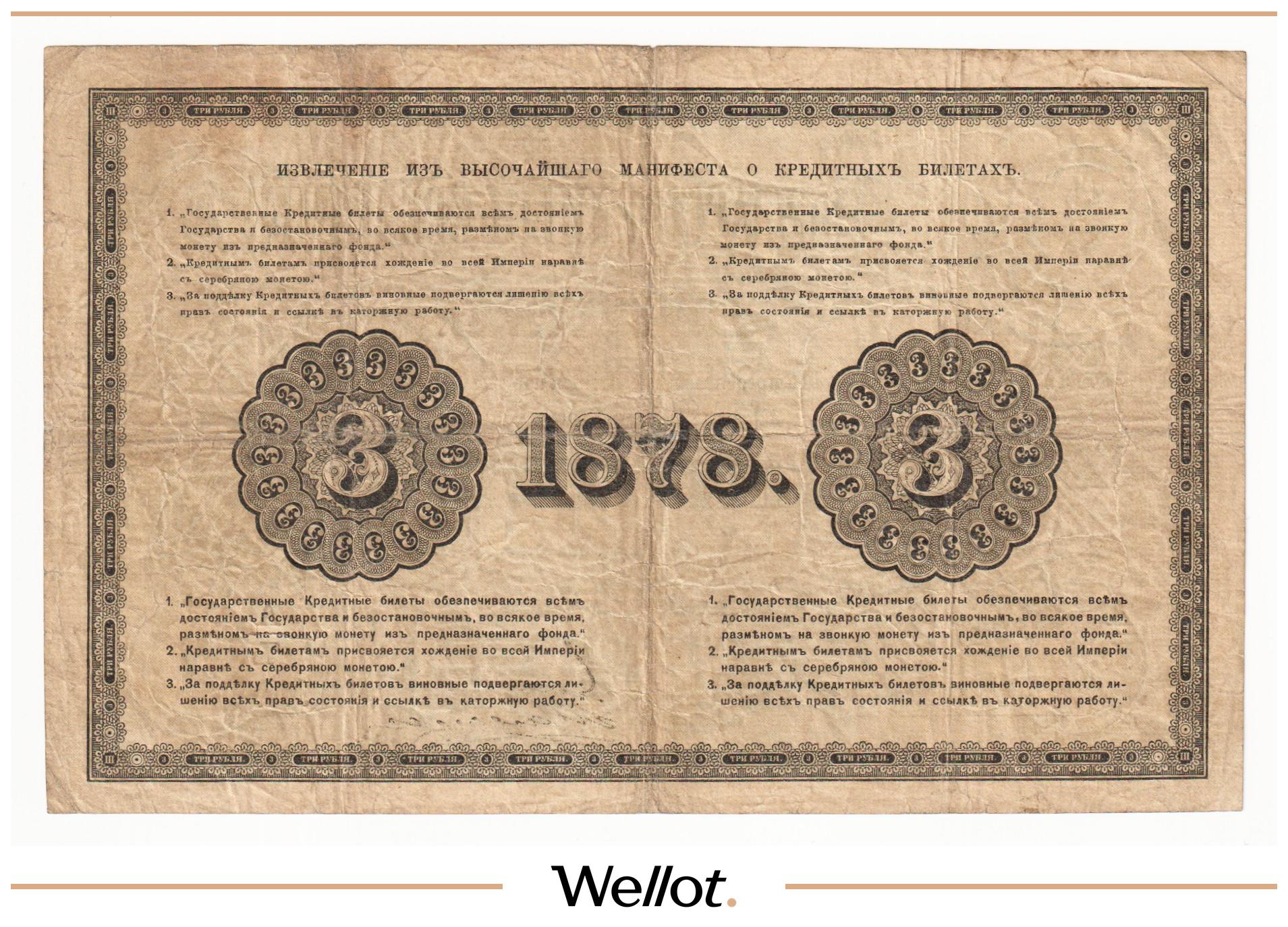 P# A57. Подписи: Цимсен - Брут. Подделка Леона Варнерке в ущерб обращению. Большинство знаков этого типа были изъяты из обращения и погашены. По имеющейся у нас информации это третий известный непогашенный экземпляр. В каталоге А.Алямкина "Государственные законные платежные средства без ограничений" такие банкноты обозначены "RRR" (известно не более 10 штук). Учитывая редкость, отсутствие гашения, данный экземпляр представляет особою коллекционную ценность.