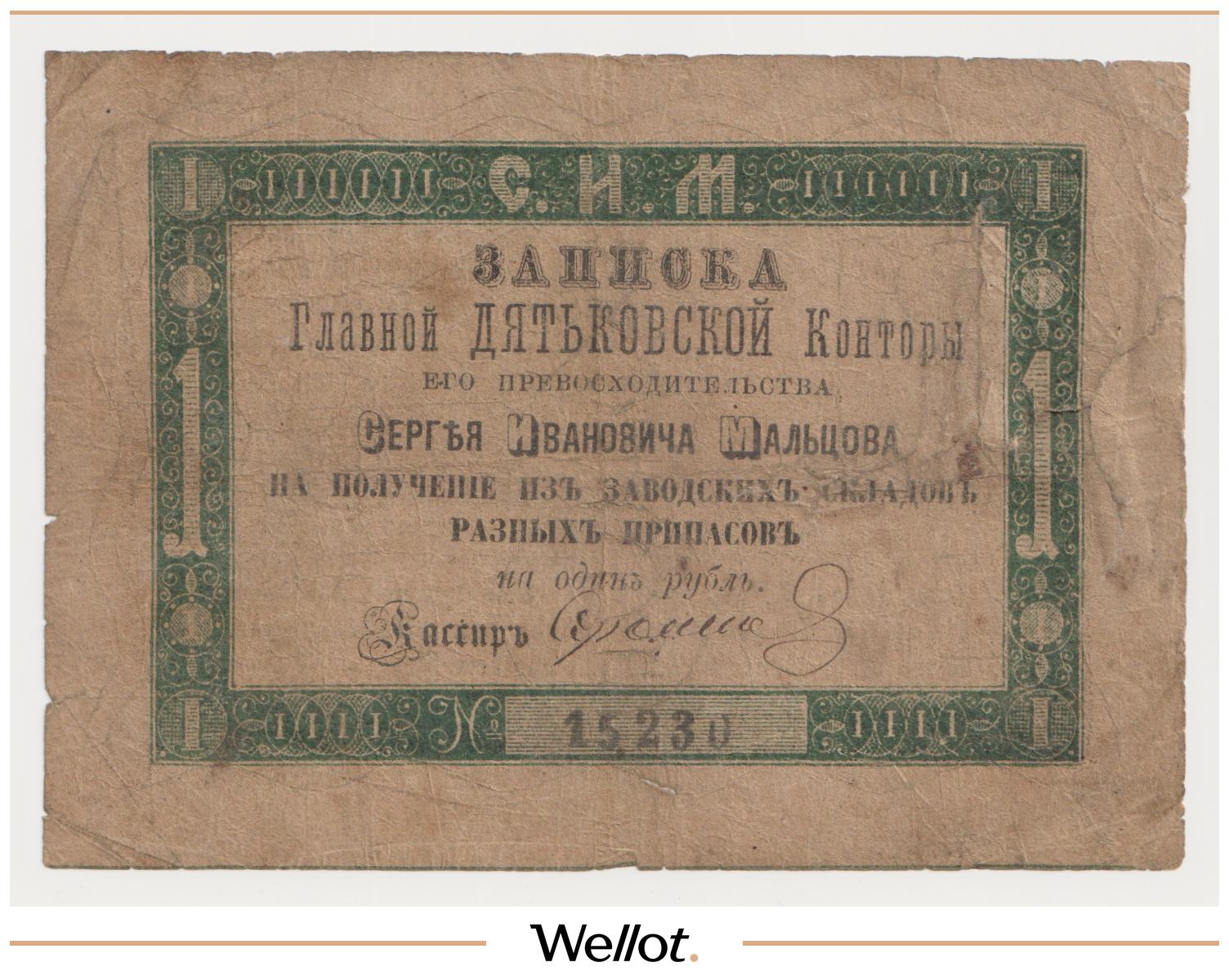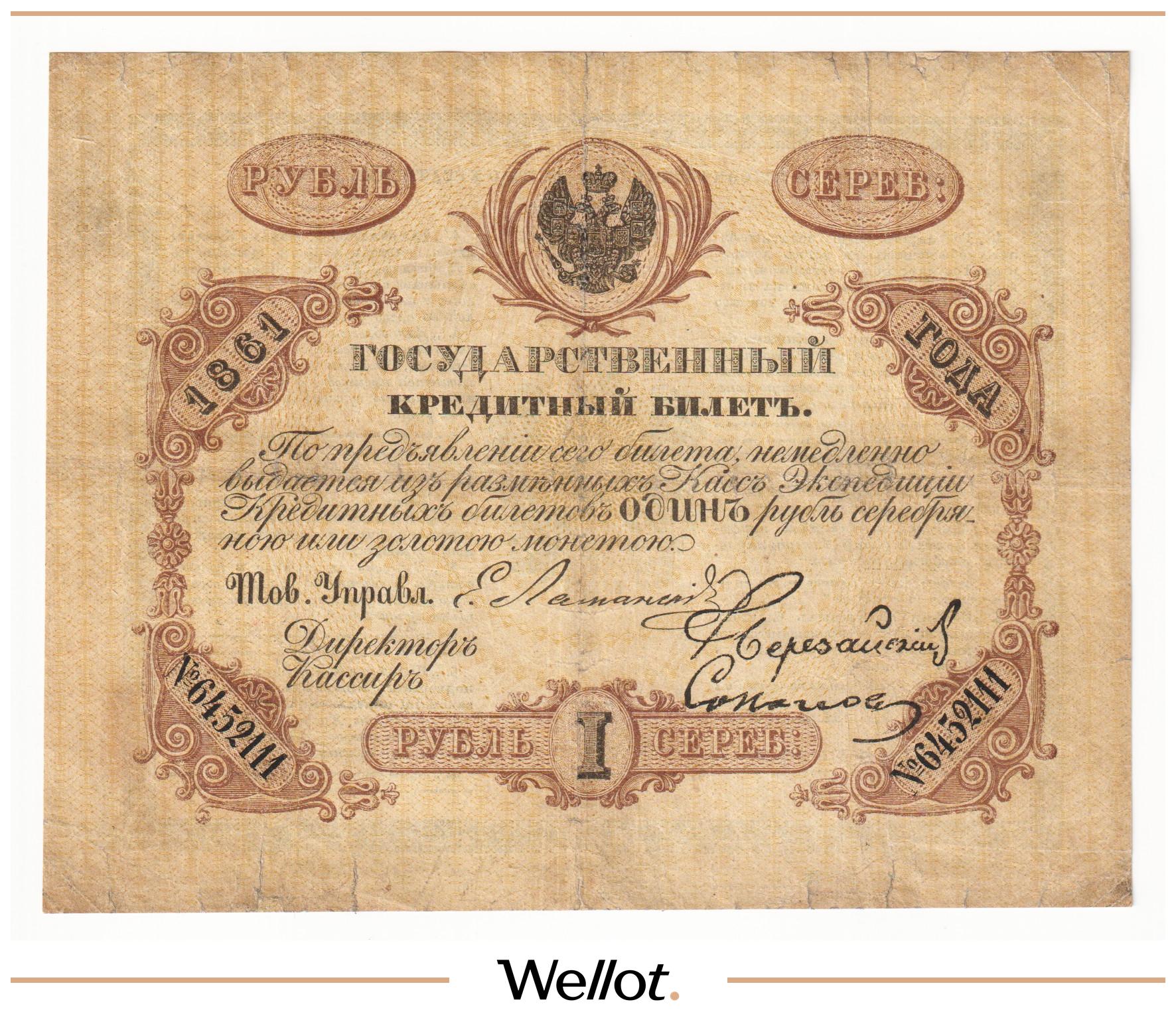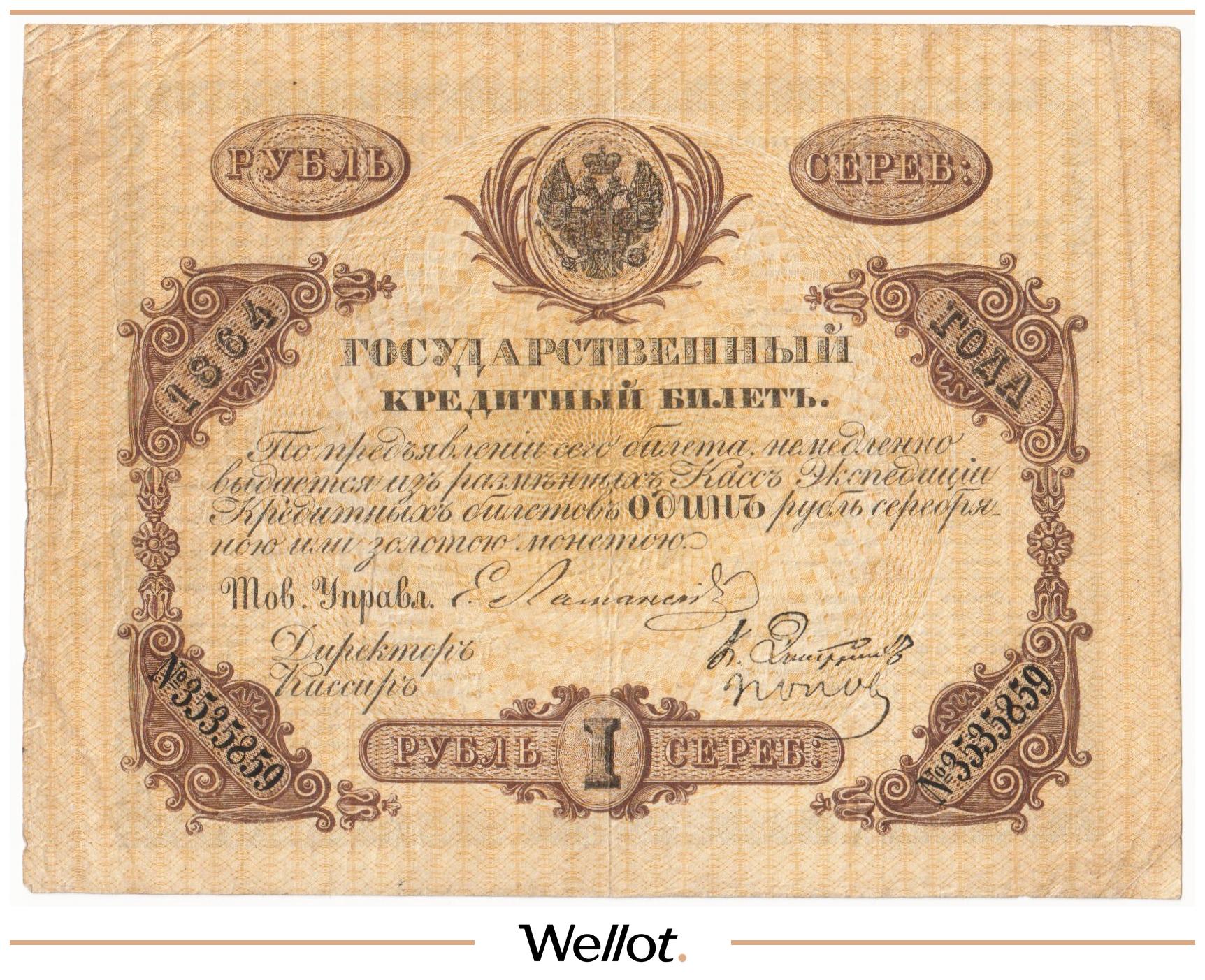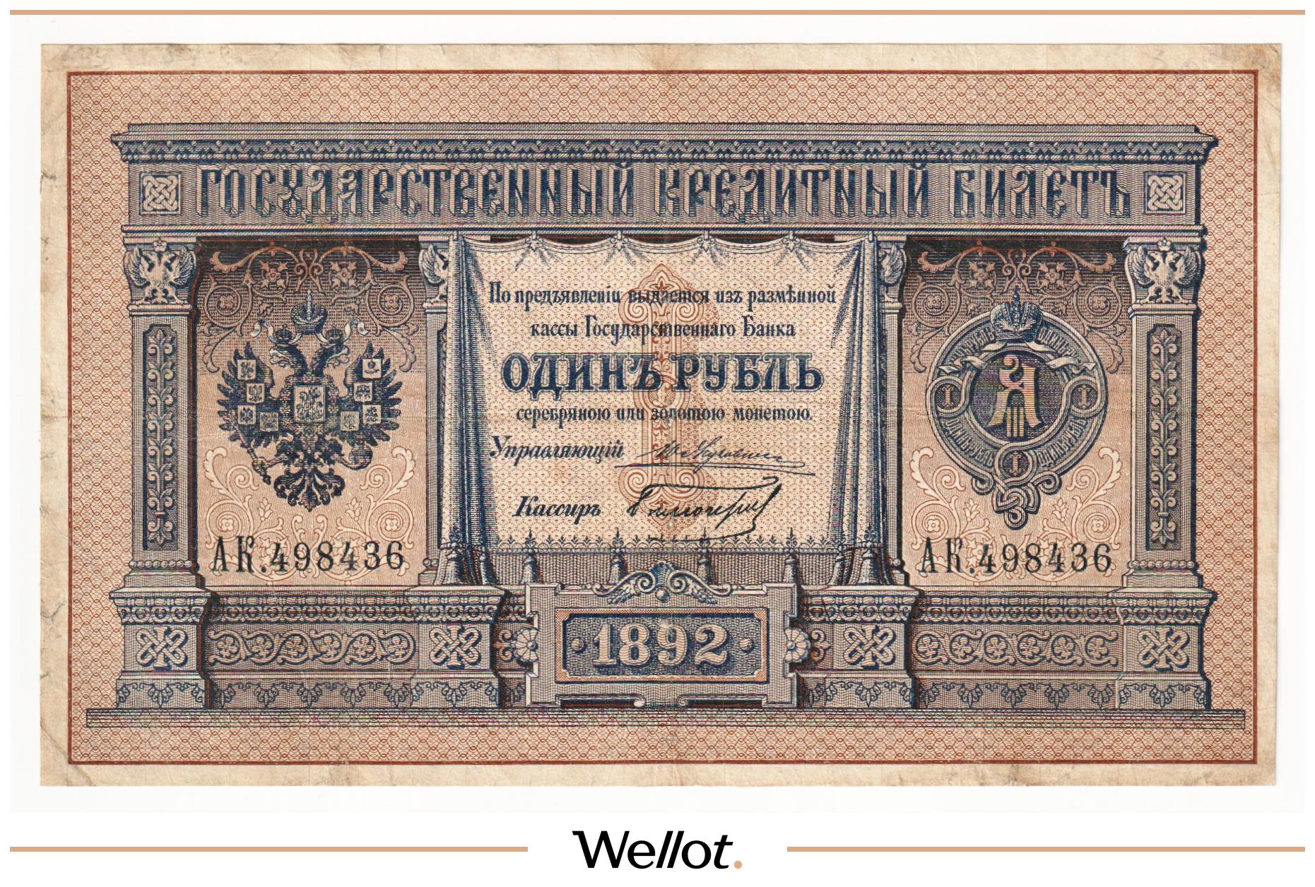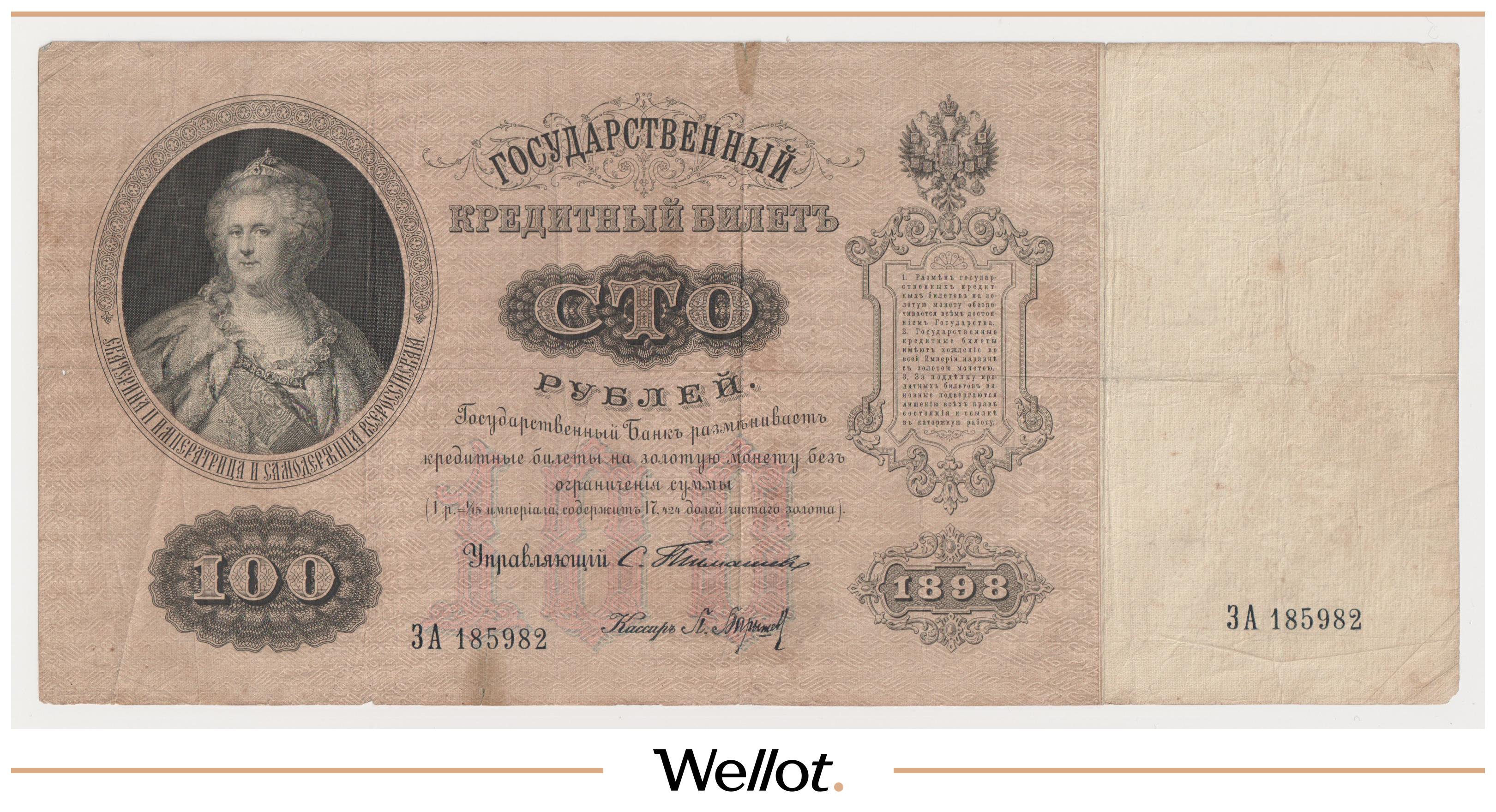 P# A57. Подписи: Цимсен - Брут. Подделка Леона Варнерке в ущерб обращению. Большинство знаков этого типа были изъяты из обращения и погашены. По имеющейся у нас информации это третий известный непогашенный экземпляр. В каталоге А.Алямкина "Государственные законные платежные средства без ограничений" такие банкноты обозначены "RRR" (известно не более 10 штук). Учитывая редкость, отсутствие гашения, данный экземпляр представляет особою коллекционную ценность.