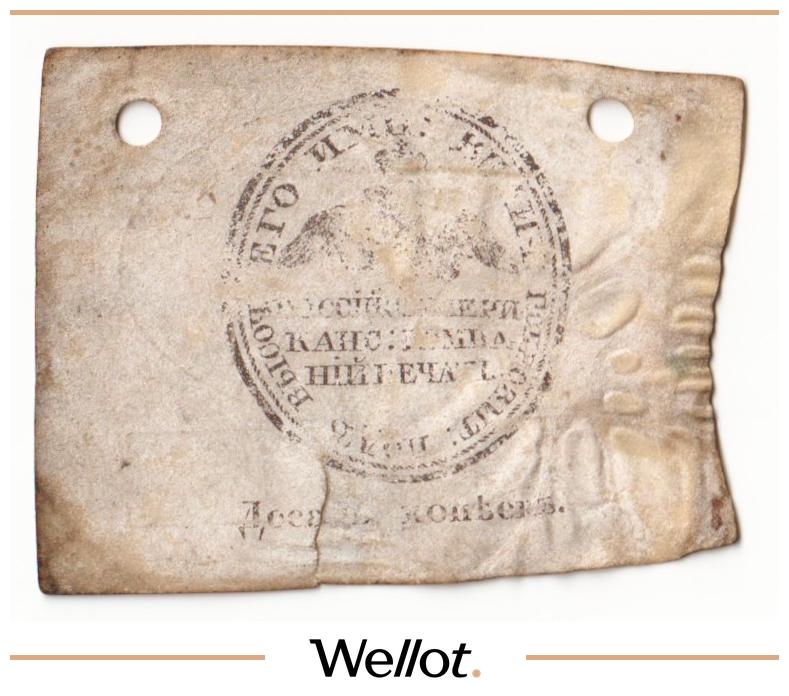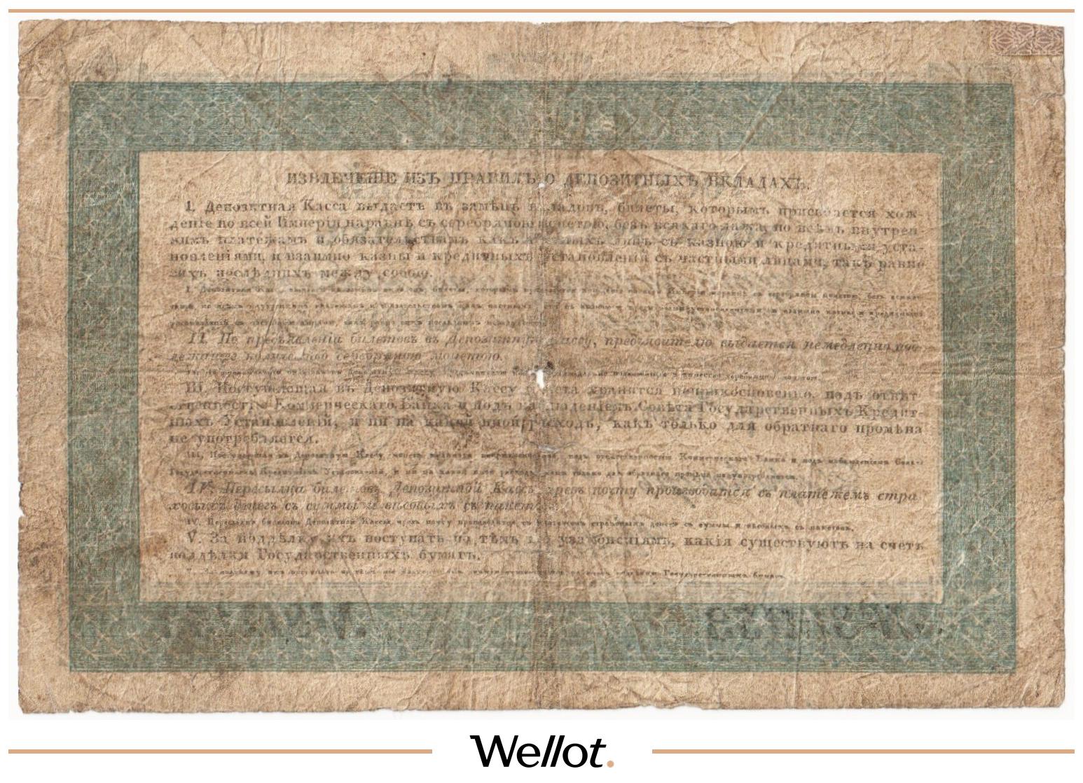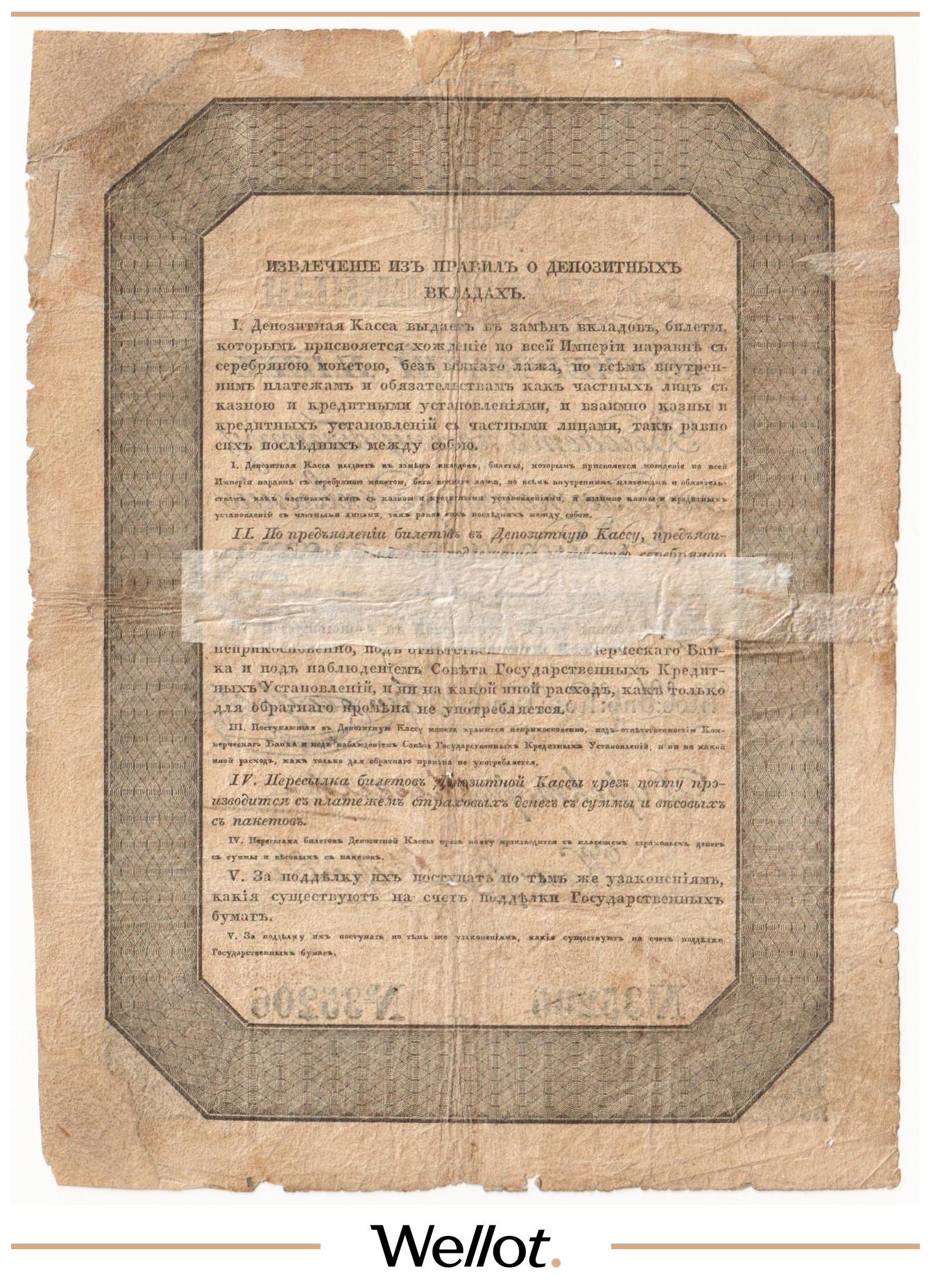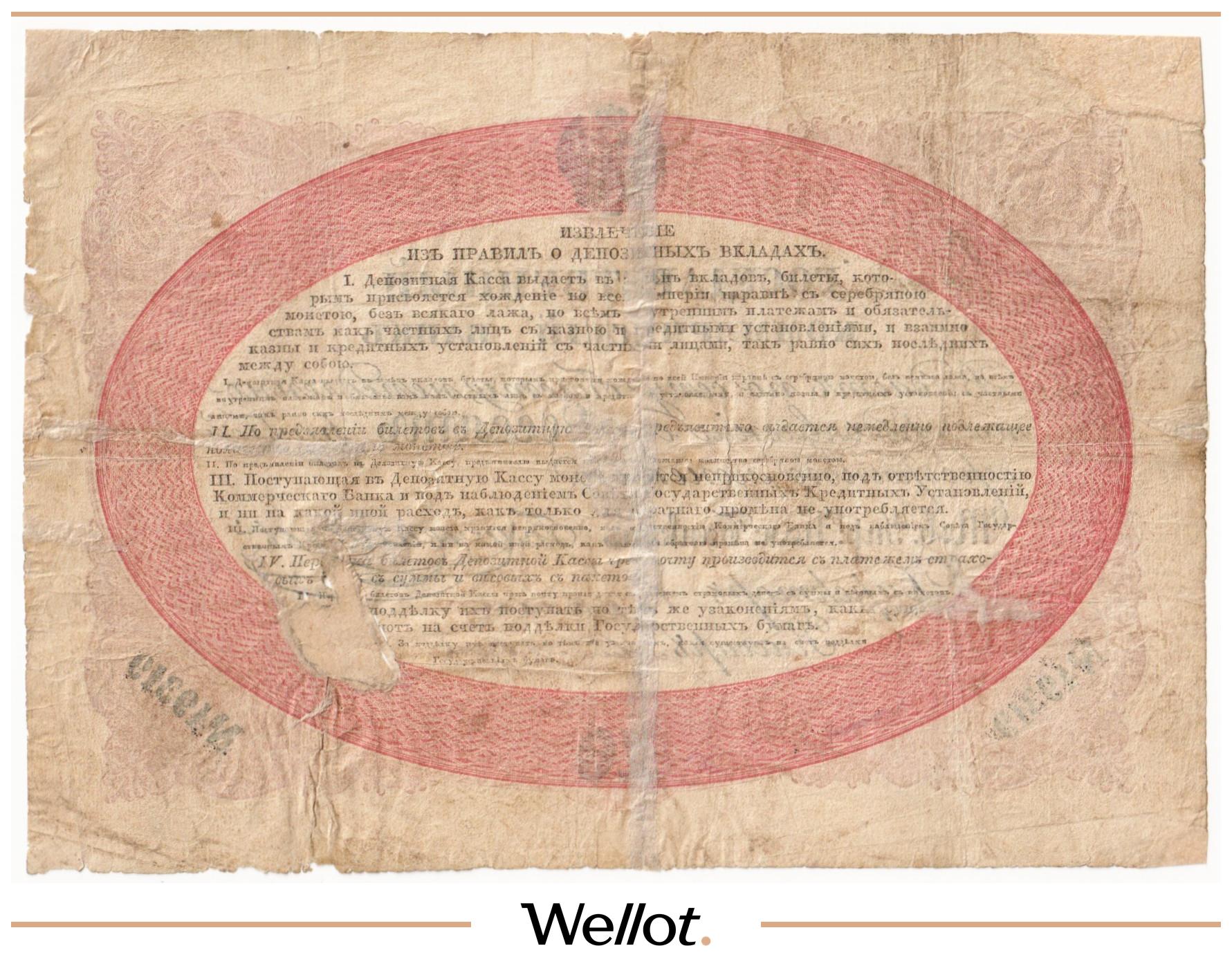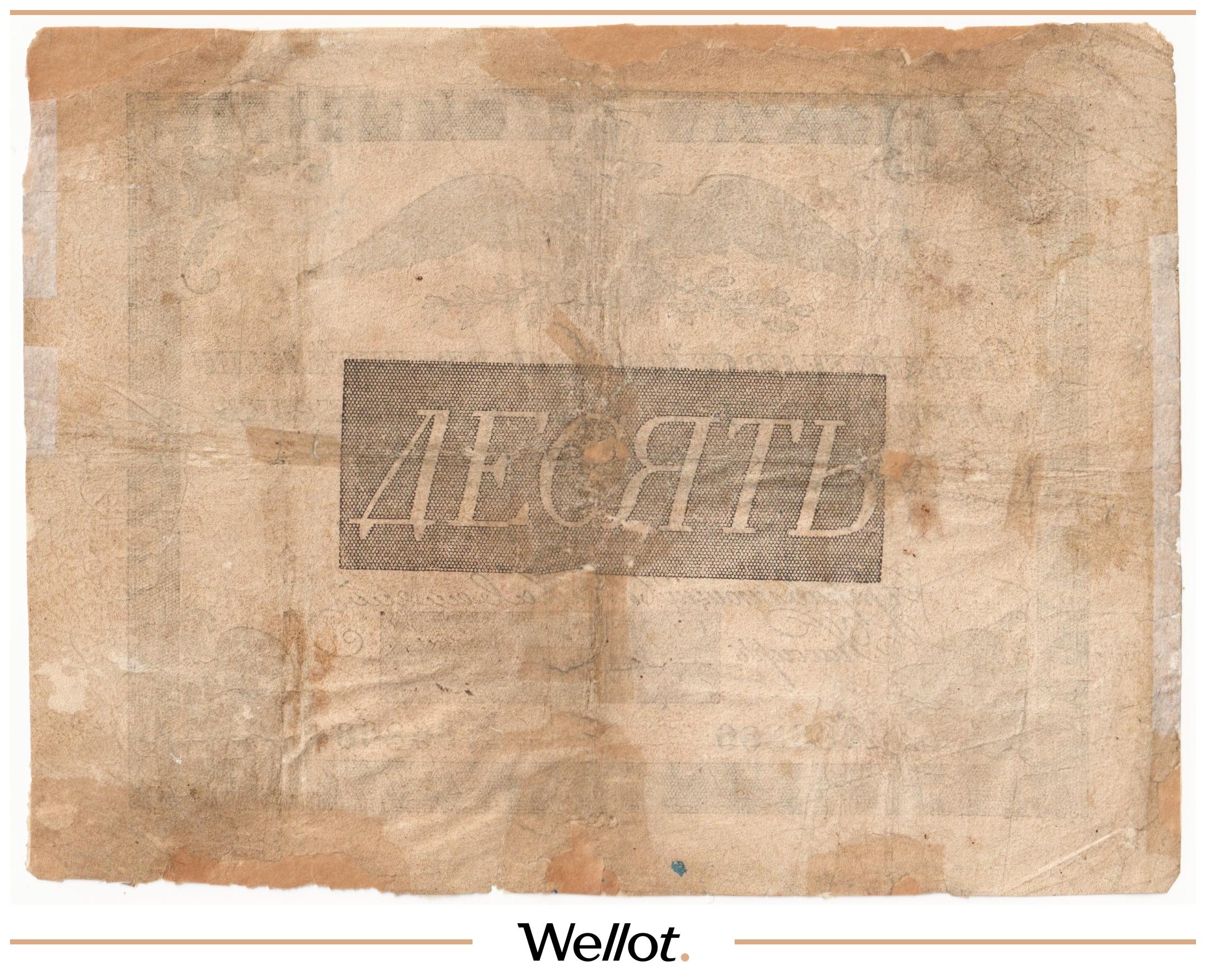 Наш экземпляр — именно из этой поворотной точки истории: не просто редкая старинная бумага, а ранняя российская банкнота современного типа. Такой предмет берут как опорный лот коллекции — чтобы закрыть важнейший переход от ассигнаций к классическим банкнотам.