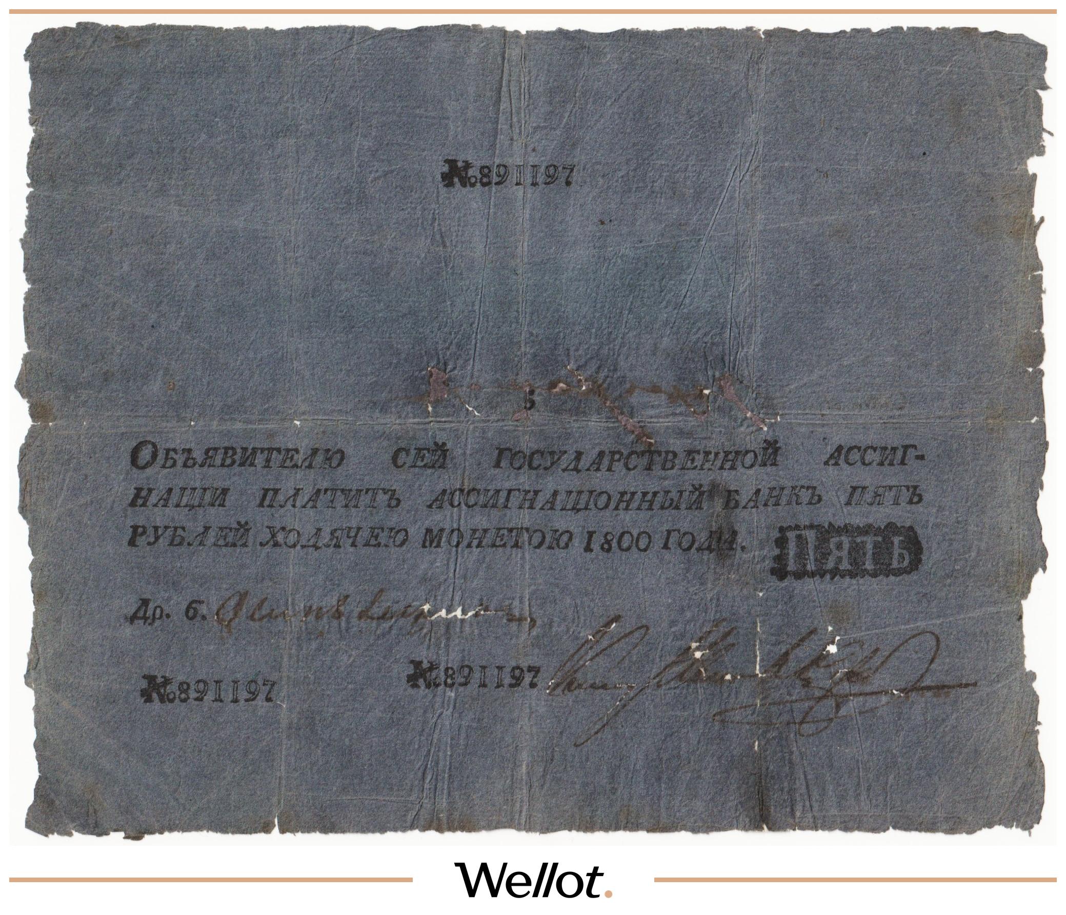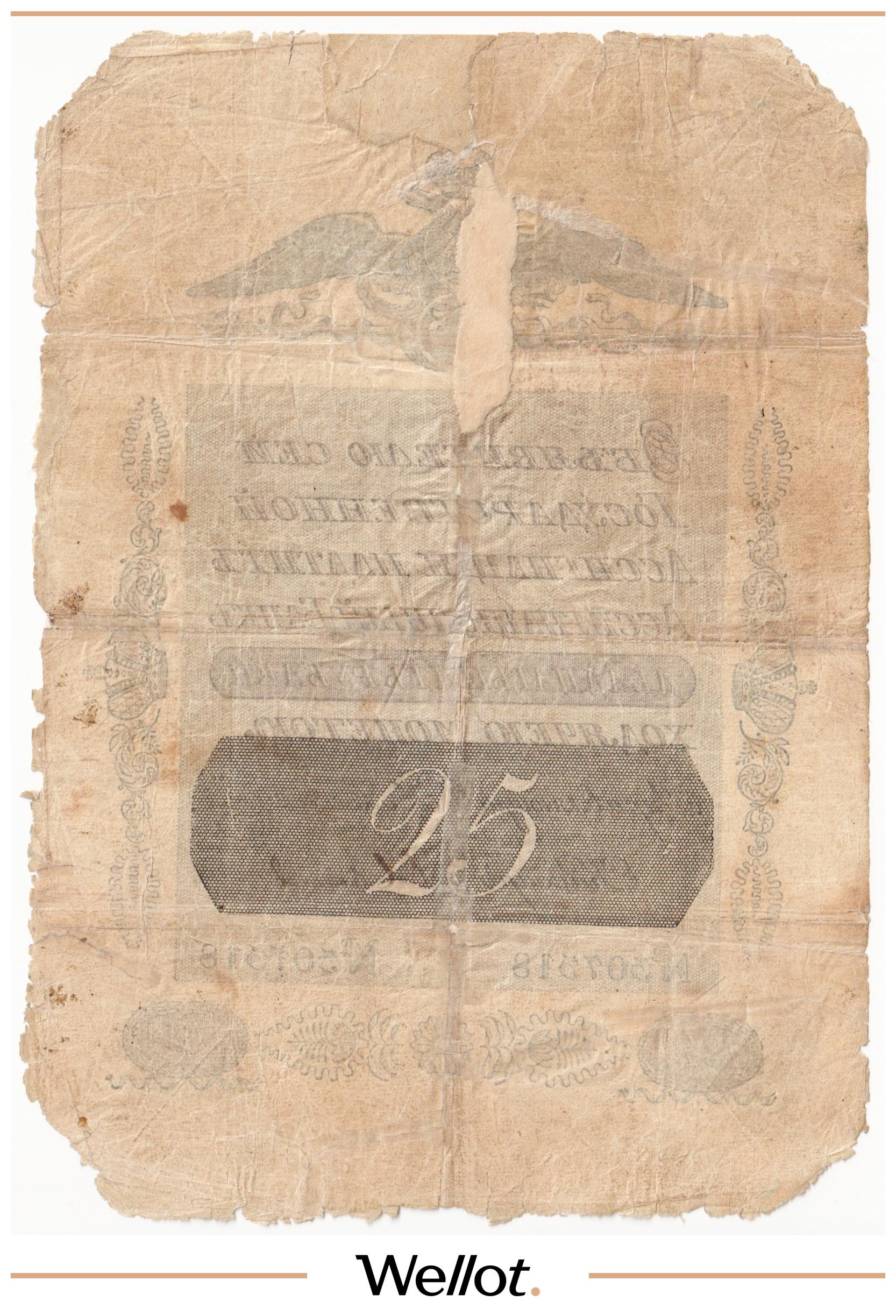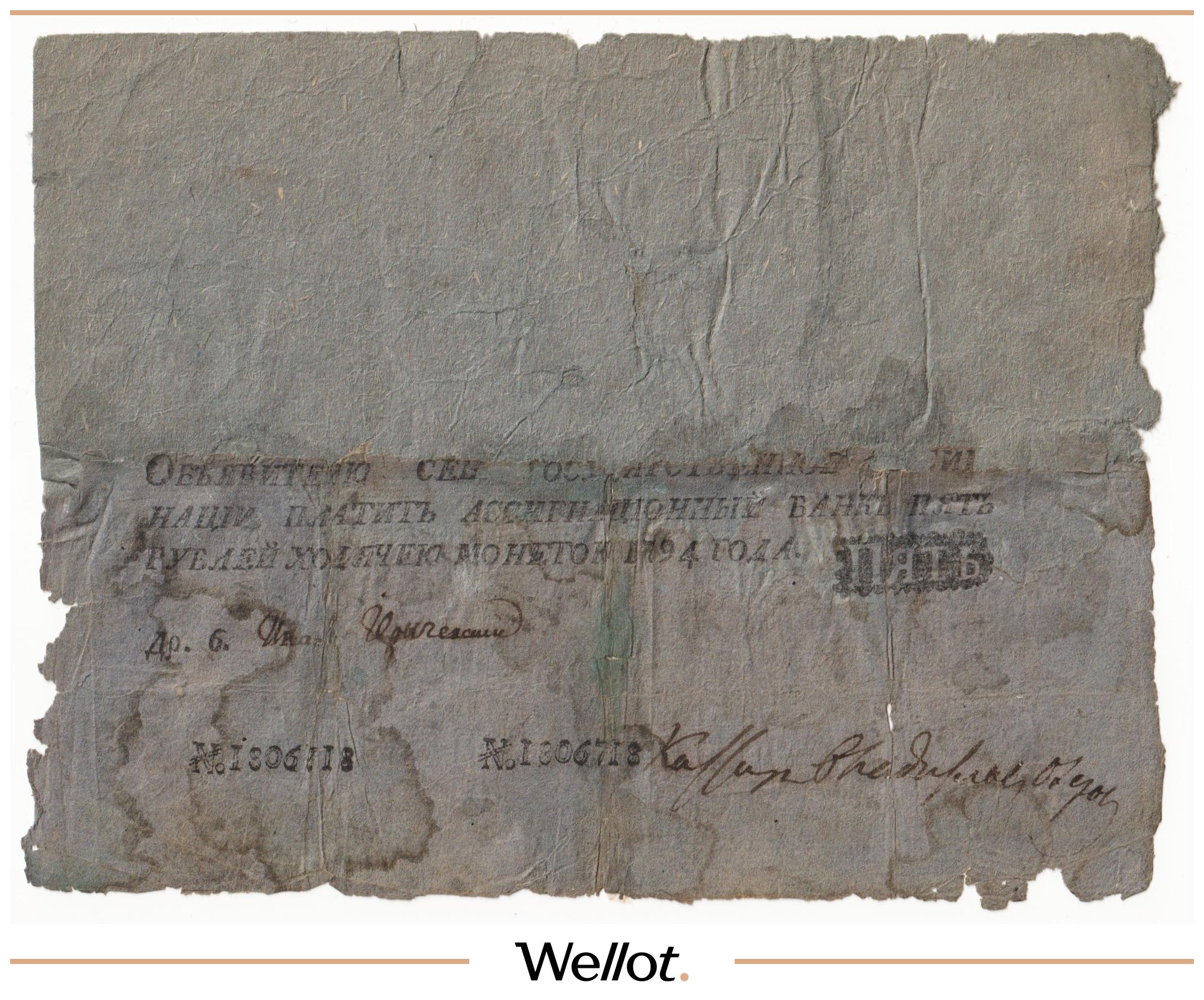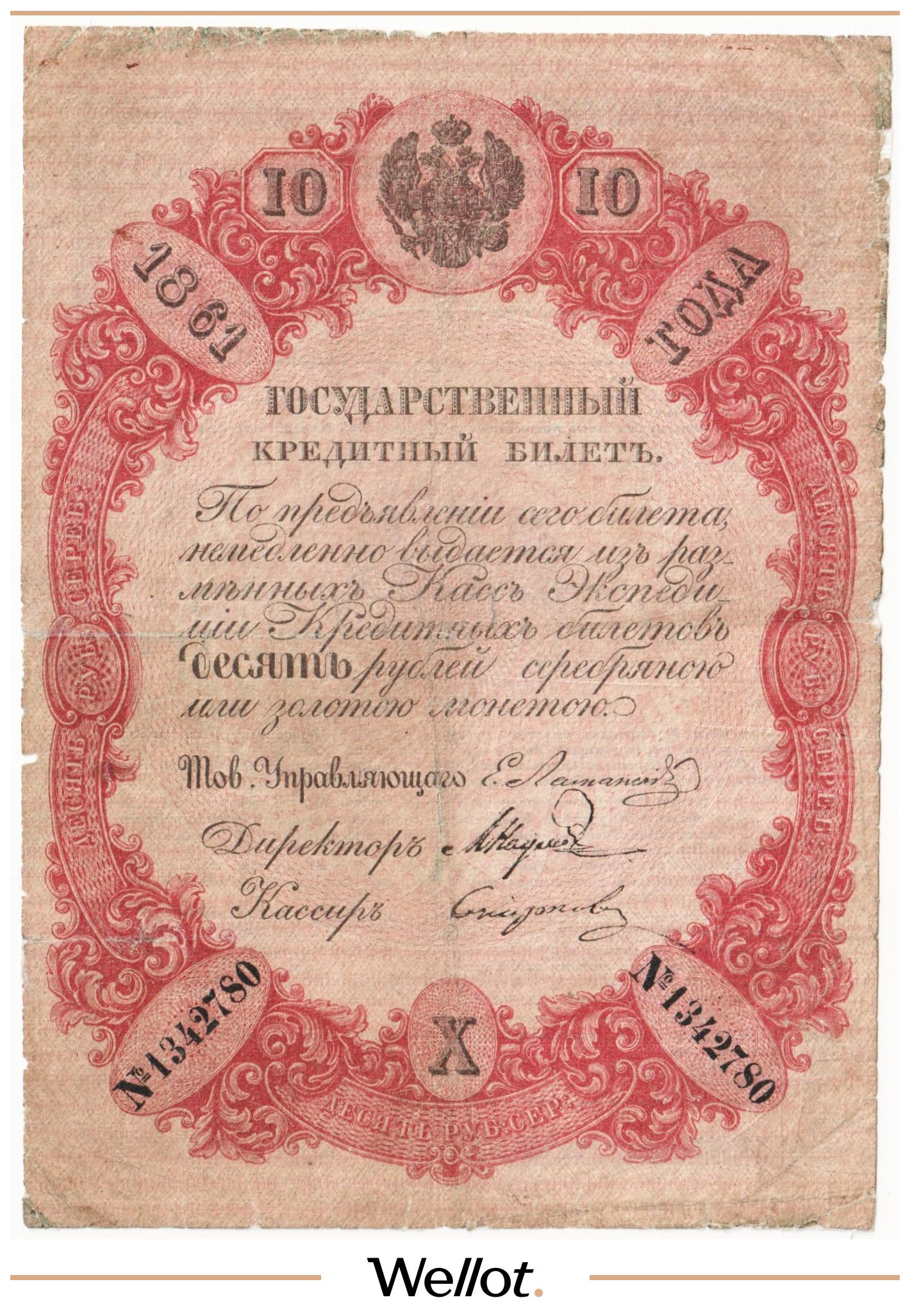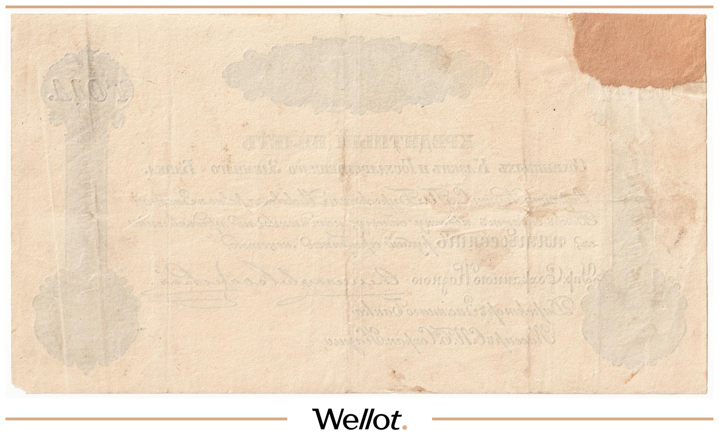 Наш экземпляр — именно из этой поворотной точки истории: не просто редкая старинная бумага, а ранняя российская банкнота современного типа. Такой предмет берут как опорный лот коллекции — чтобы закрыть важнейший переход от ассигнаций к классическим банкнотам.