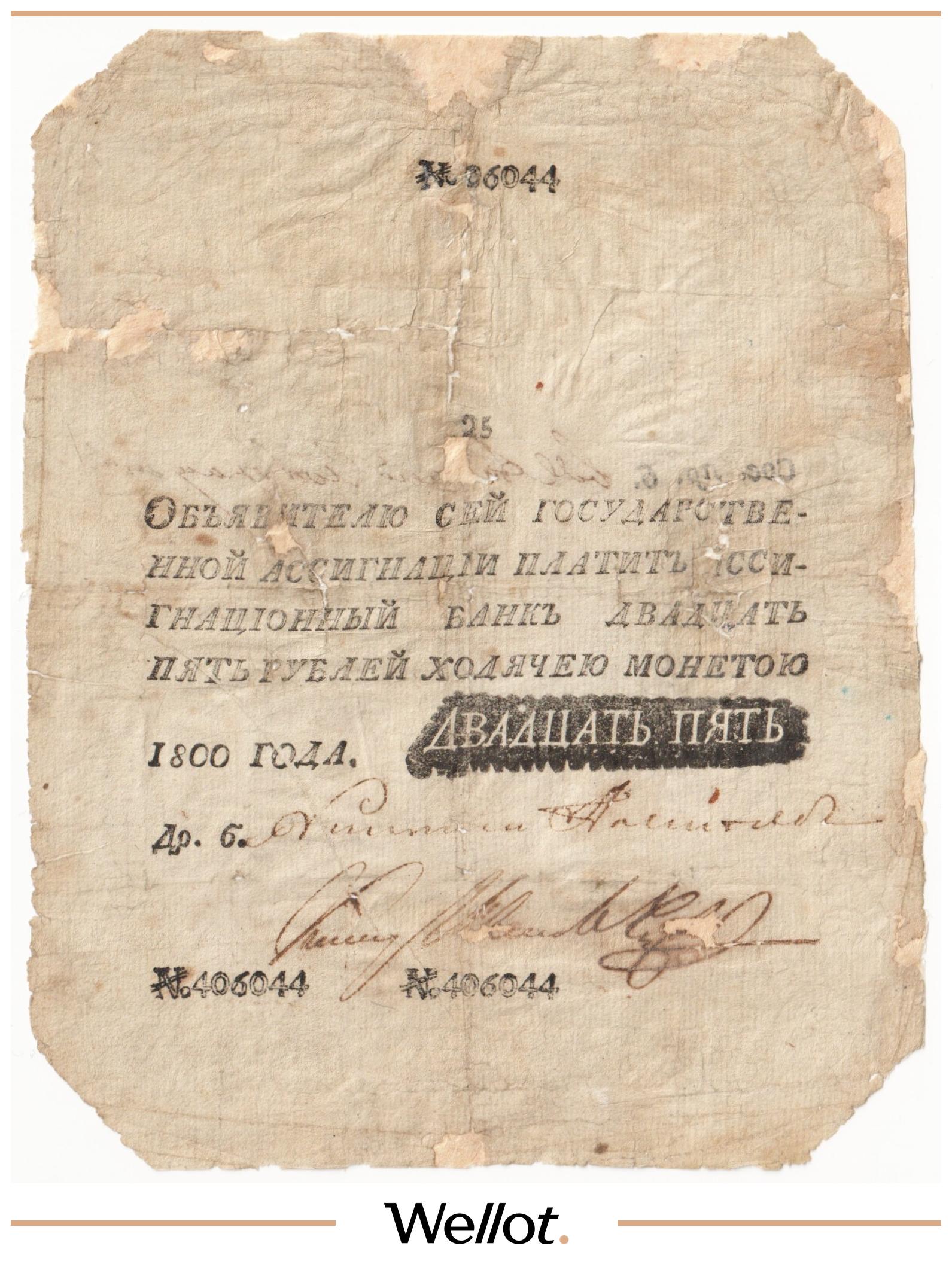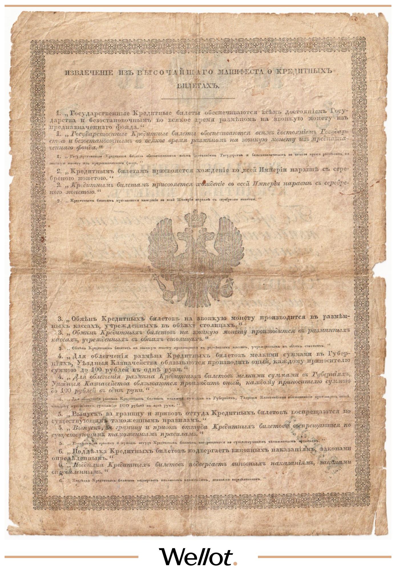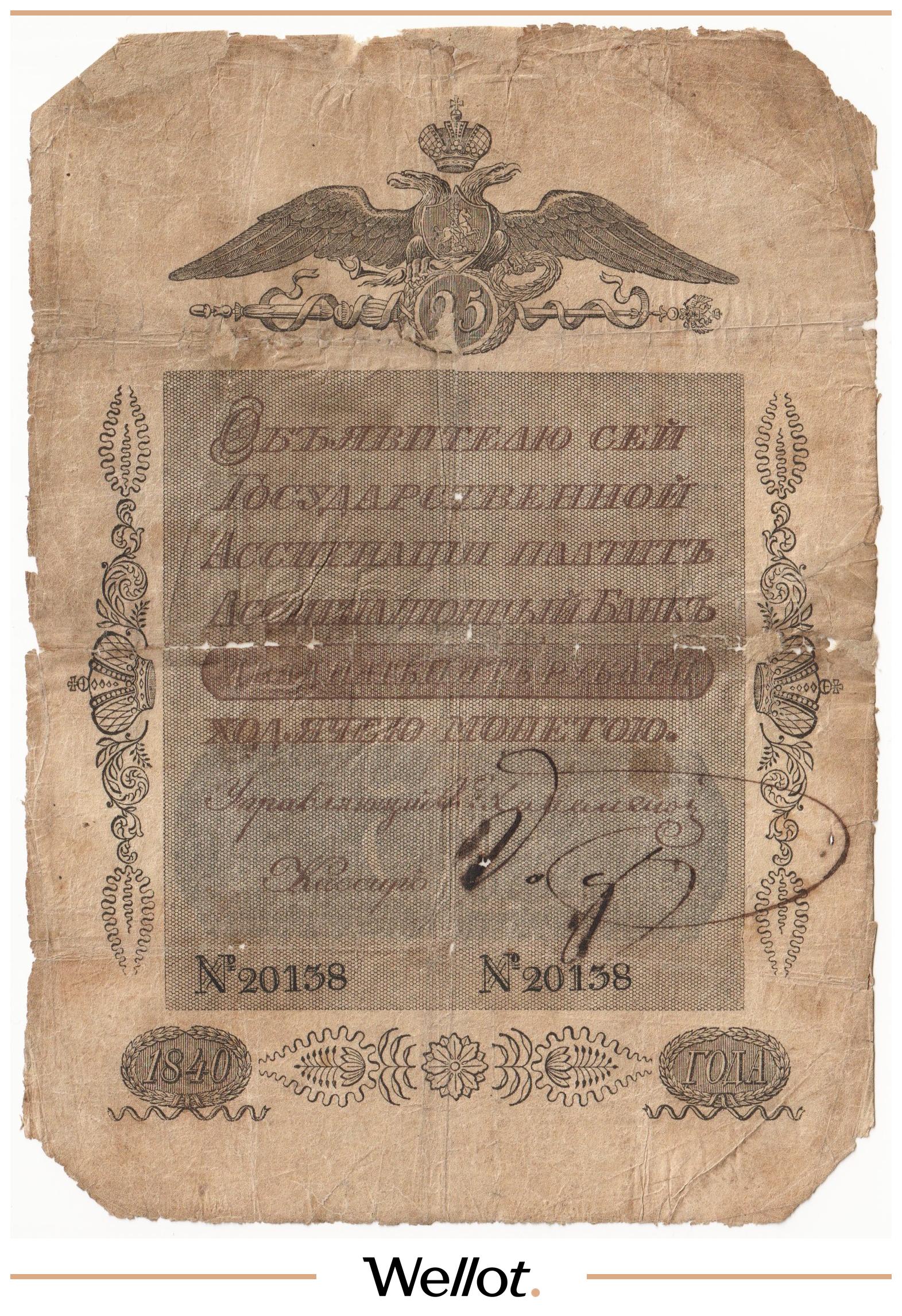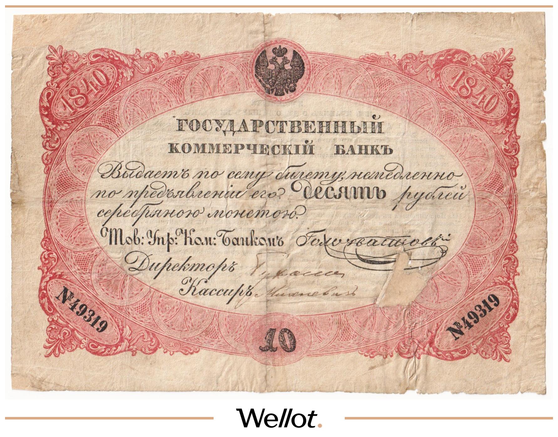 Наш экземпляр — именно из этой поворотной точки истории: не просто редкая старинная бумага, а ранняя российская банкнота современного типа. Такой предмет берут как опорный лот коллекции — чтобы закрыть важнейший переход от ассигнаций к классическим банкнотам.
