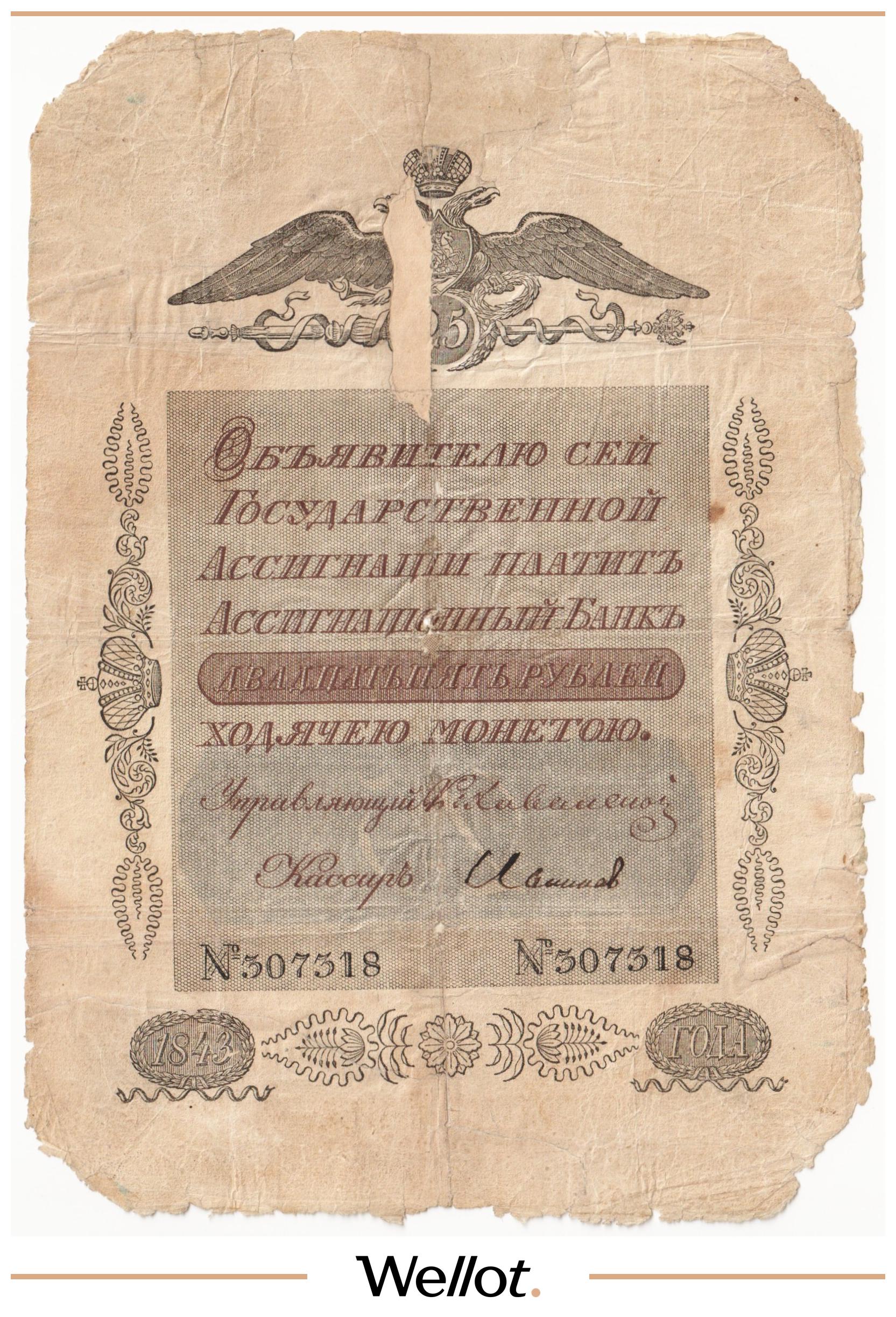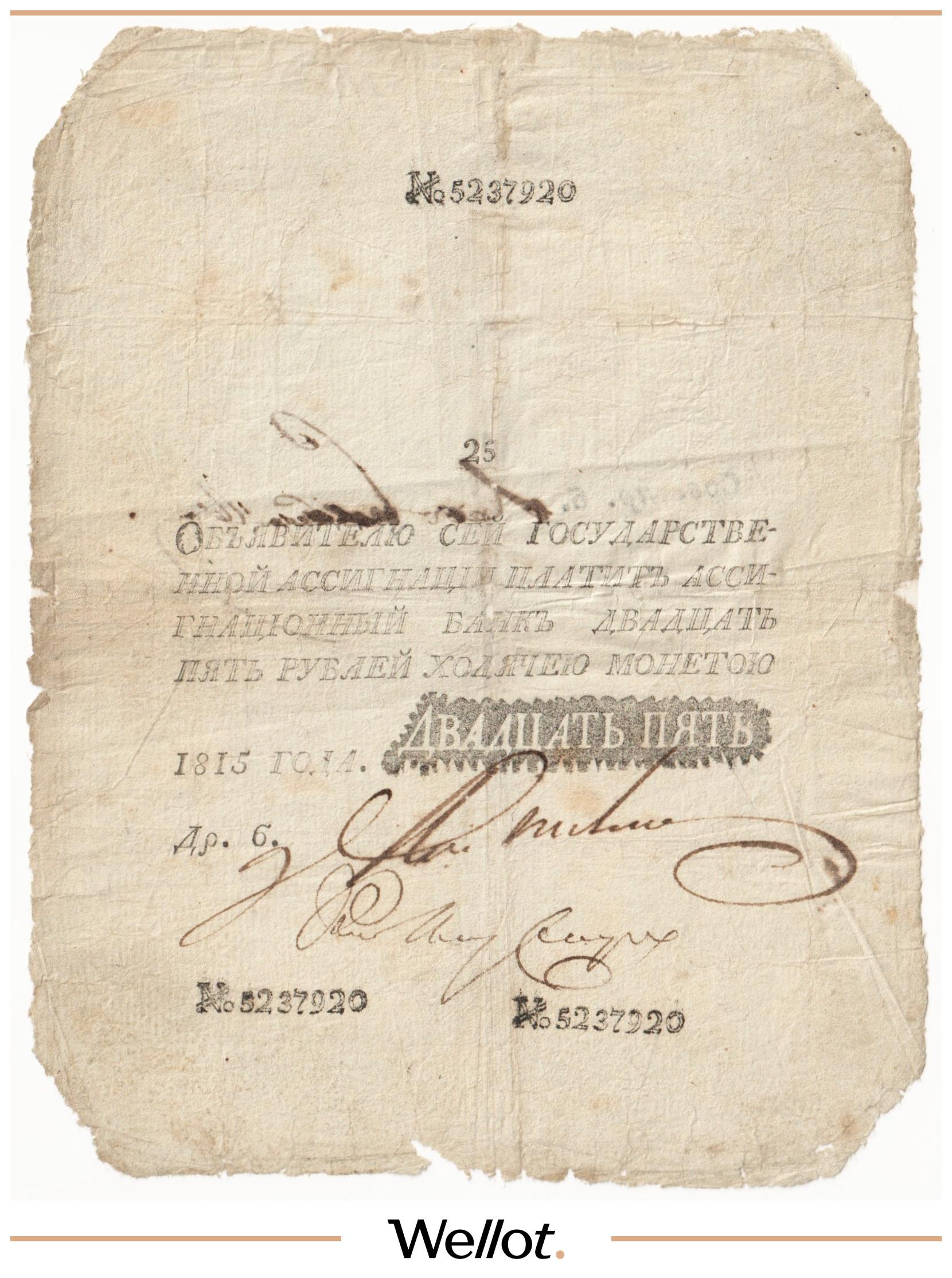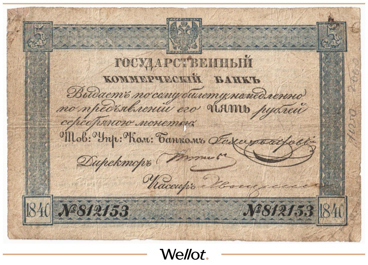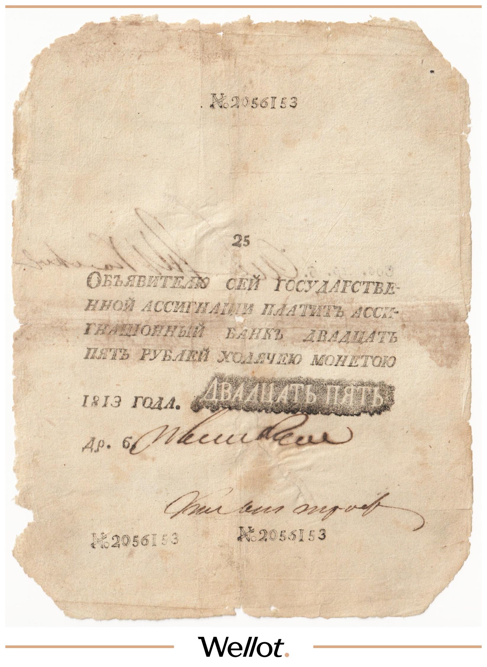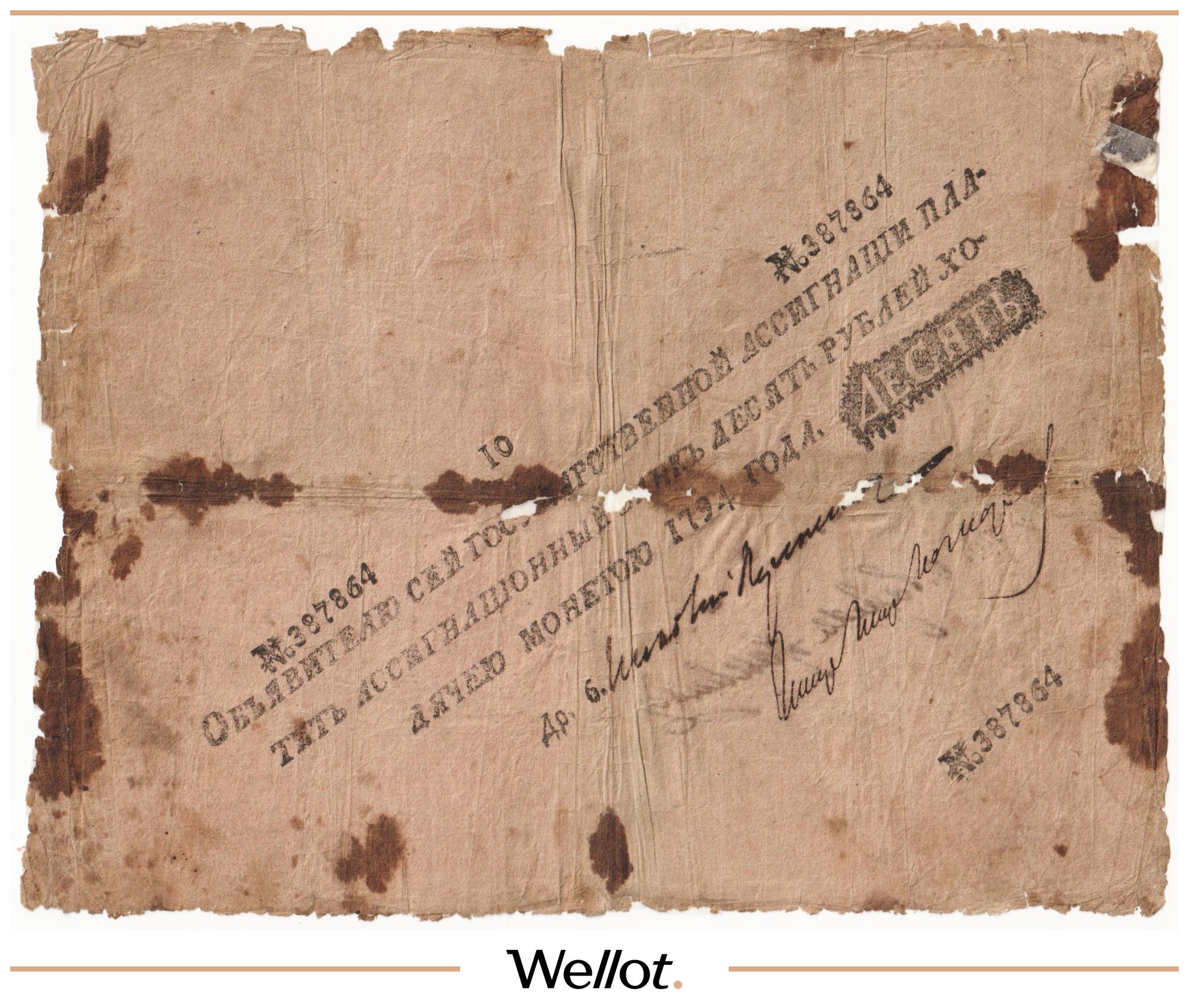 Наш экземпляр — именно из этой поворотной точки истории: не просто редкая старинная бумага, а ранняя российская банкнота современного типа. Такой предмет берут как опорный лот коллекции — чтобы закрыть важнейший переход от ассигнаций к классическим банкнотам.