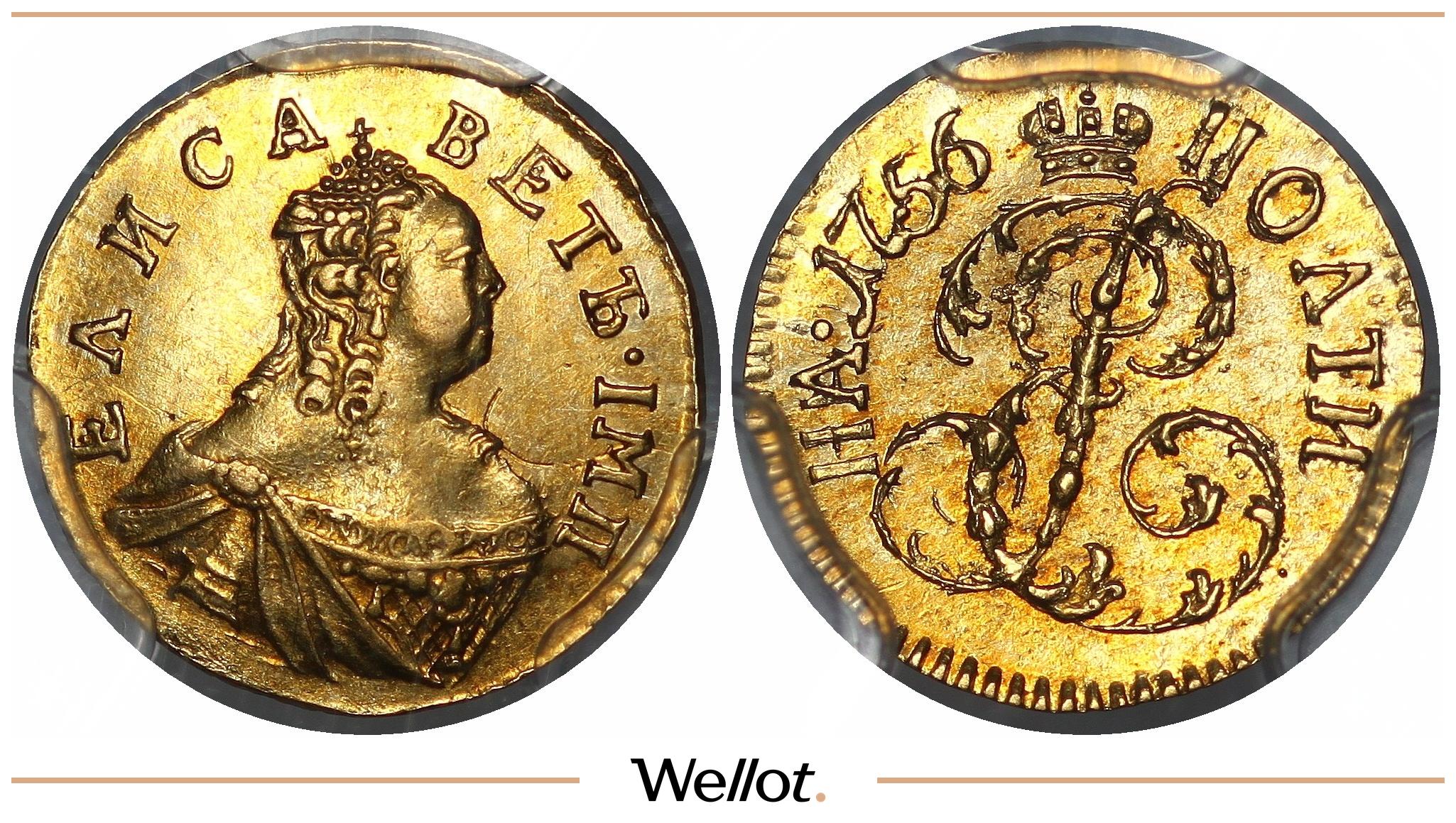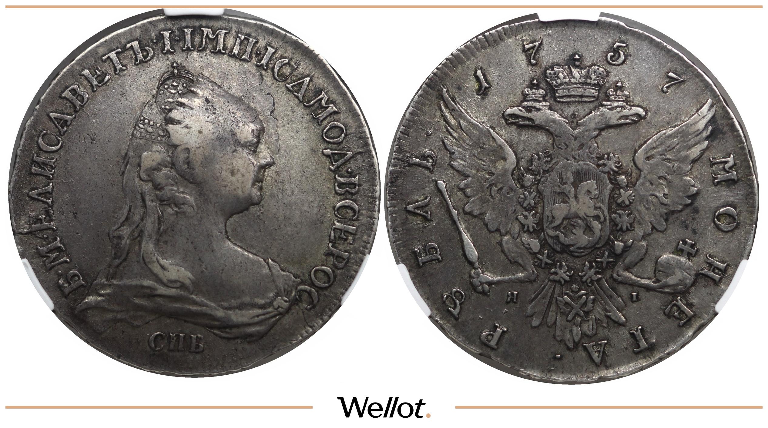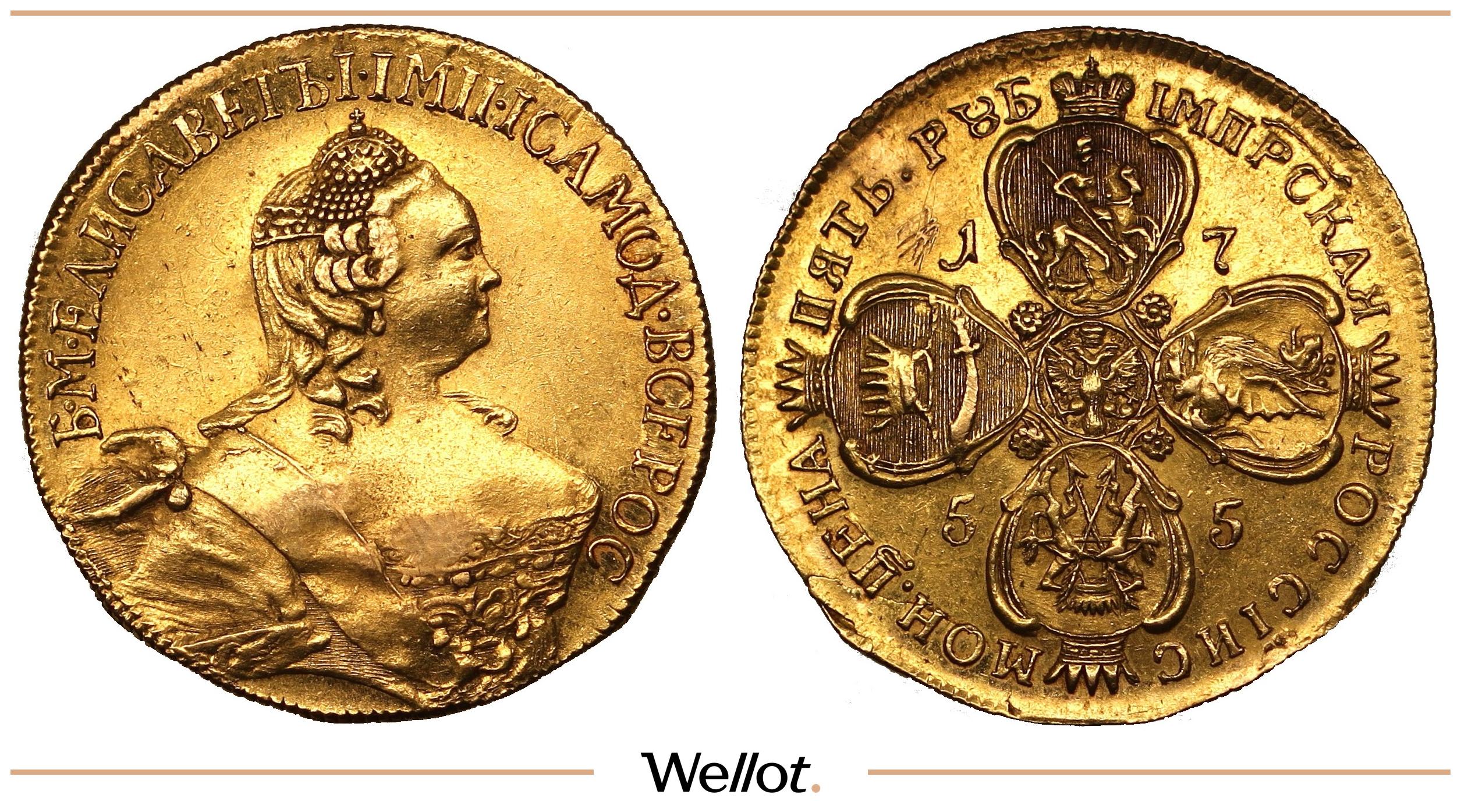 На аверсе — выразительный портрет императрицы Елизаветы Петровны, правительницы эпохи расцвета Российской имперской культуры и силы. Реверс украшает главный символ державы — герб Российской Империи: двуглавый орёл со скипетром и державой, знак верховной власти и единства страны. Композиция дополнена четырьмя крупными картушами, каждый из которых подчёркивает масштаб империи: слева — корона, символ монархической власти; сверху — Московский герб; справа — герб Казанского царства; снизу — герб царства Сибирского. Верхний картуш венчает императорская корона, остальные — традиционные короны, создавая торжественную иерархию и «язык власти», который легко читается даже сегодня.