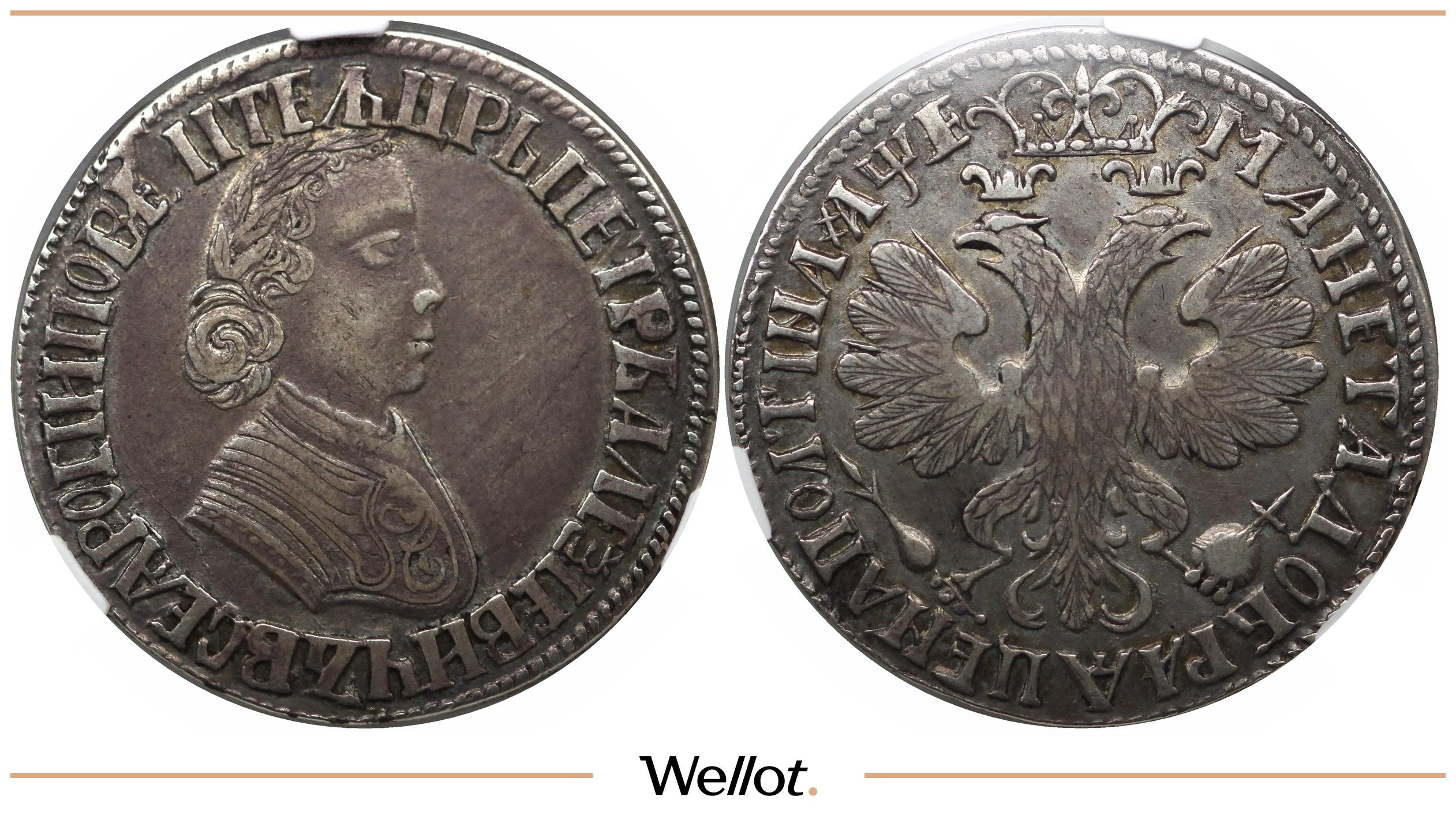 Биткин# 557 (R3). "Уборная". Выпуклый чекан, корона открытая. Серебро. Полтины времён Петра I называют «уборными» из-за того, что на них Пётр I изображён в богато украшенной («убранной») одежде. Также название связано с тем, что на монете волосы царя убраны под венок. Очень редкая типажная монета, желанная каждым собирателем серебряных монет Российской Империи.