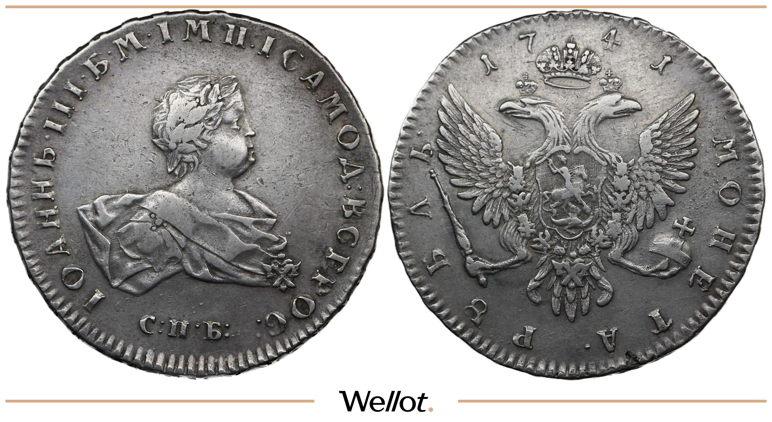 Биткин# 19 (R1). Гурт надпись. Серебро. 25,74 г. Ильин 12 рублей. Серебряная монета, выпущенная в эпоху правления малолетнего императора, который формально царствовал с октября 1740 по ноябрь 1741 года. Фактически правила страной его мать Анна Леопольдовна. С февраля 1741 года до момента свержения Иоанна Антоновича было отчеканено около 700 000 монет с его изображением. Однако сохранившиеся экземпляры монеты редки, так как почти все выпущенные рубли были изъяты и переплавлены (перечеканены) по приказу императрицы Елизаветы Петровны, пришедшей к власти в результате дворцового переворота. До 1 января 1743 года эти монеты подлежали обмену на новые по номиналу, после этой даты их выкупали по цене 92,5 копеек за рубль. Состояние очень хорошее. Дымчатая равномерная старинная патина. Культовая редкость!