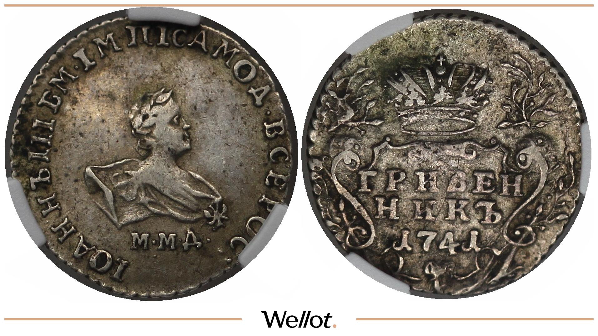Биткин# 8 (R1). Серебро. Тираж 290000. Ильин 4 рубля. Состояние очень хорошее, оригинальная старинная патина. Мелкие номиналы серебряных монет правления Иоанна Антоновича крайне редки на практике и имеют особую нумизматическую ценность.