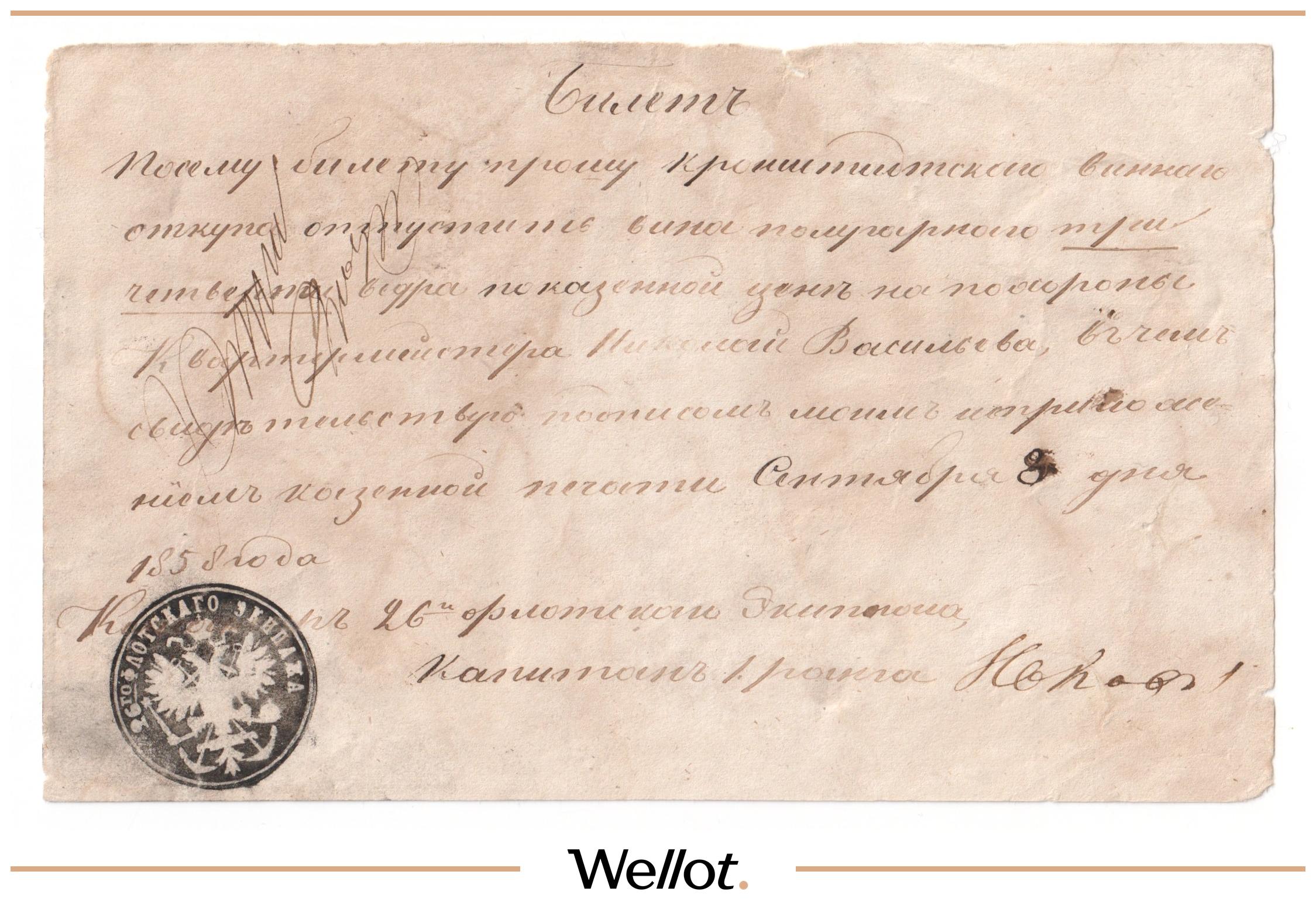 Билет на отпуск вина за подписью командира 26-го флотского экипажа. Очень хорошая сохранность.