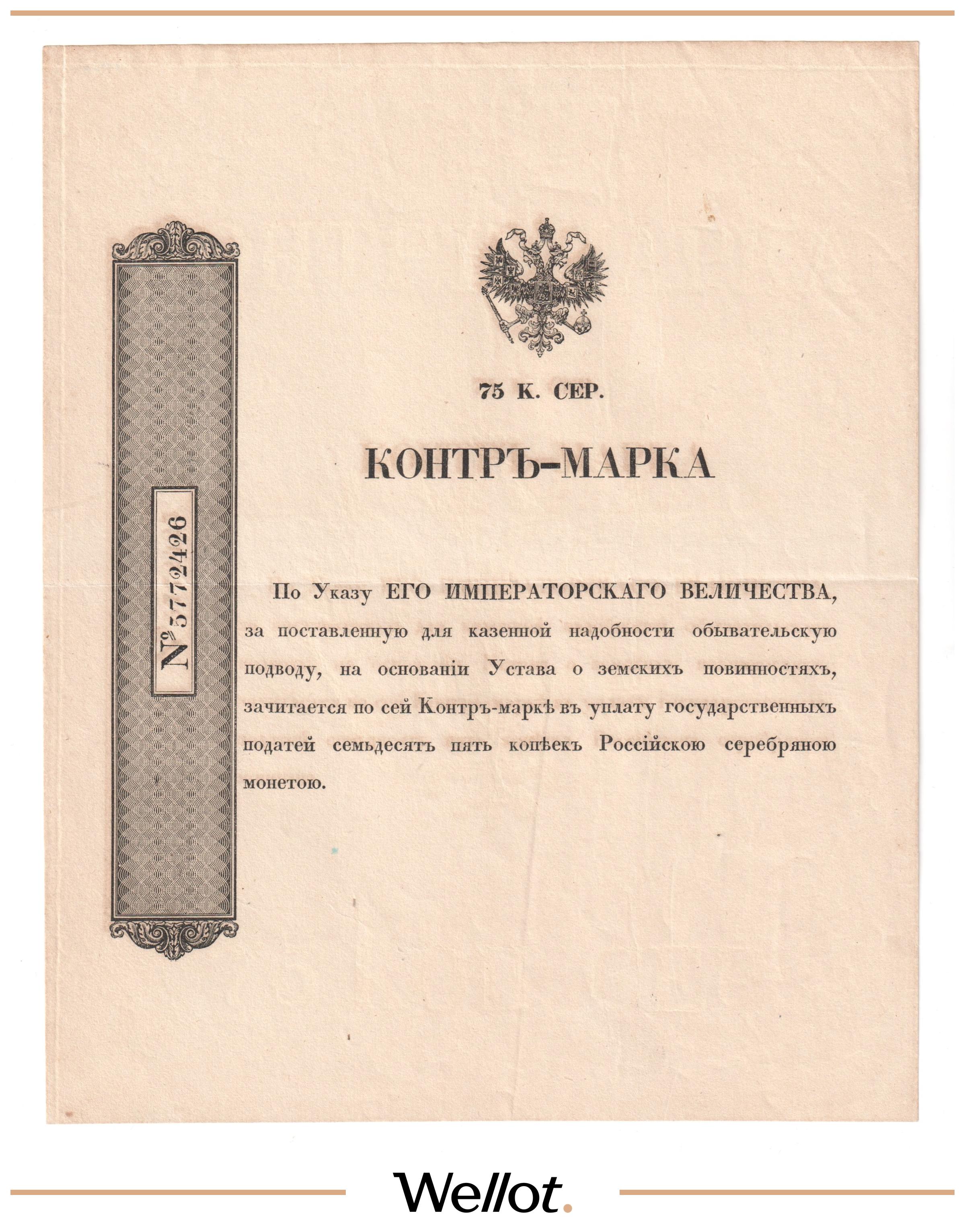 Денисов# КМ-2.2. Контр-Марка. Вариант герба №3, "узкий" 26мм. Использовались для платежа обывателям за перевозку воинских тяжестей. Отличная сохранность.
