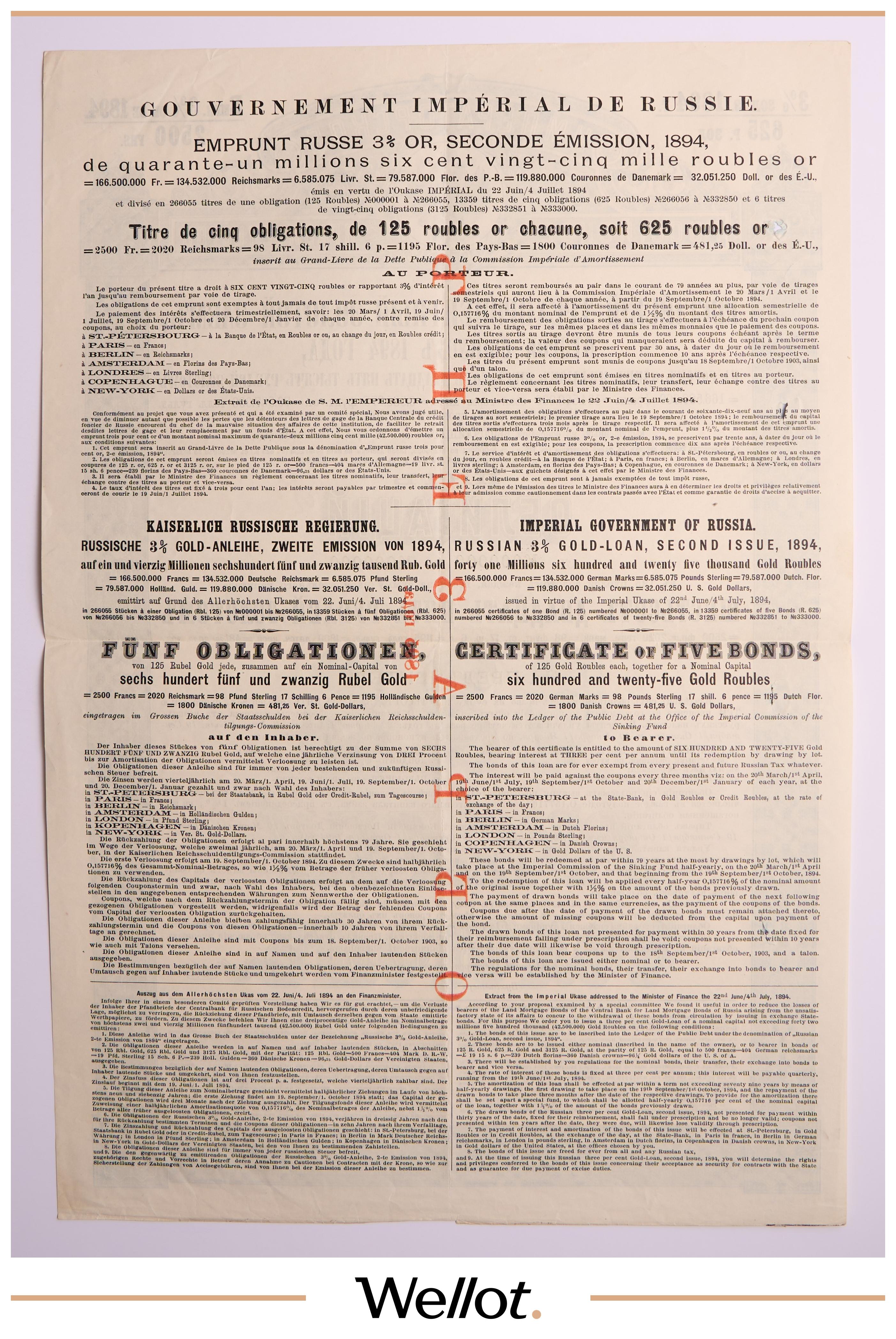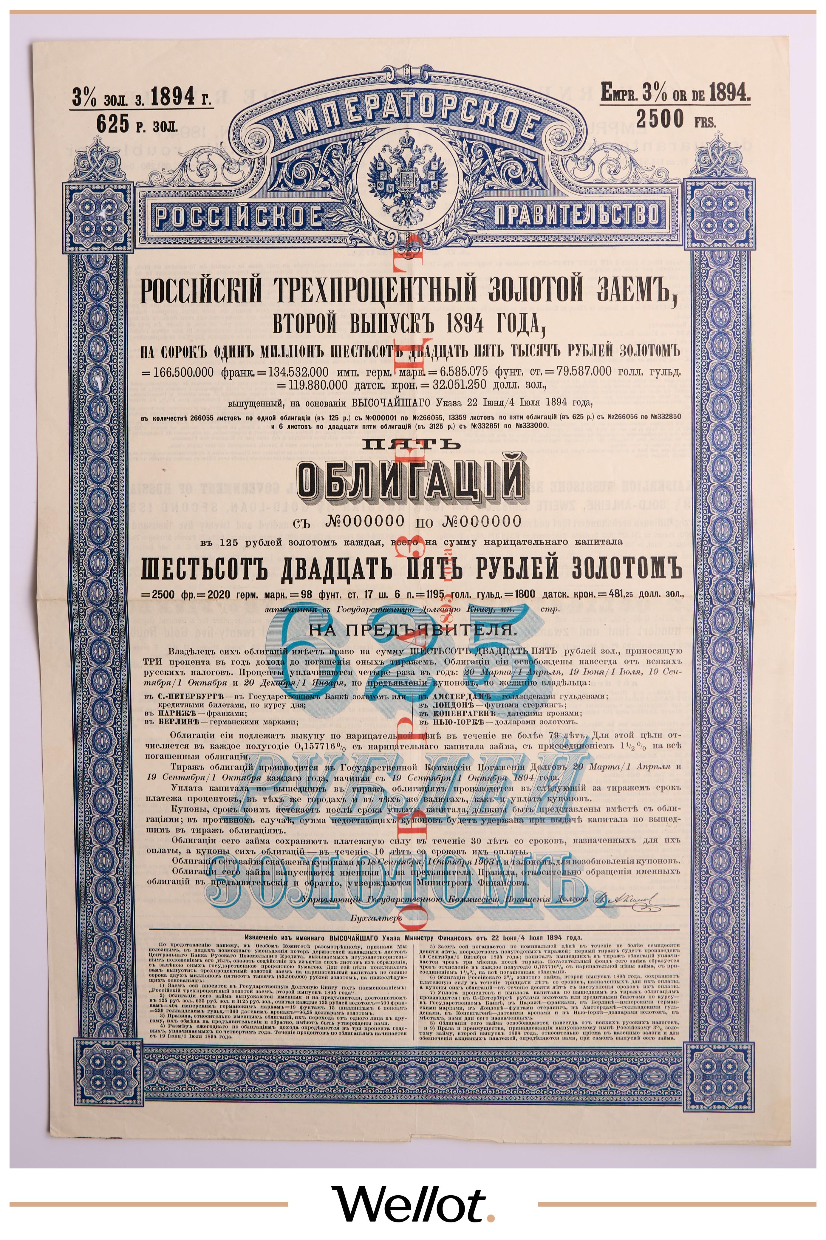 625 Рублей Золотом 1894 Российская Империя 3% Золотой Заем Образец