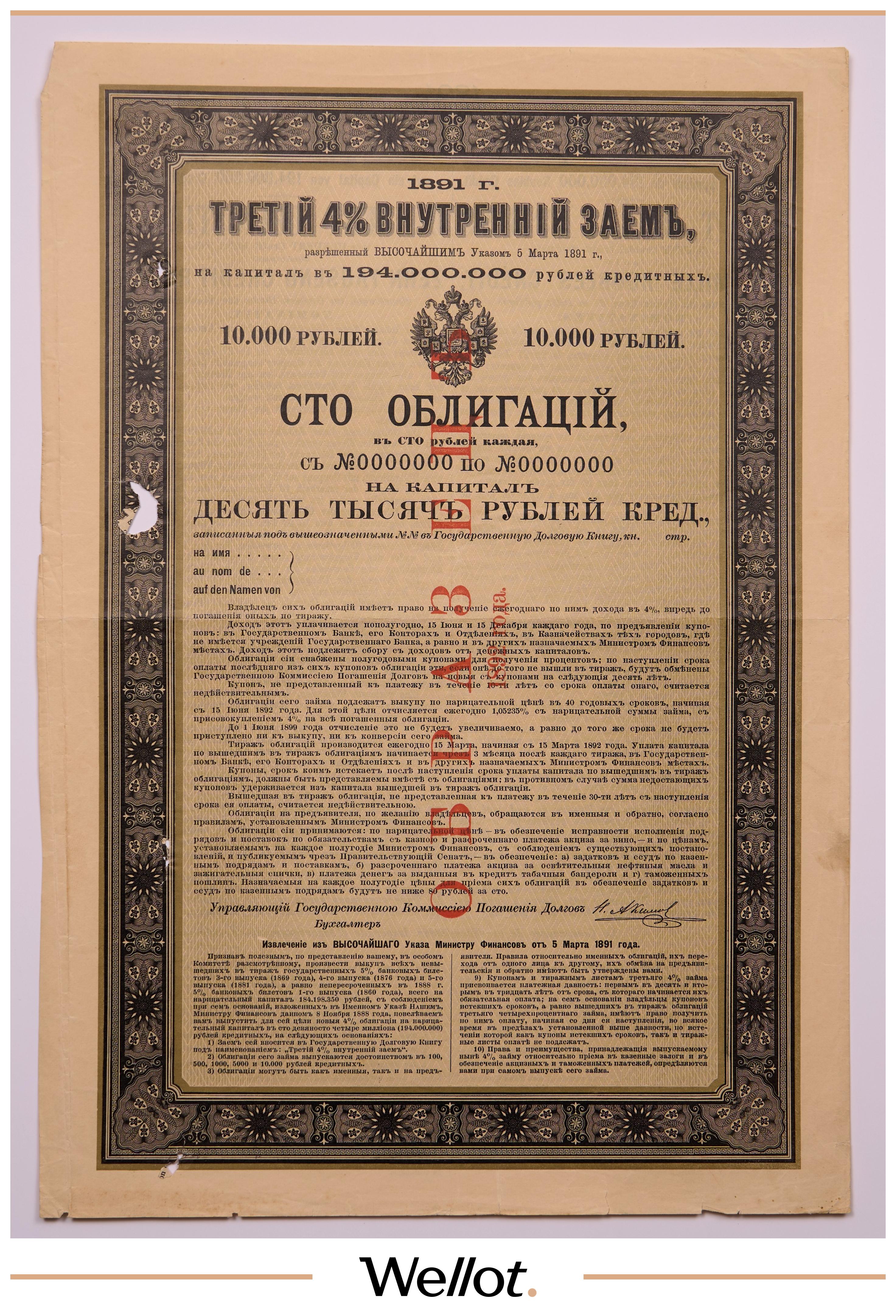 10000 Рублей Кредитных 1891 Российская Империя Третий 4% Внутренний Заем Образец