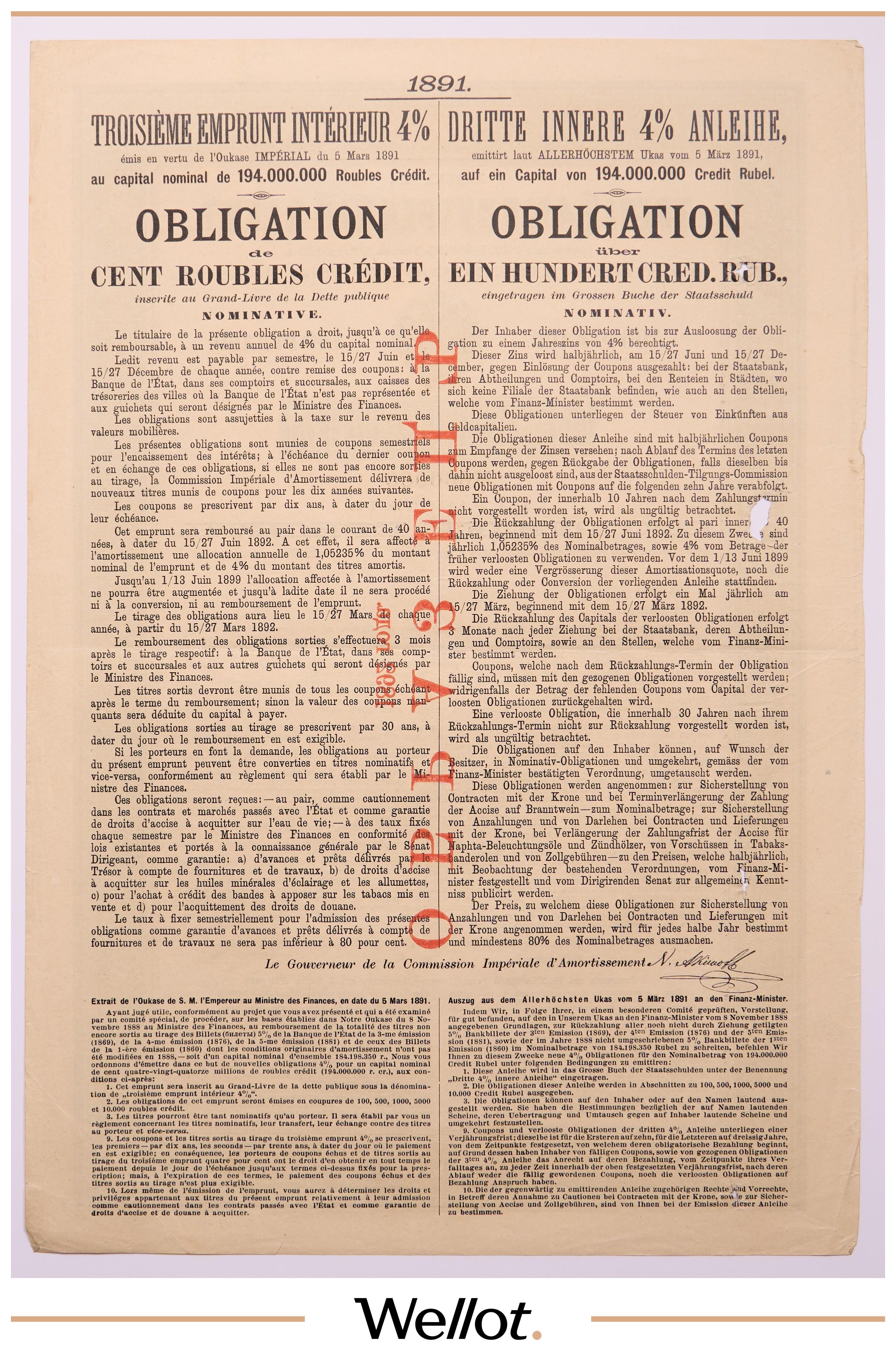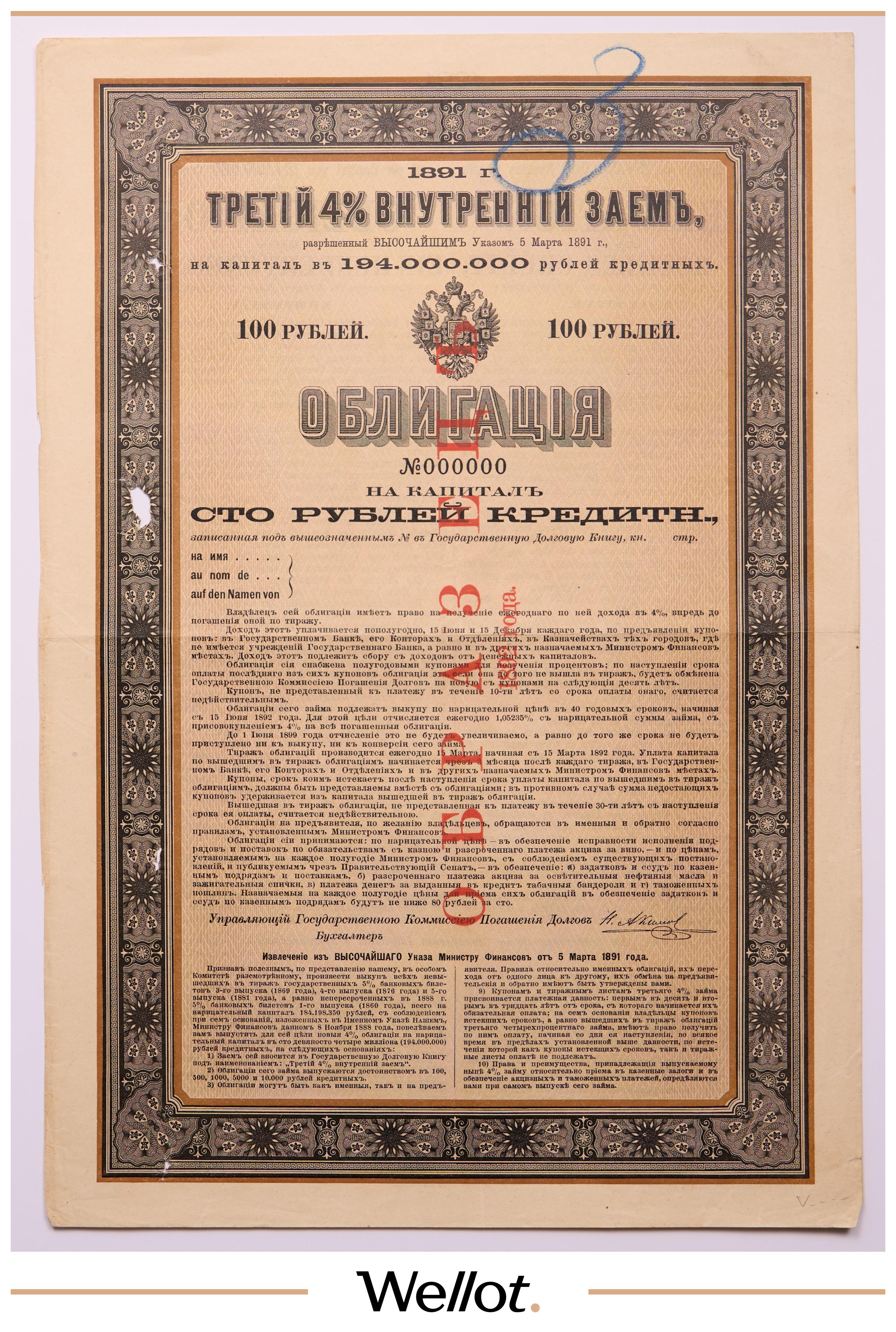 100 Рублей Кредитных 1891 Российская Империя Третий 4% Внутренний Заем Образец