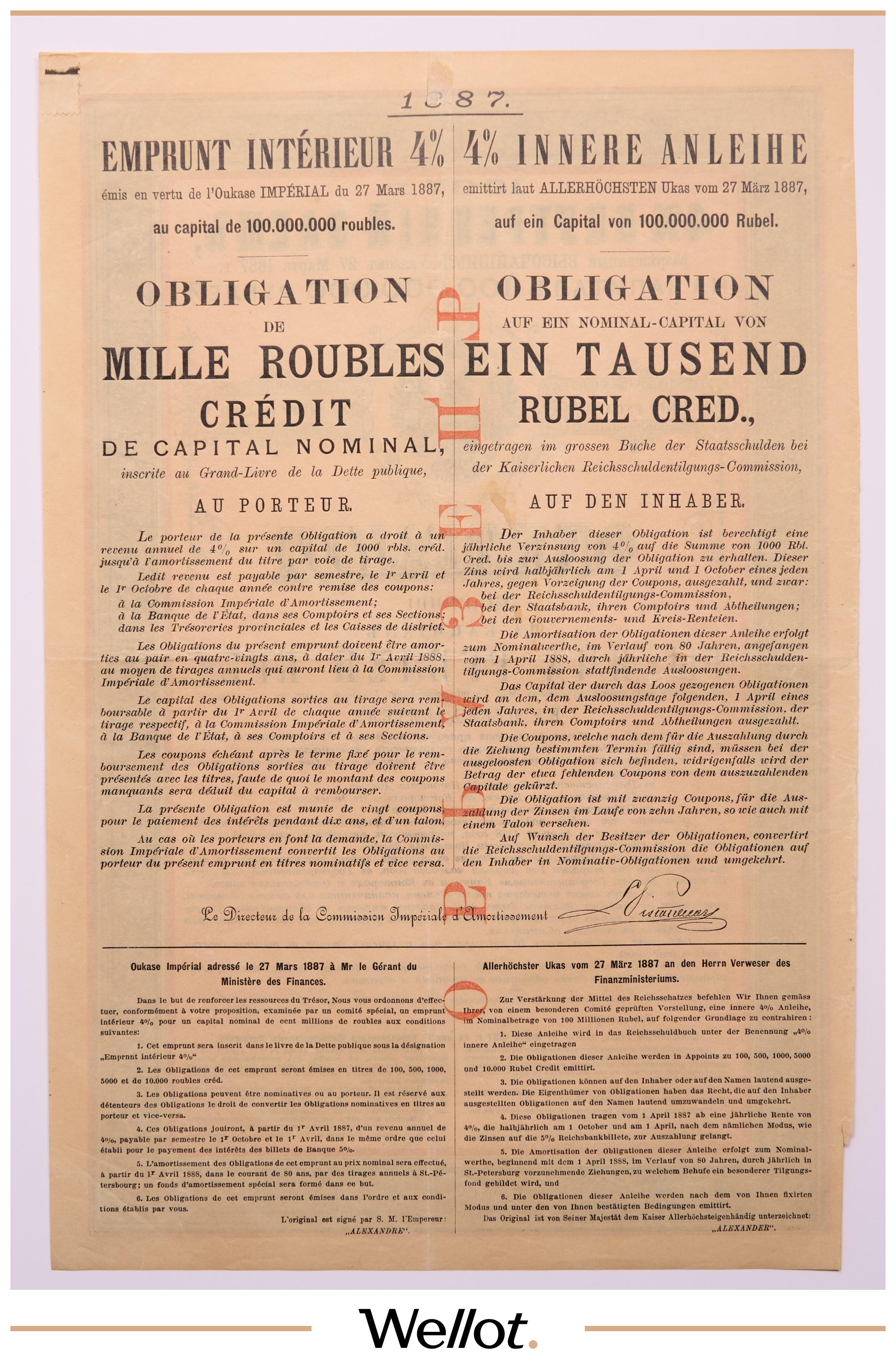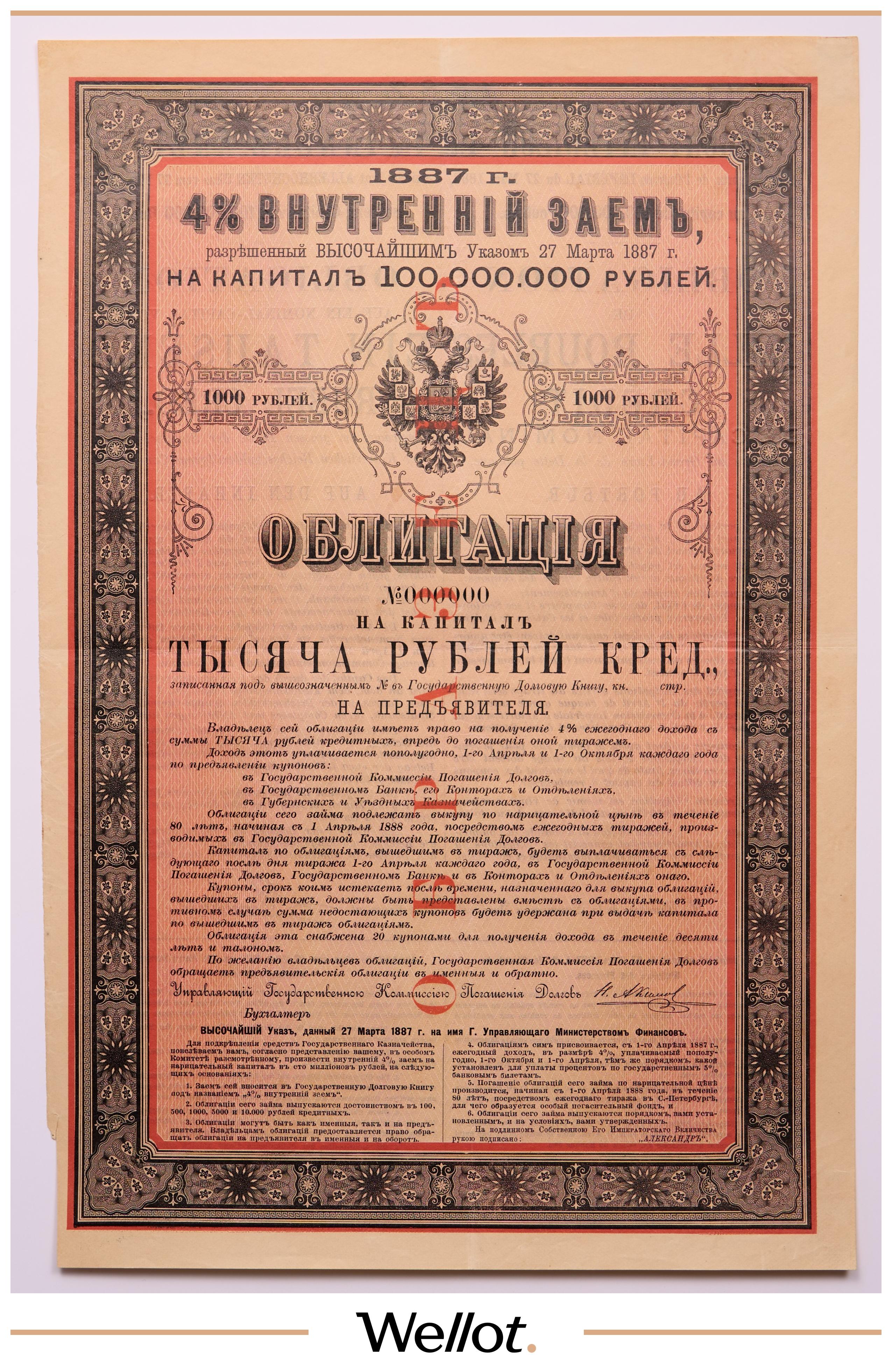 1000 Рублей Кредитных 1887 Российская Империя 4% Внутренний Заем Образец