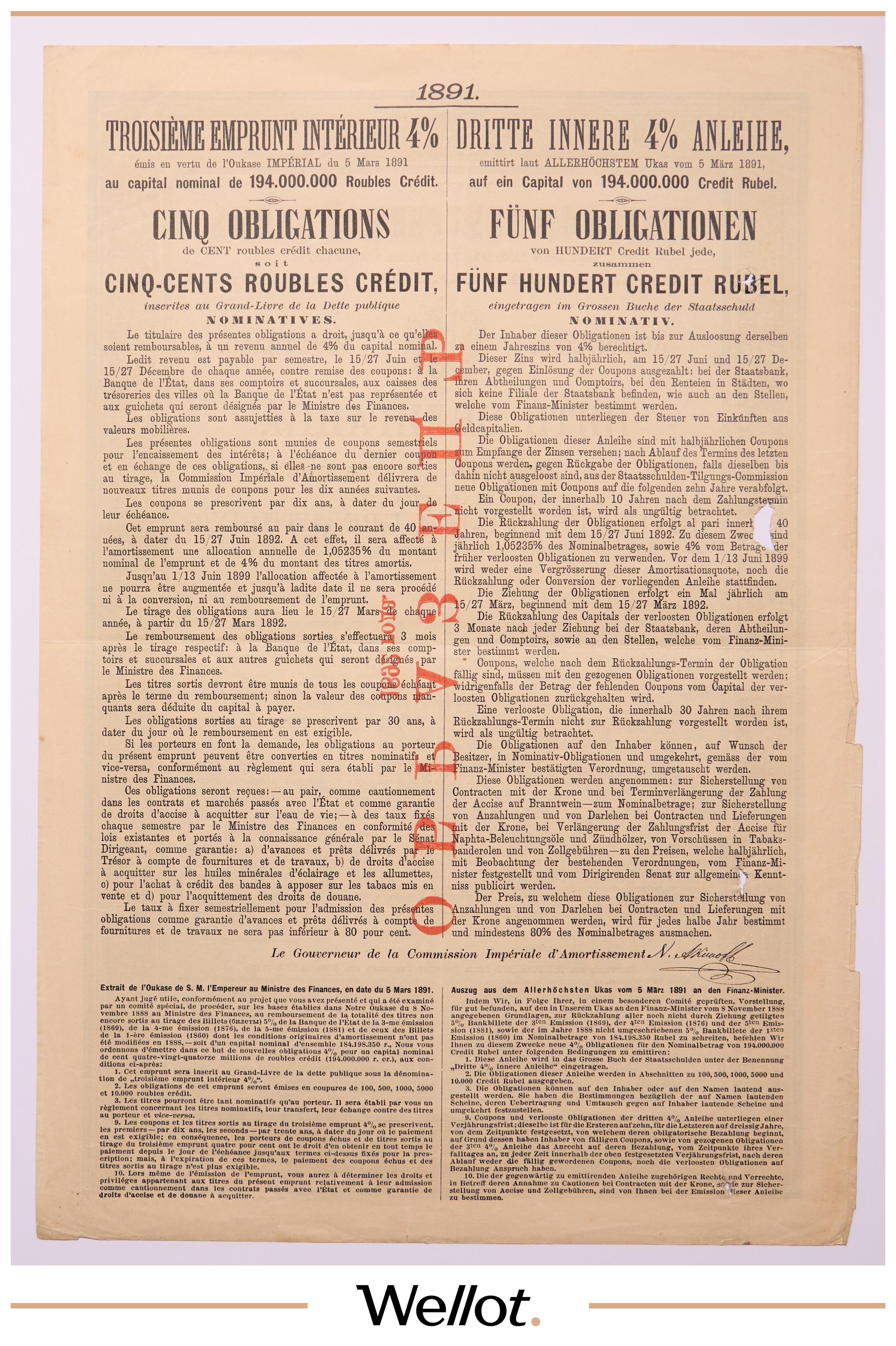 500 Рублей Кредитных 1891 Российская Империя Третий 4% Внутренний Заем Образец