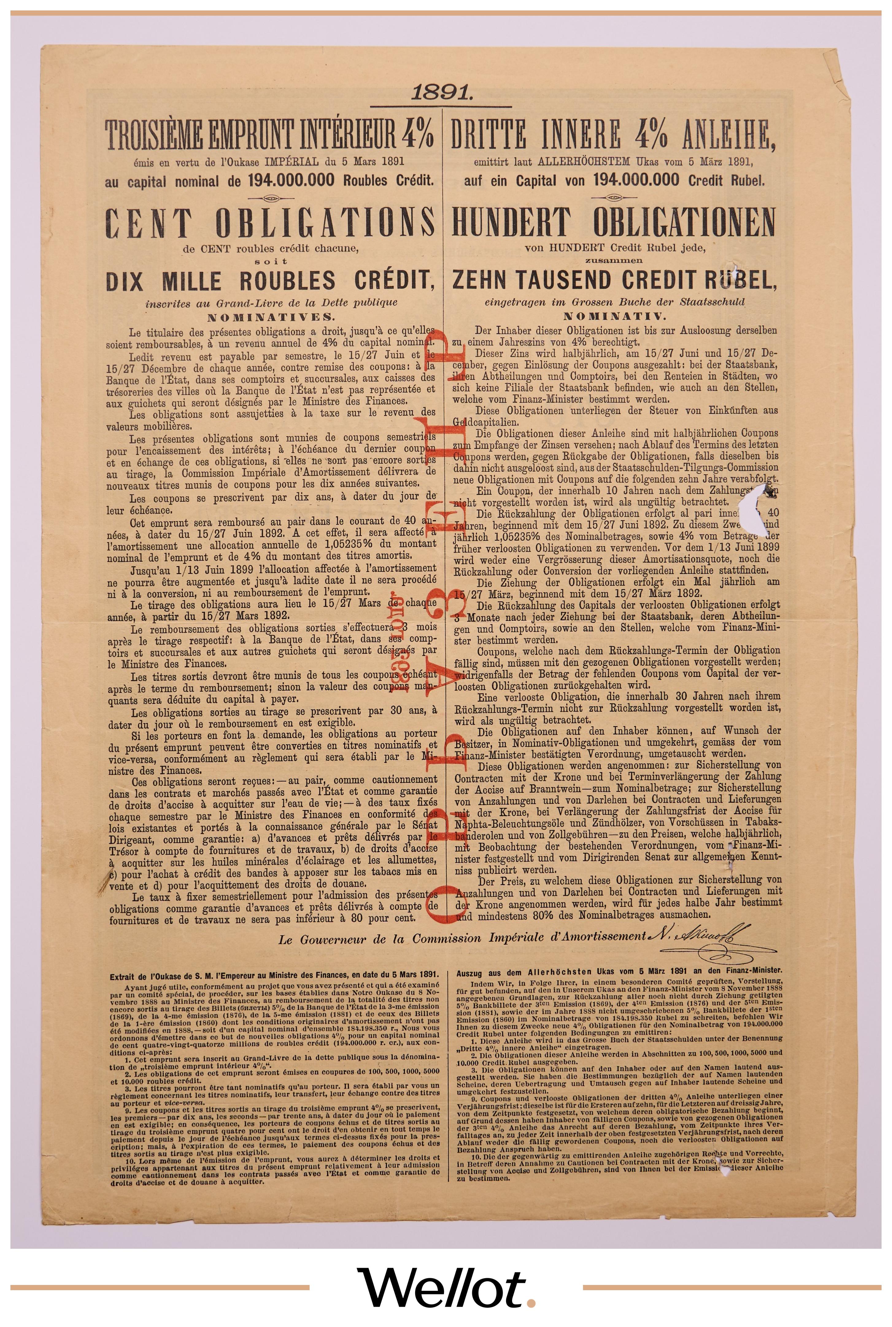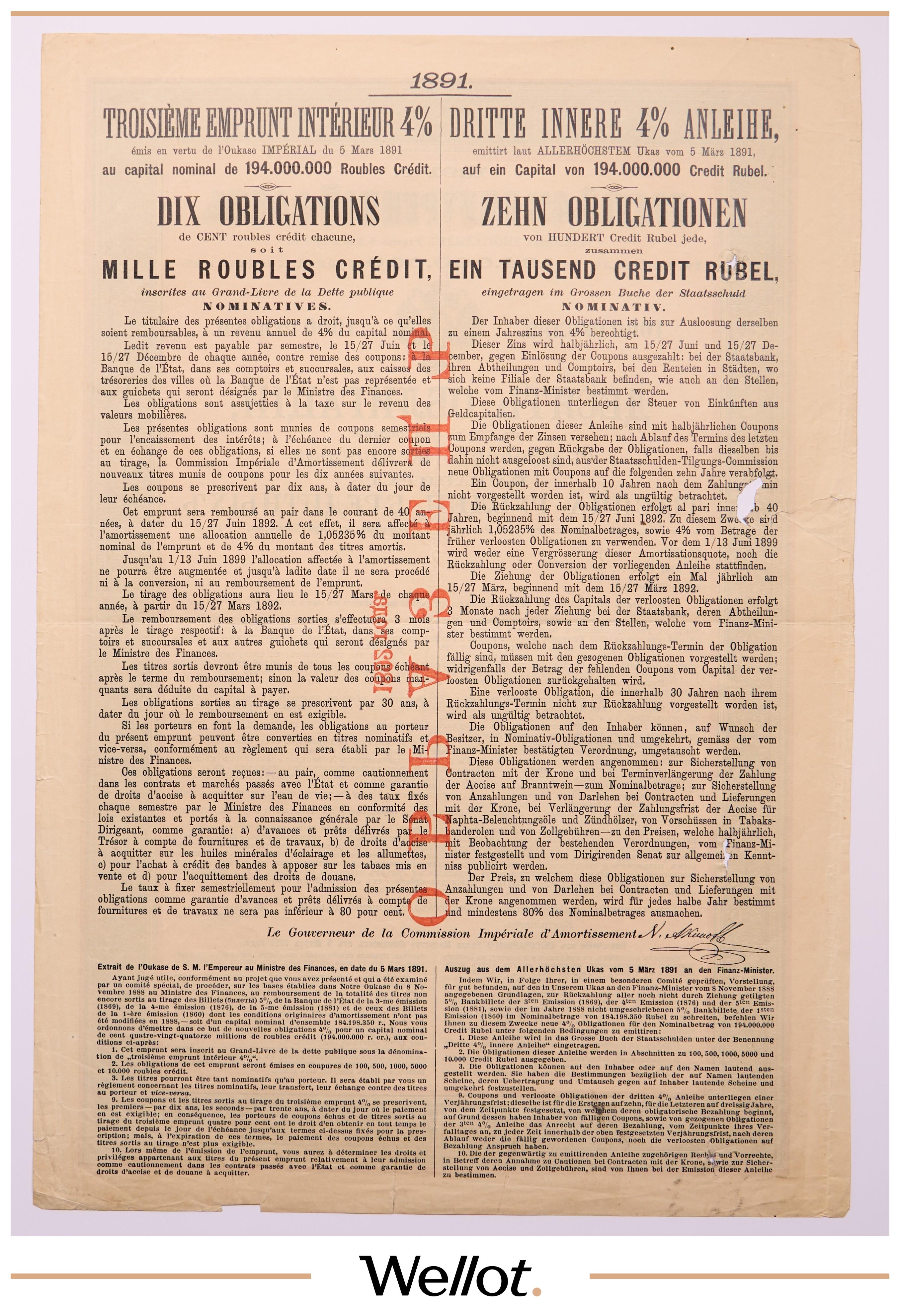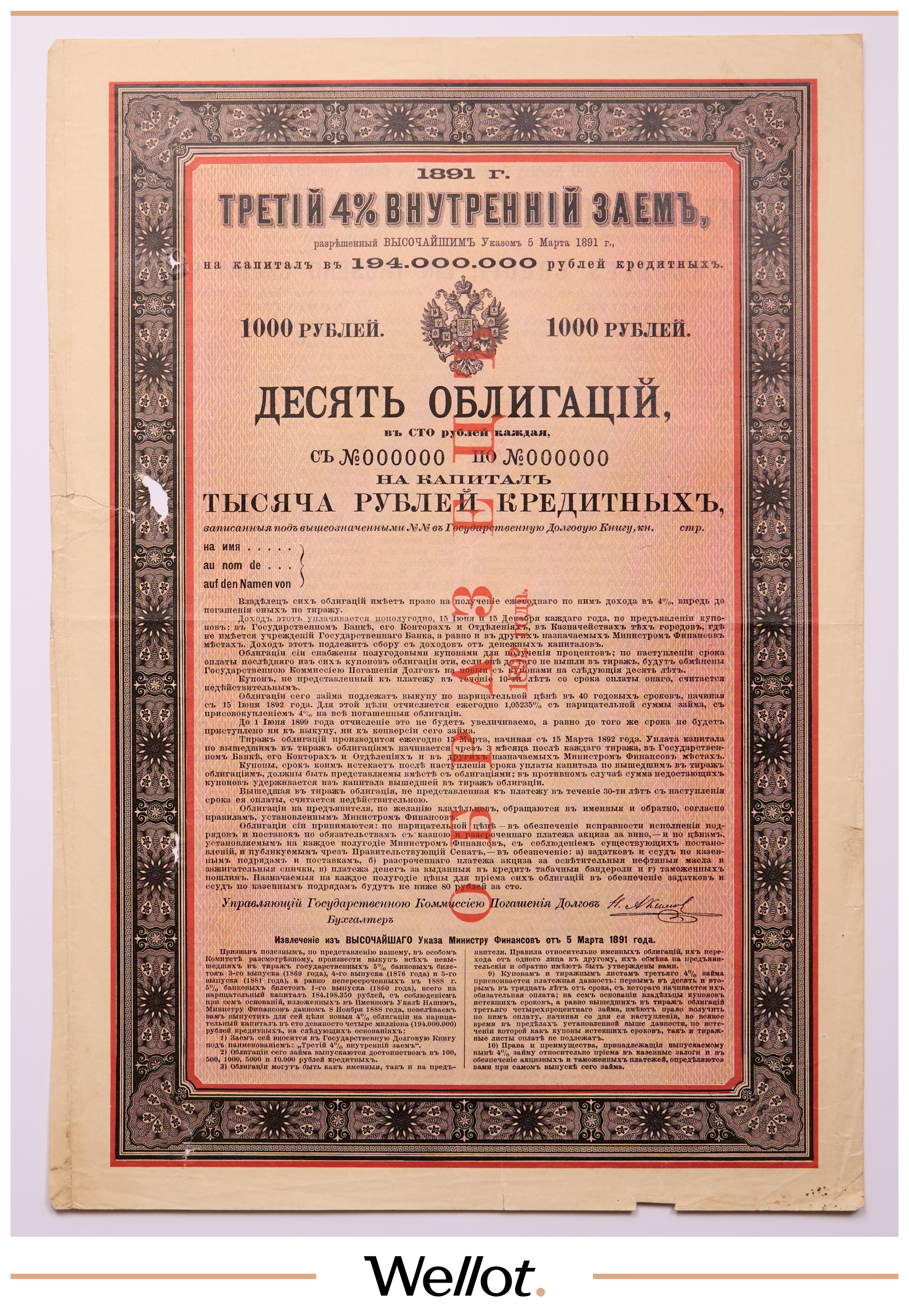 1000 Рублей Кредитных 1891 Российская Империя Третий 4% Внутренний Заем Образец